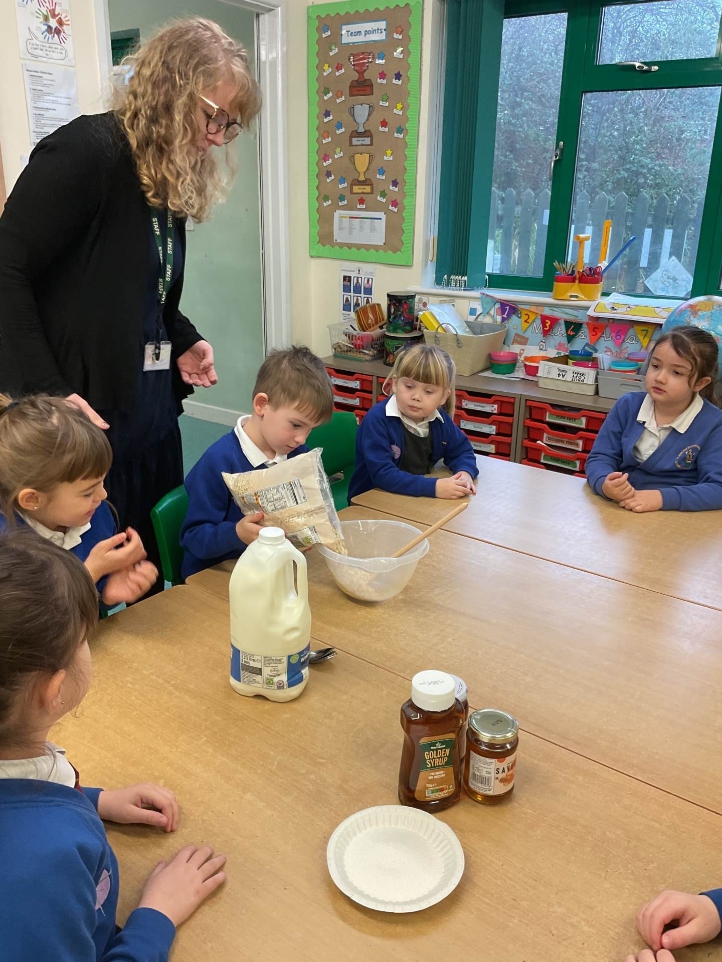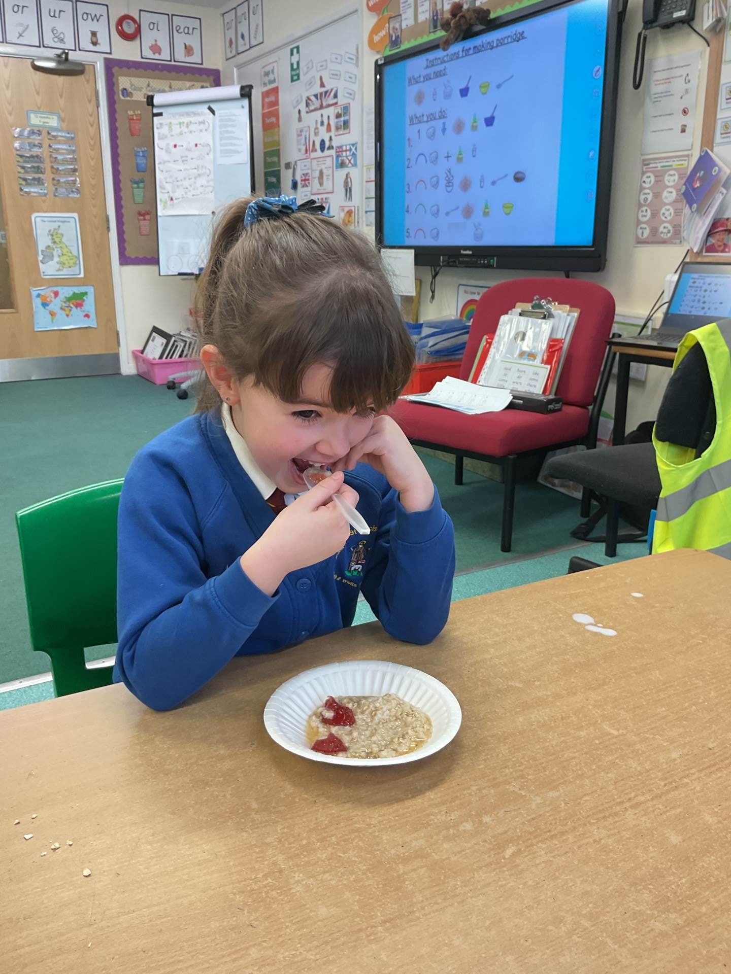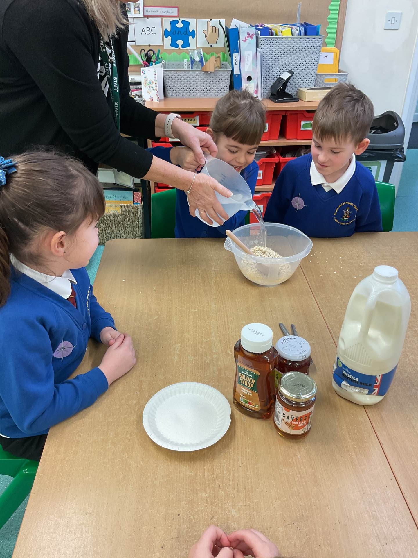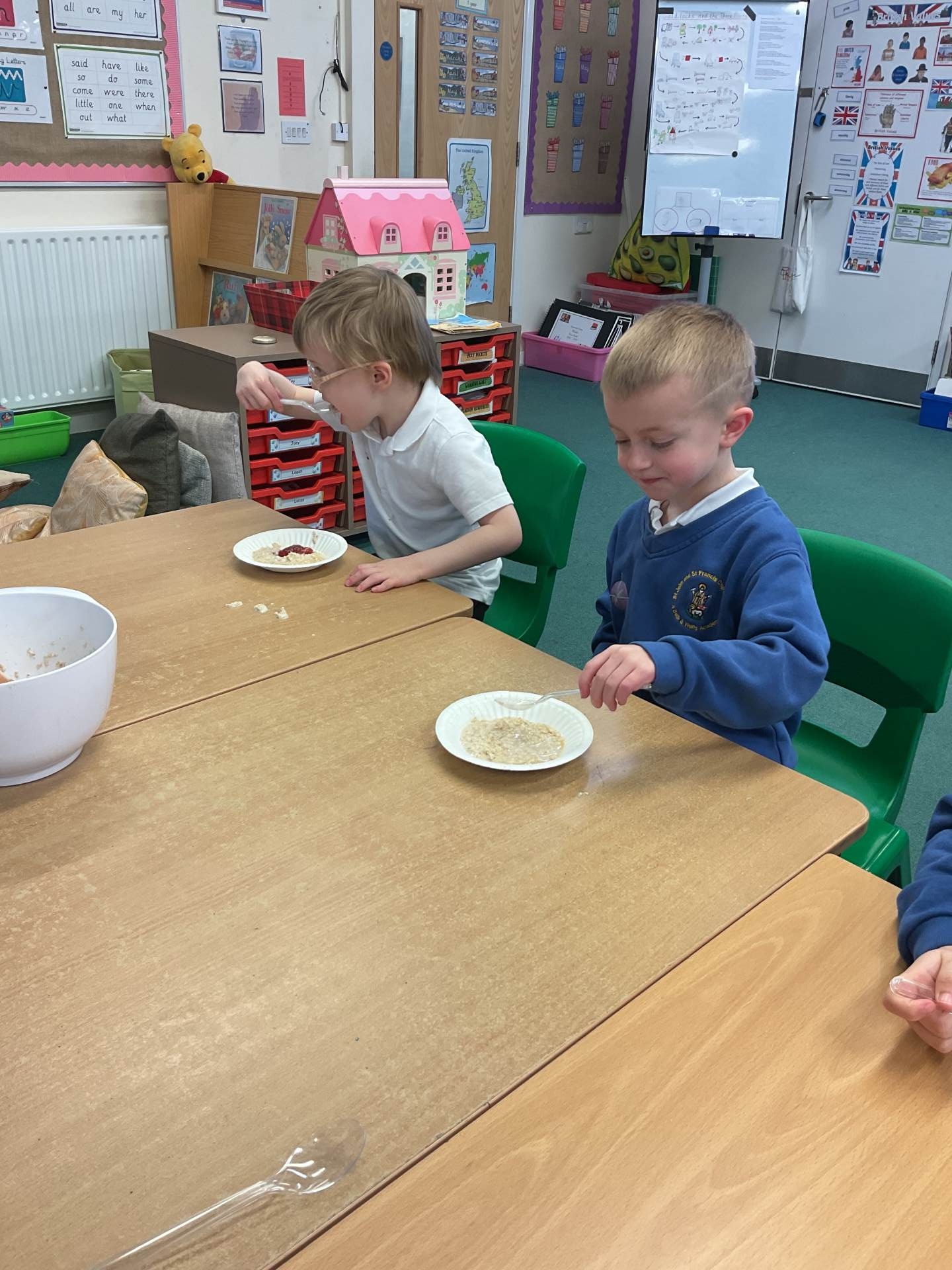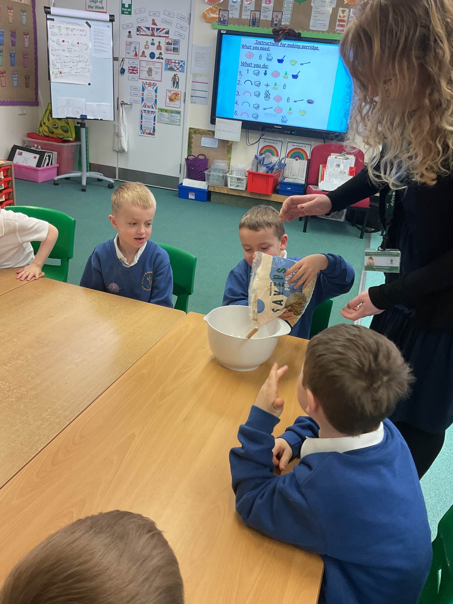 Today Sparrow Class made porridge! The children were able to follow and explain the instruction map step by step. They read it through with a partner before retelling to the adults. We discussed the layout of the instructions and key words, (or time connectives), that were needed to start each sentence.