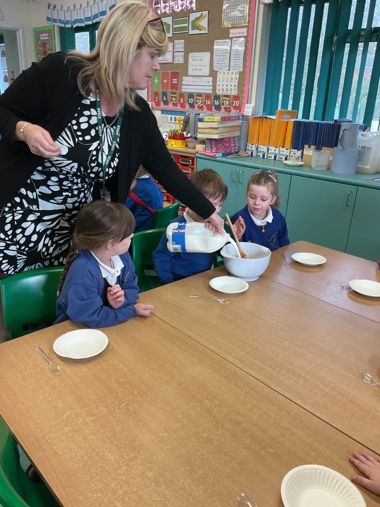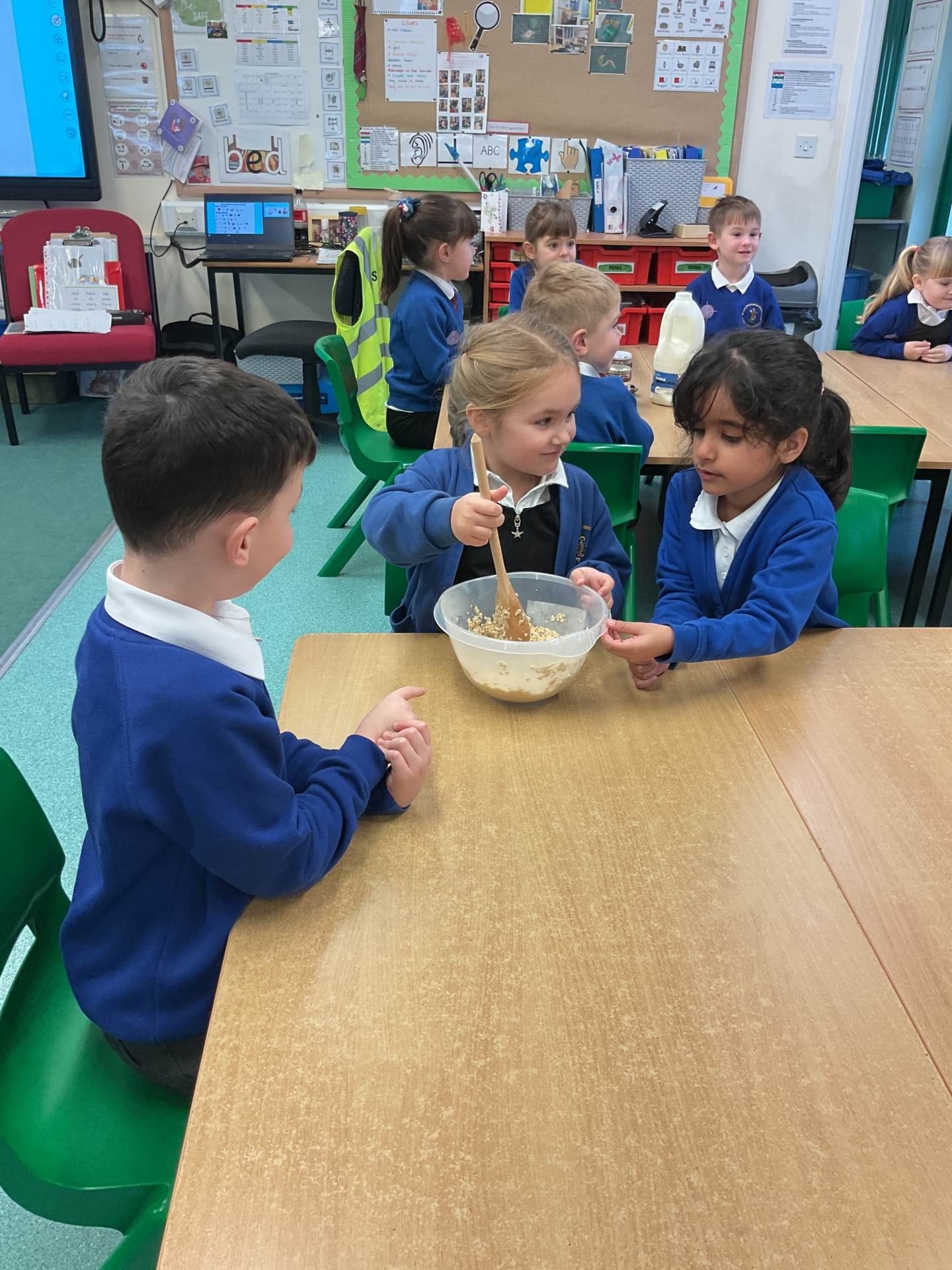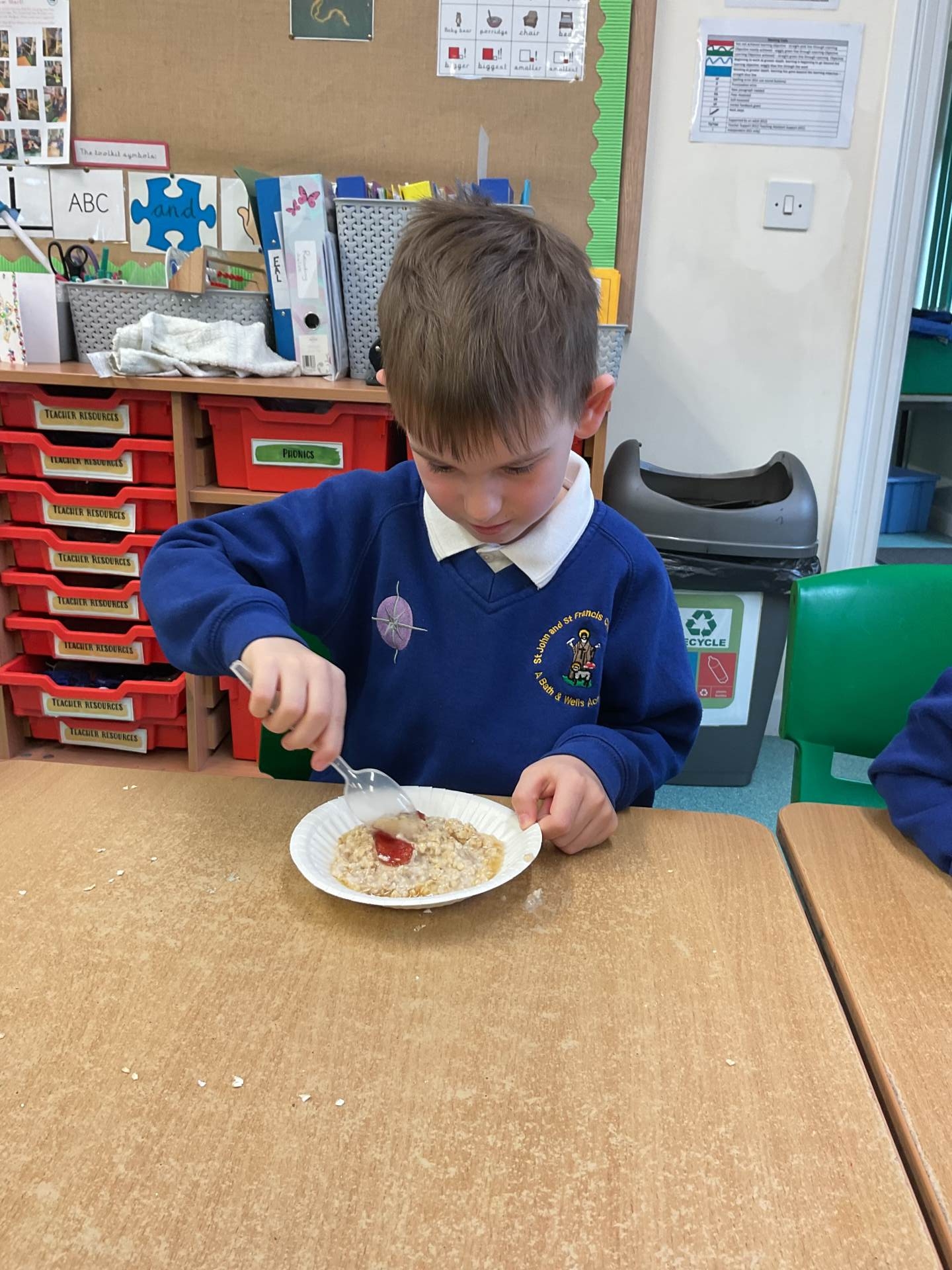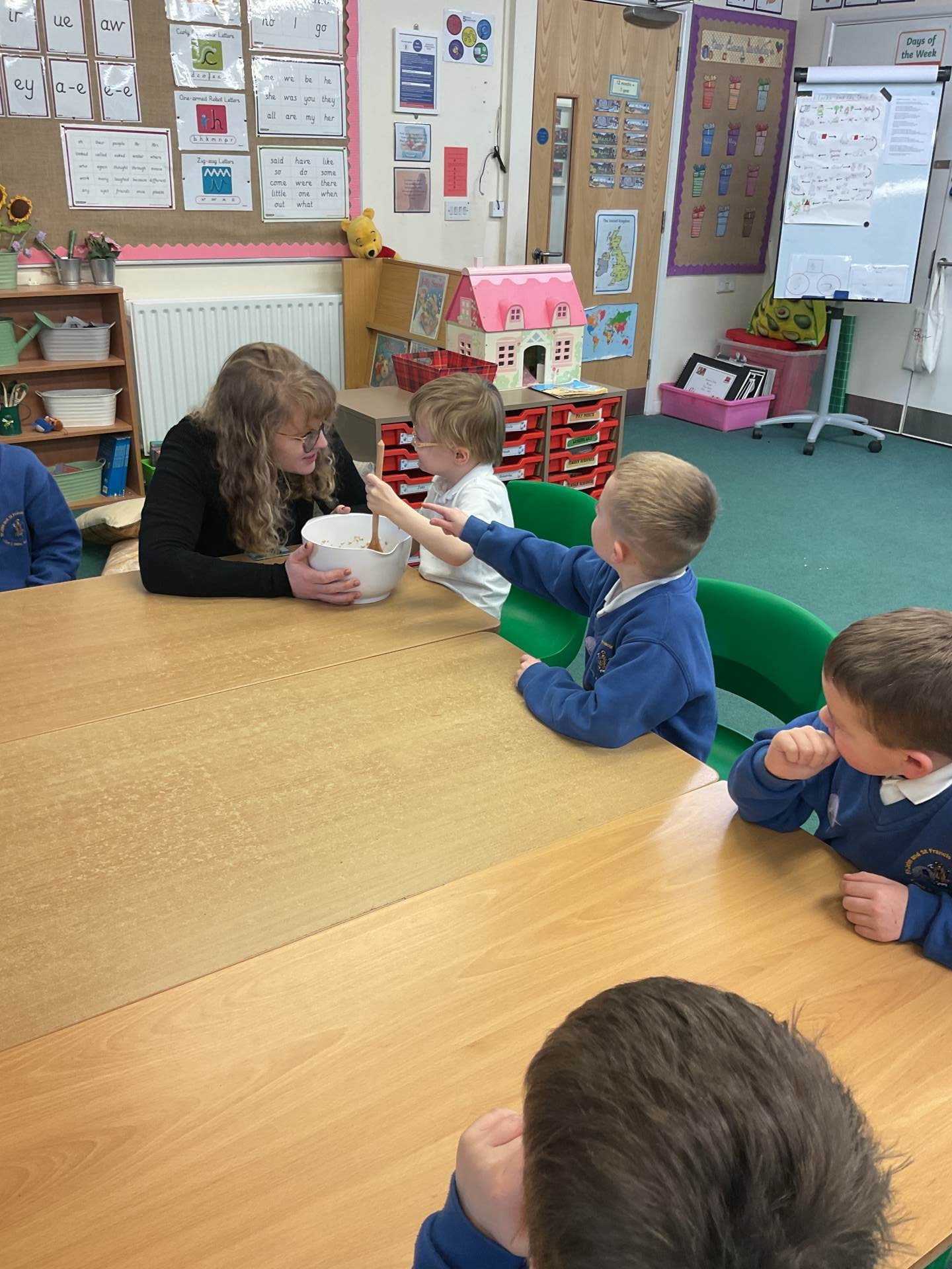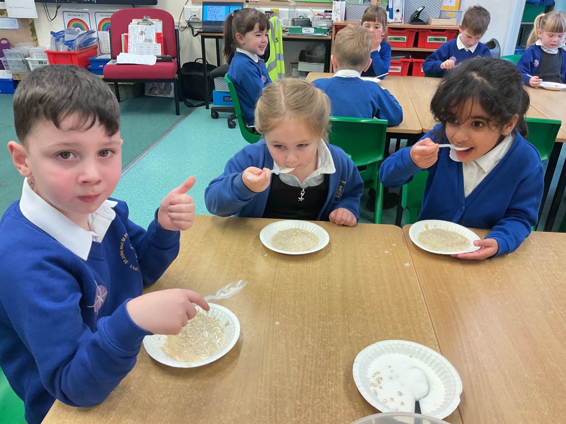 Today Sparrow Class made porridge! The children were able to follow and explain the instruction map step by step. They read it through with a partner before retelling to the adults. We discussed the layout of the instructions and key words, (or time connectives), that were needed to start each sentence.