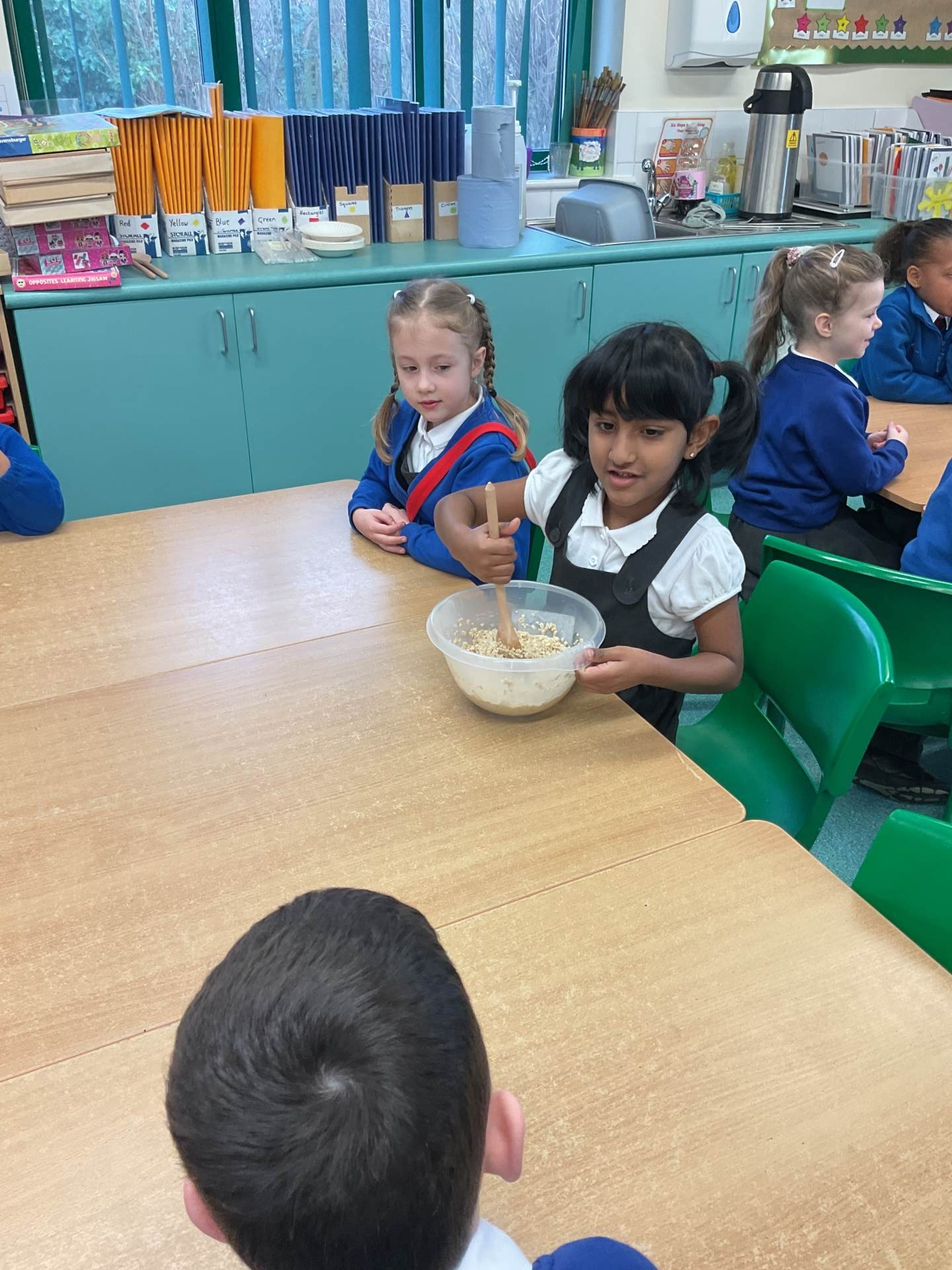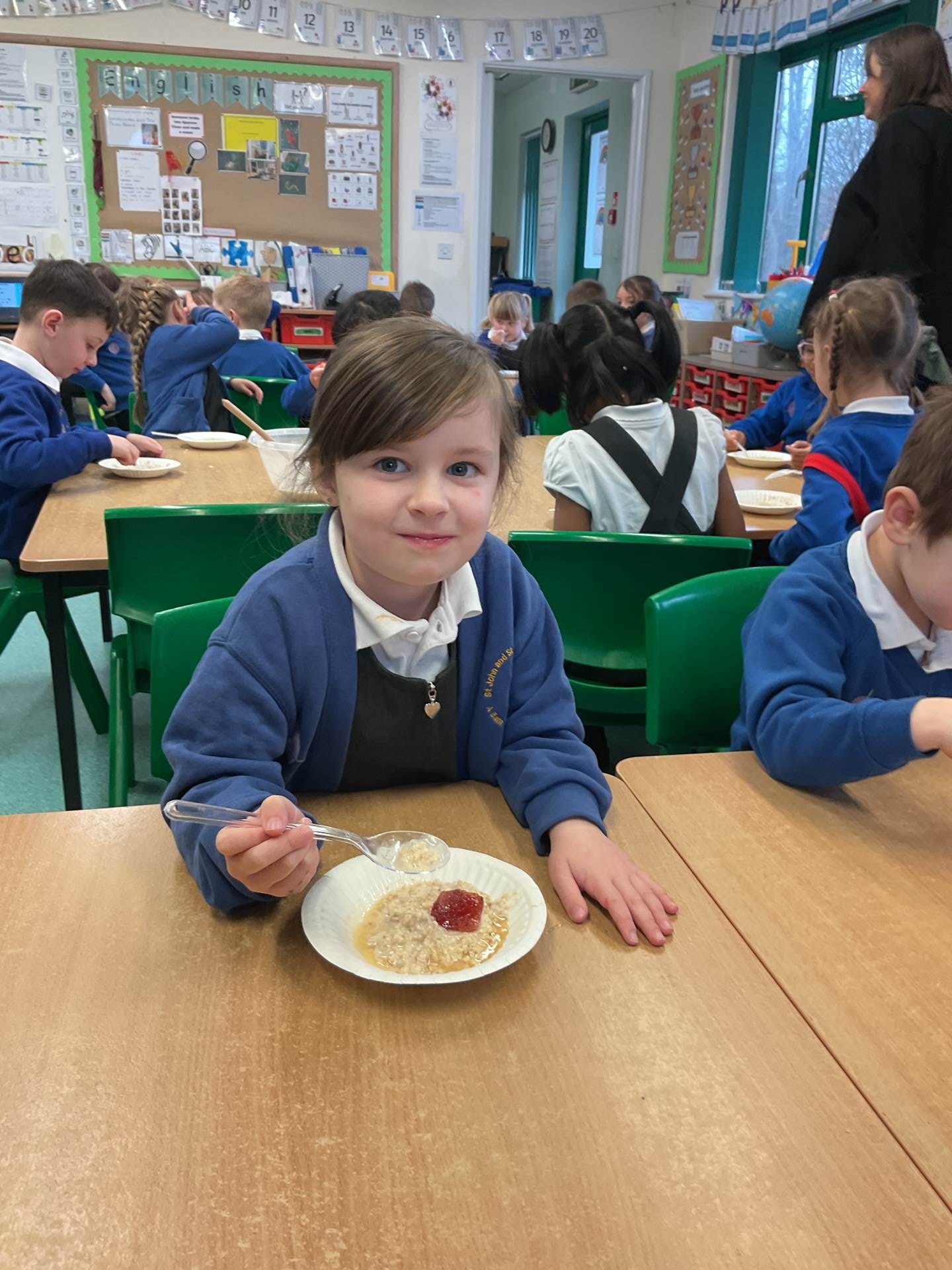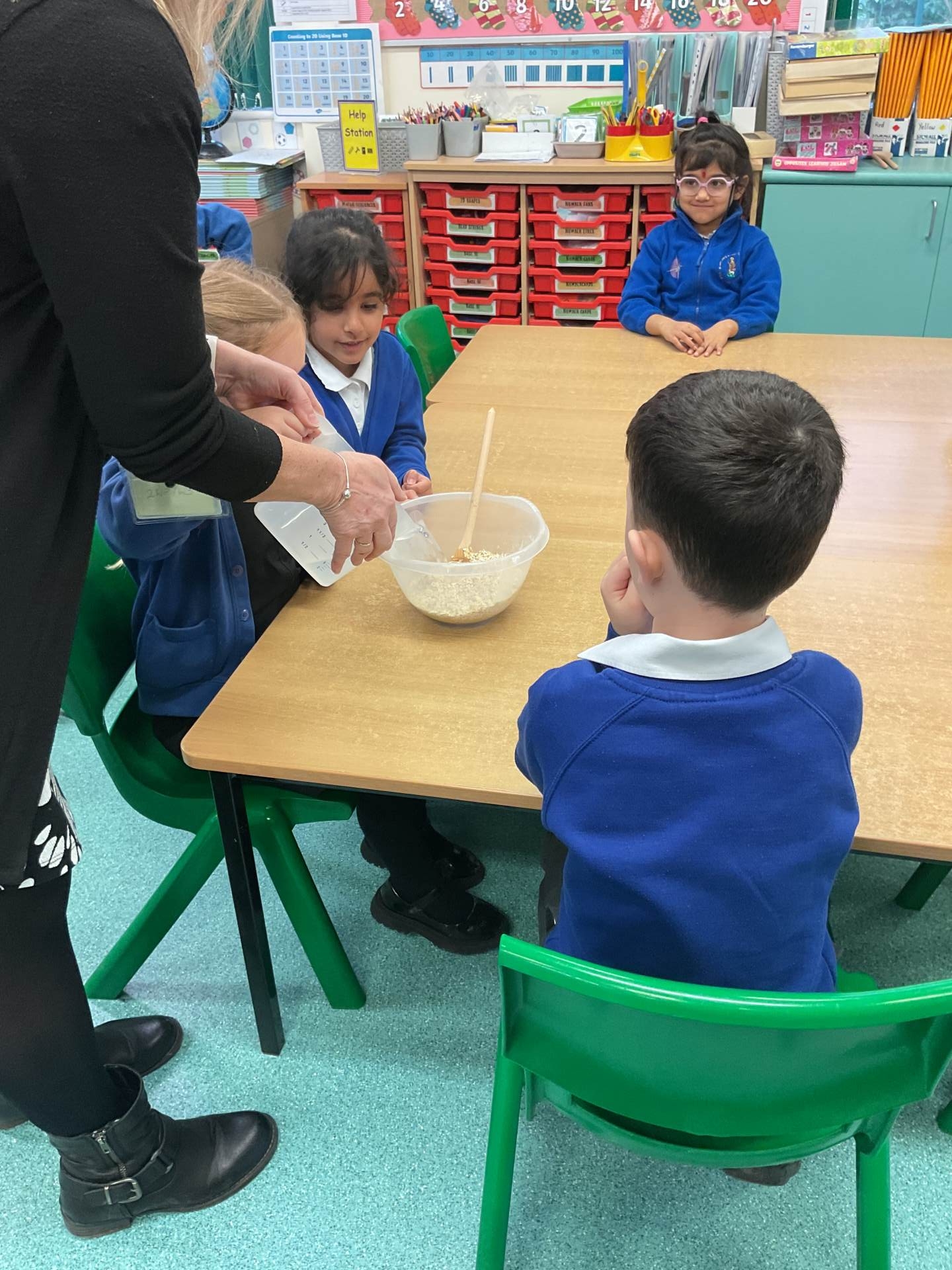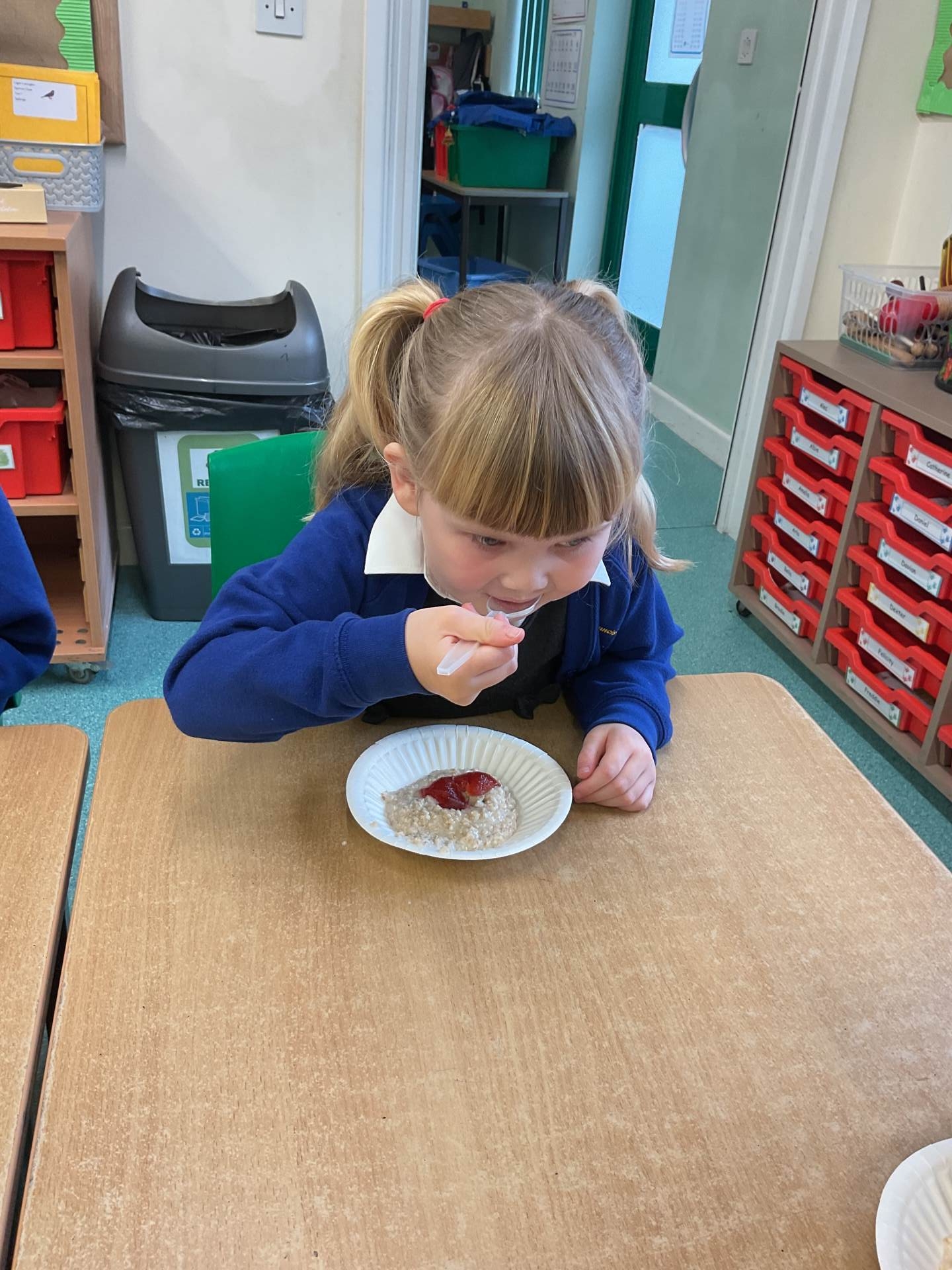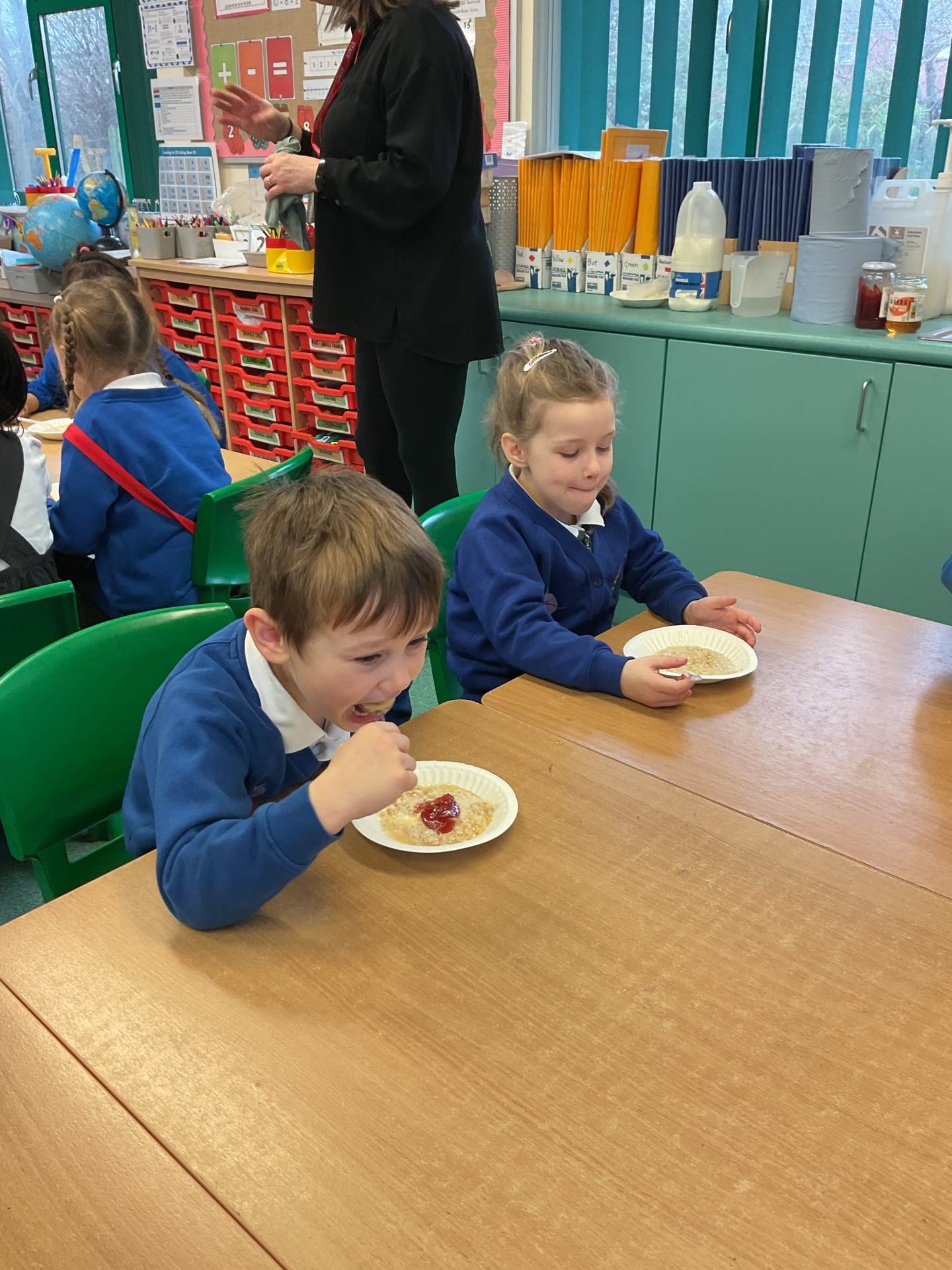 Today Sparrow Class made porridge! The children were able to follow and explain the instruction map step by step. They read it through with a partner before retelling to the adults. We discussed the layout of the instructions and key words, (or time connectives), that were needed to start each sentence.