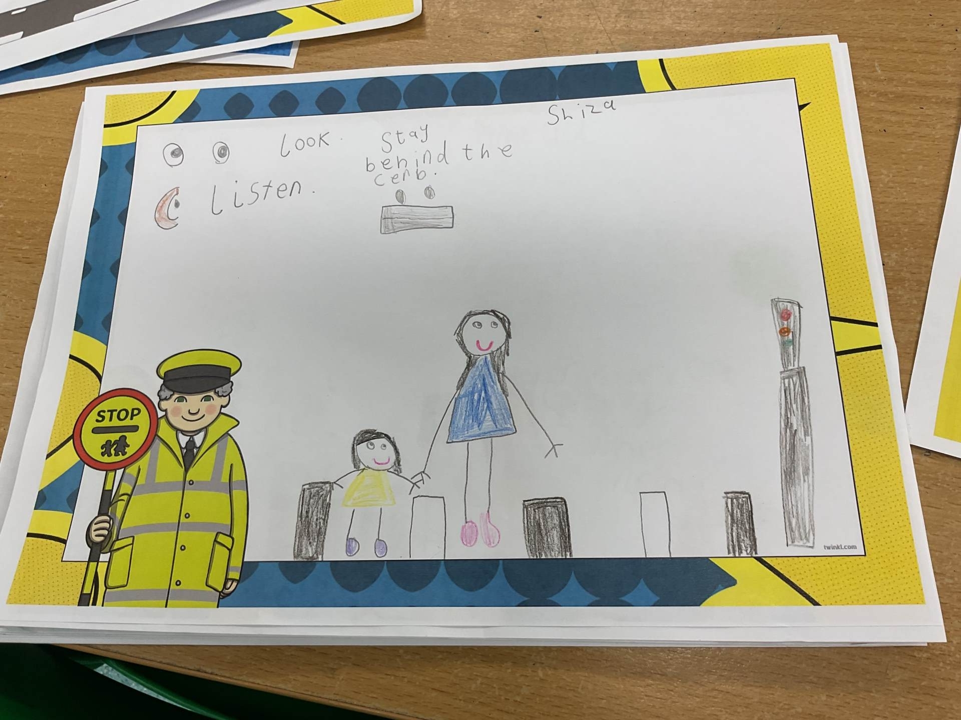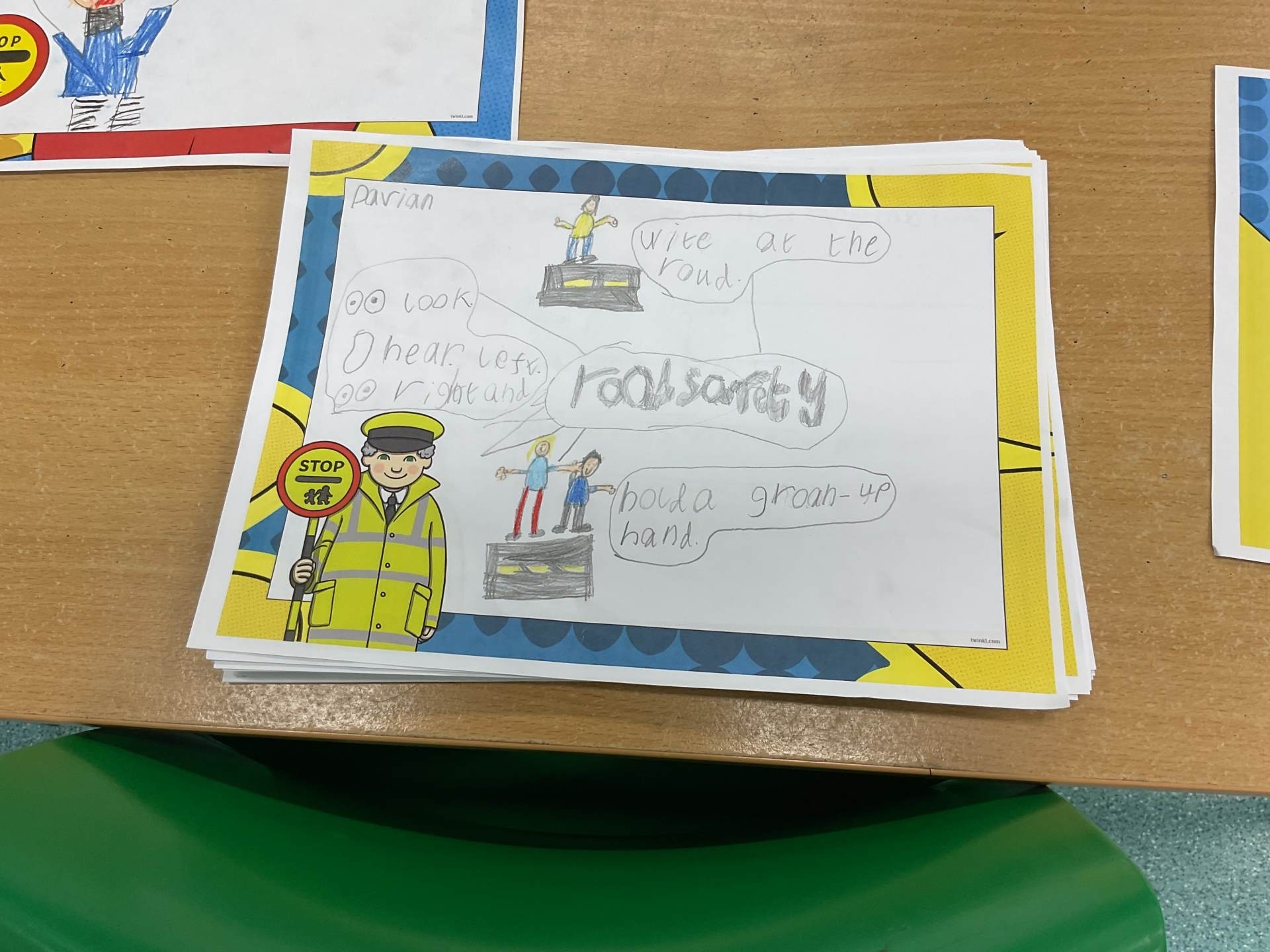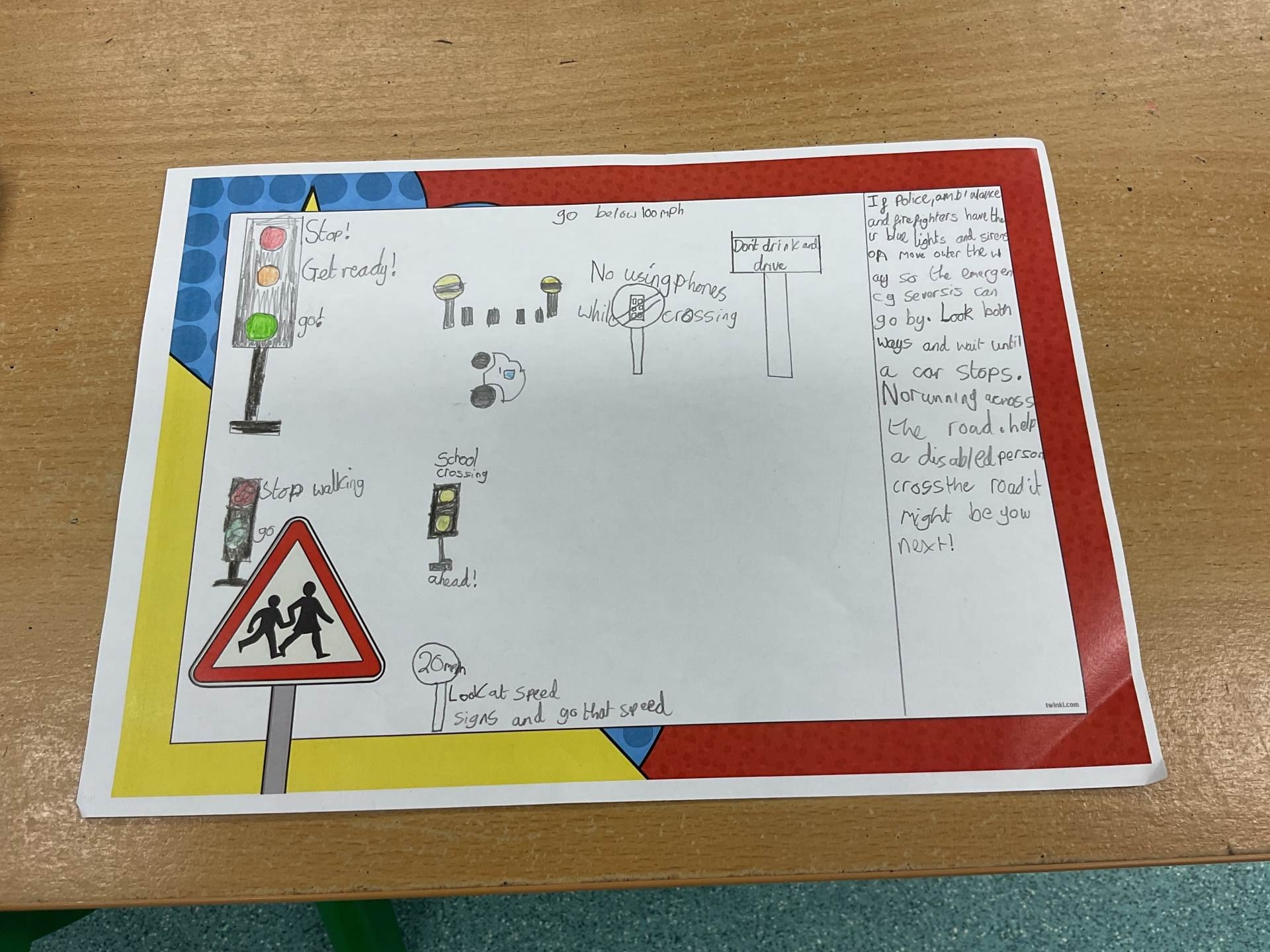 We have had another very busy active day in Health and Sports week. Today we learnt about the importance of keeping ourselves safe when using the roads. We took on the role of pedestrians, drivers and even the crossing patrol person. We then designed our own road safety posters.