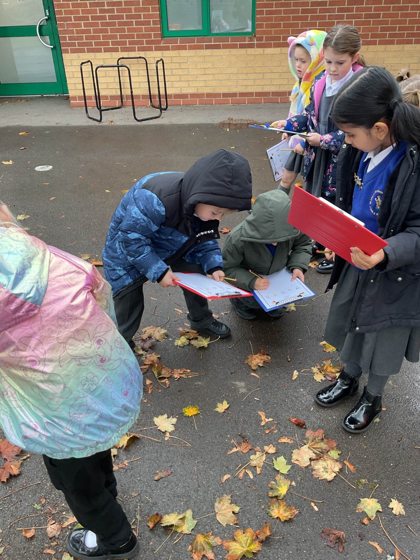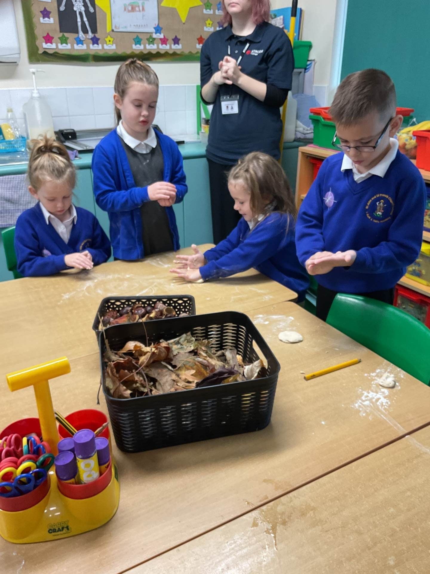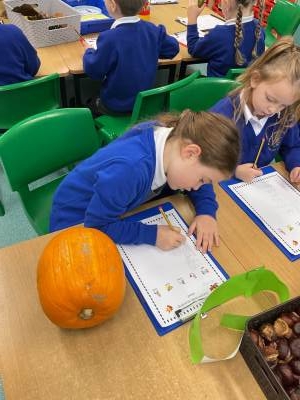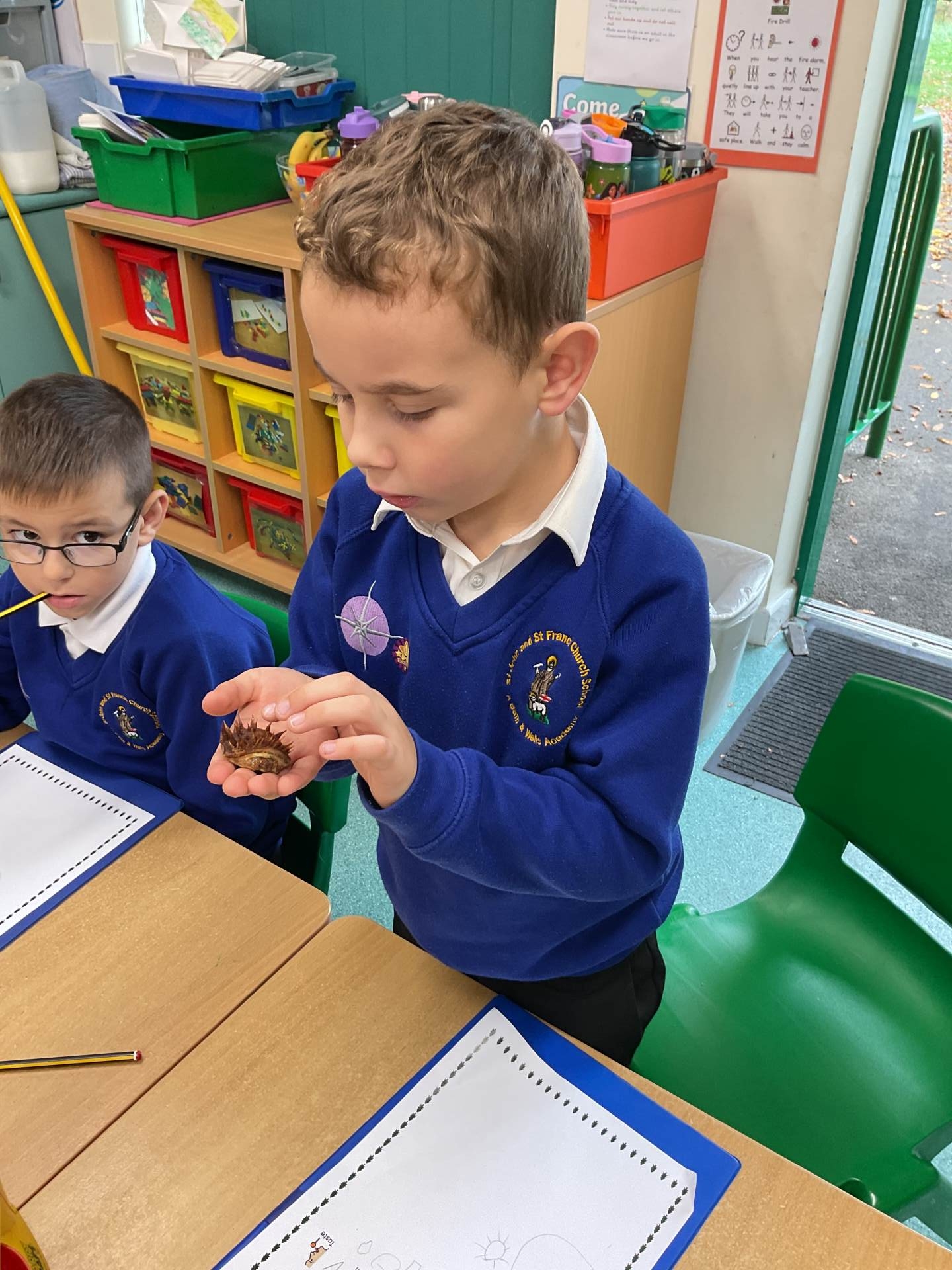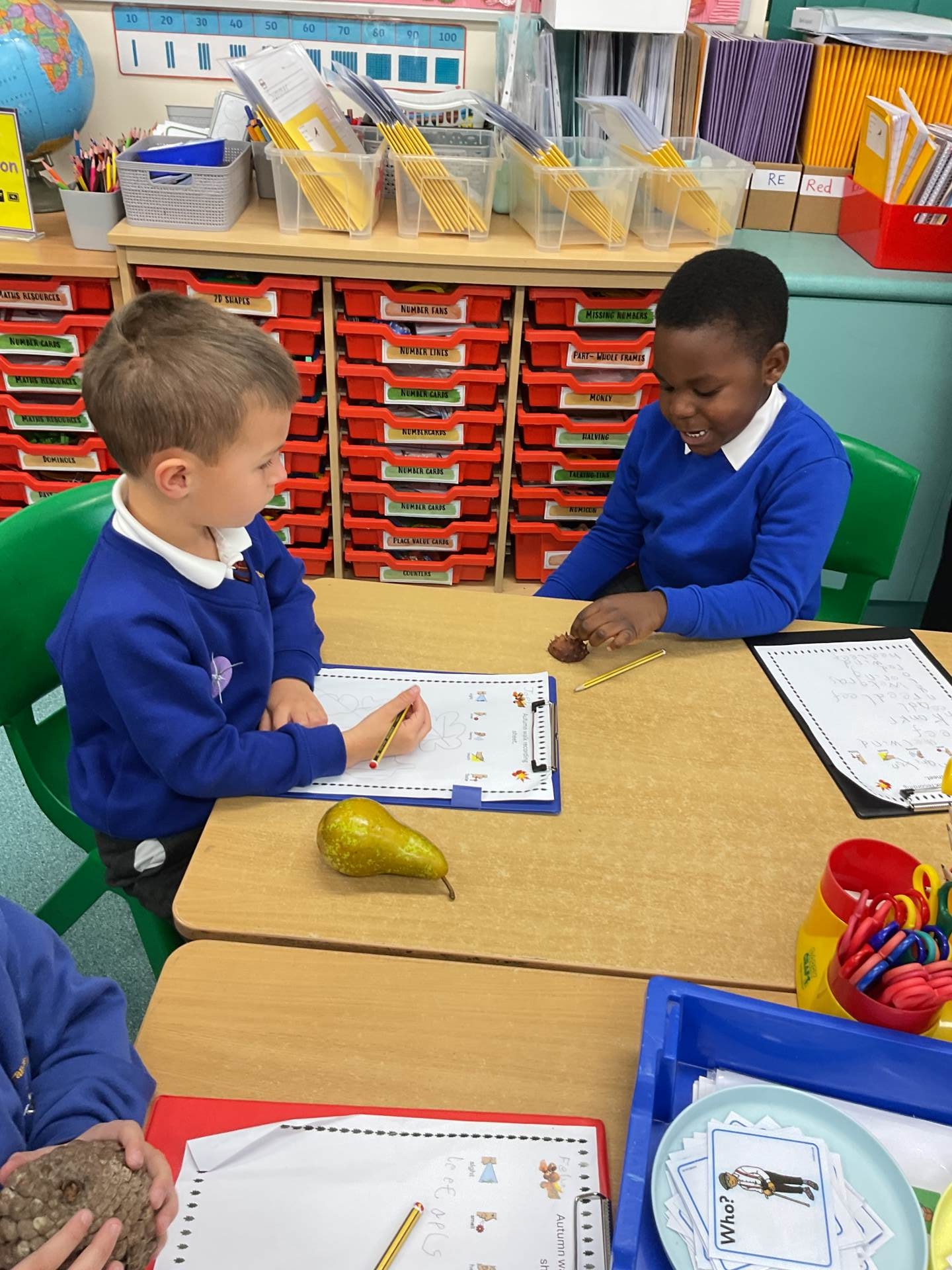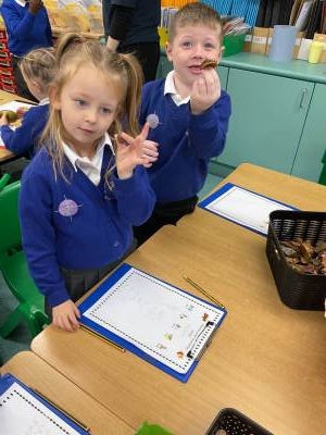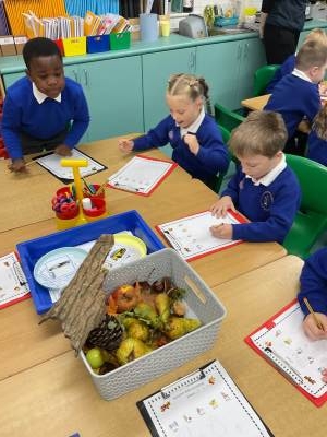 Today we went on an Autumn senses walk around the school grounds to look for signs of Autumn using our 5 senses. We discussed what these senses were and the types of things that we thought we might observe. We took collection baskets and magnifying glasses, so we could have a closer look at some of our findings and brought some of them back into the classroom to examine further. We talked about how taste was one of our 5 senses, but we were not allowed to eat anything that we found during our walk. When we returned to the classroom, we had a good look at what we had discovered and thought of some adjectives to help describe our collections. Mrs Edwards then shared some Autumn poetry with us.