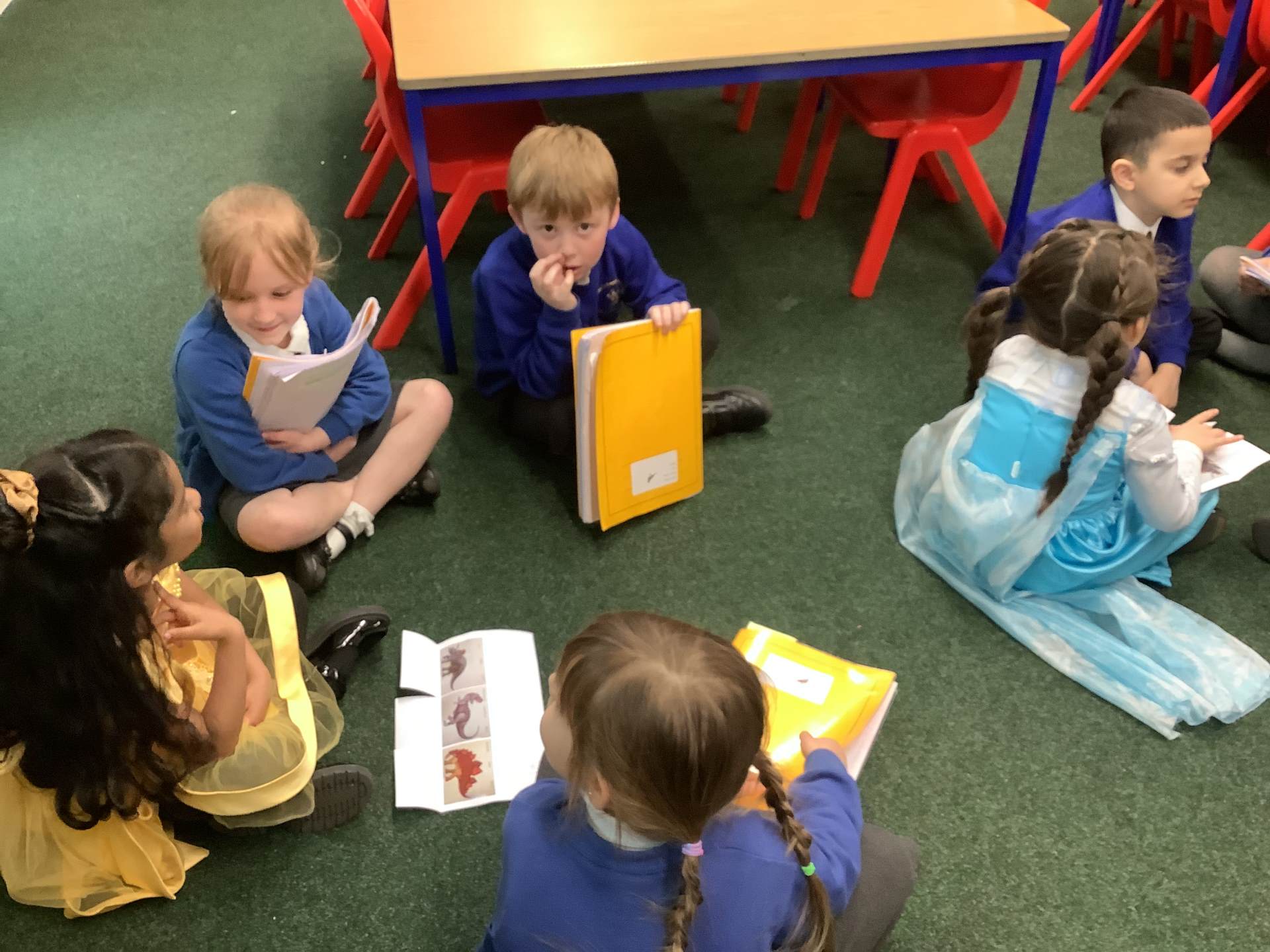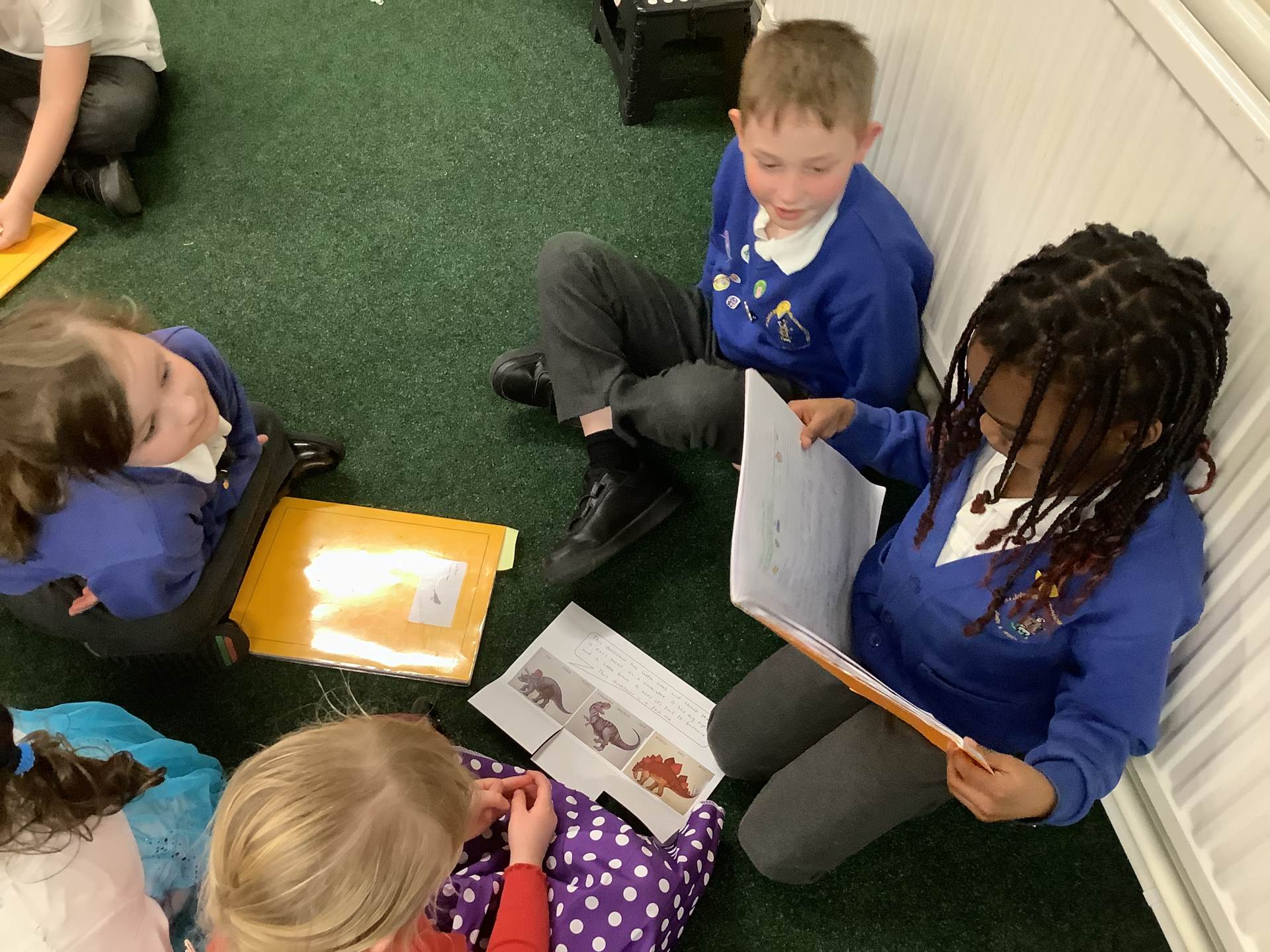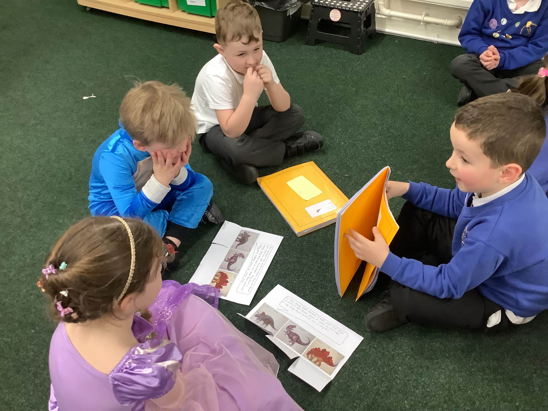 As part of our World Book Day KS1 and EYFS got together to share their character description writing. Year 2 had written about the goats and troll from The Three Billy Goats Gruff story. Year 1 wrote about giants from The Smartest Giant in Town story. EYFS described dinosaurs. The children had to use the clues from the descriptions to work out the characters. Some children worked in Mrs Edwards or Mrs Legg's classroom so please look for more photos on their page.