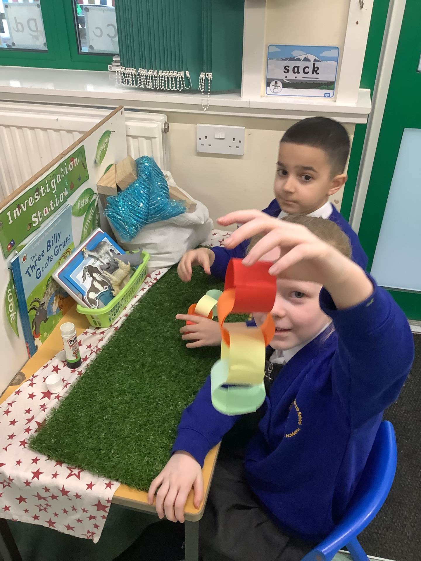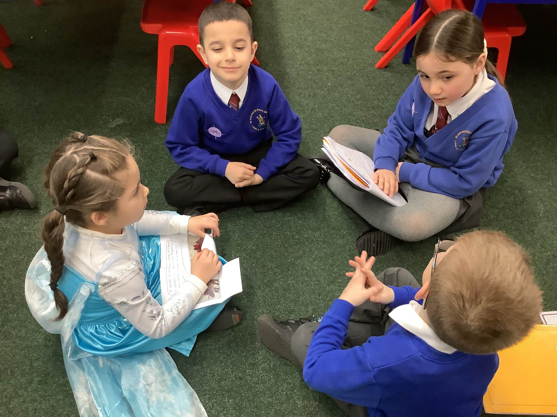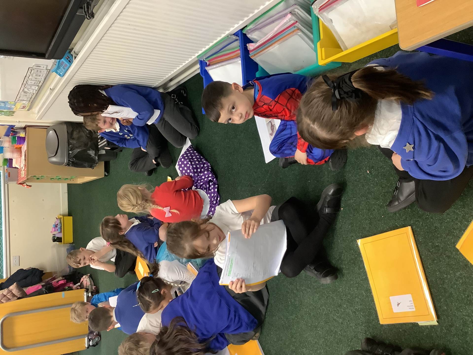 As part of our World Book Day KS1 and EYFS got together to share their character description writing. Year 2 had written about the goats and troll from The Three Billy Goats Gruff story. Year 1 wrote about giants from The Smartest Giant in Town story. EYFS described dinosaurs. The children had to use the clues from the descriptions to work out the characters. Some children worked in Mrs Edwards or Mrs Legg's classroom so please look for more photos on their page.