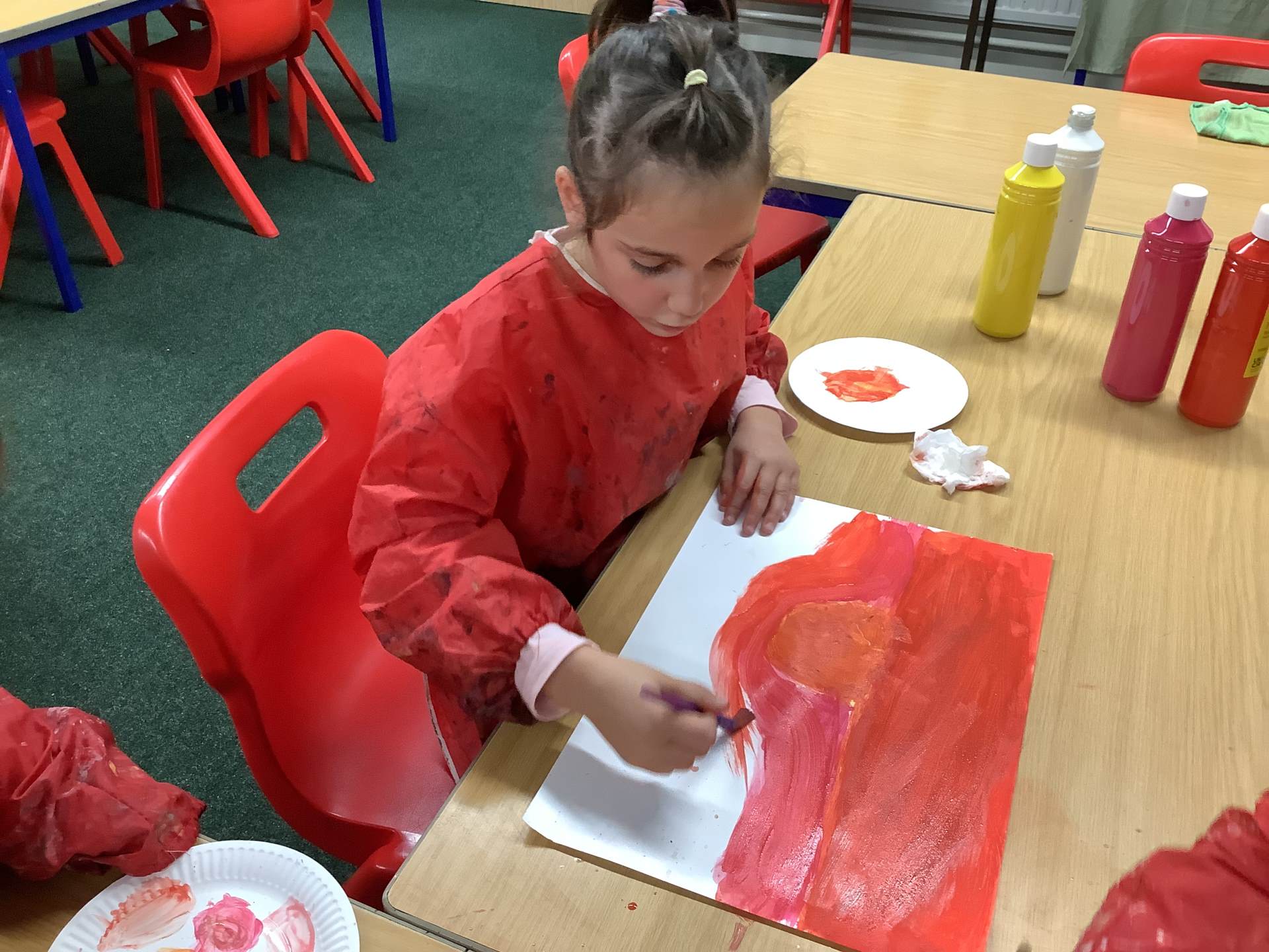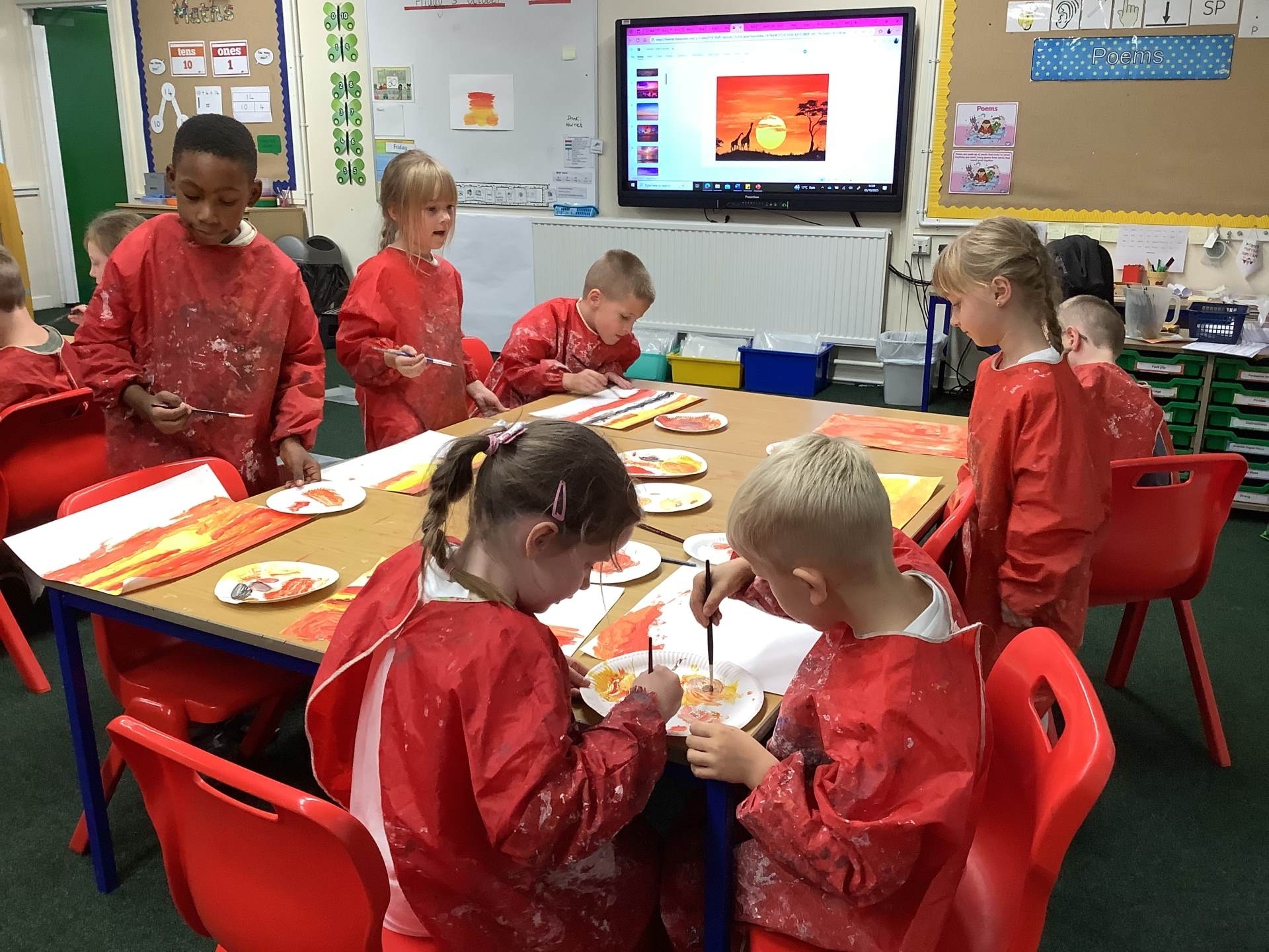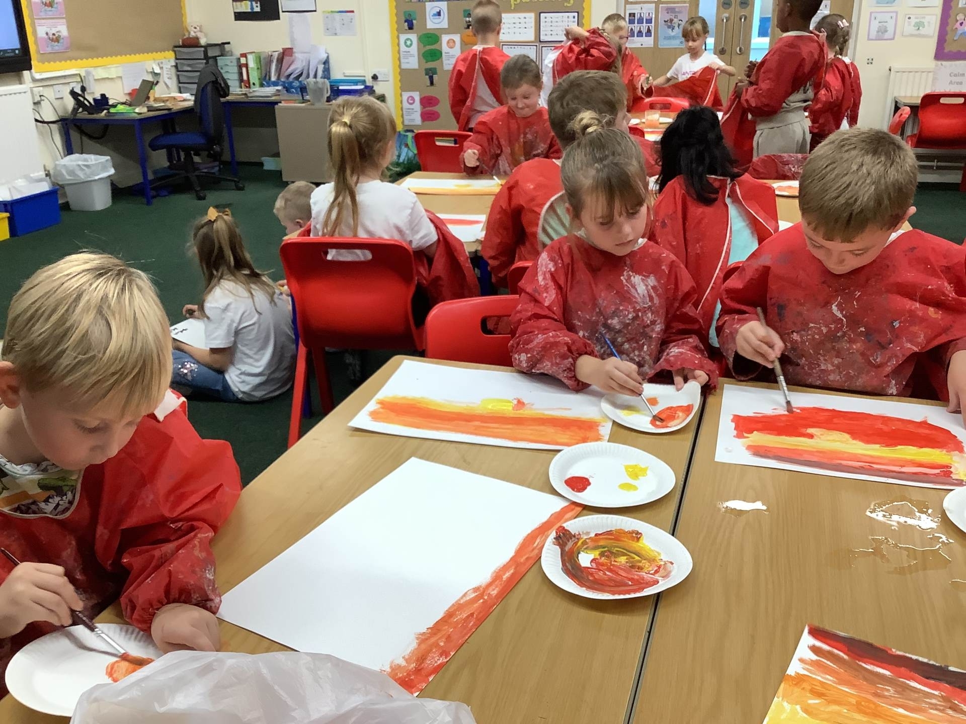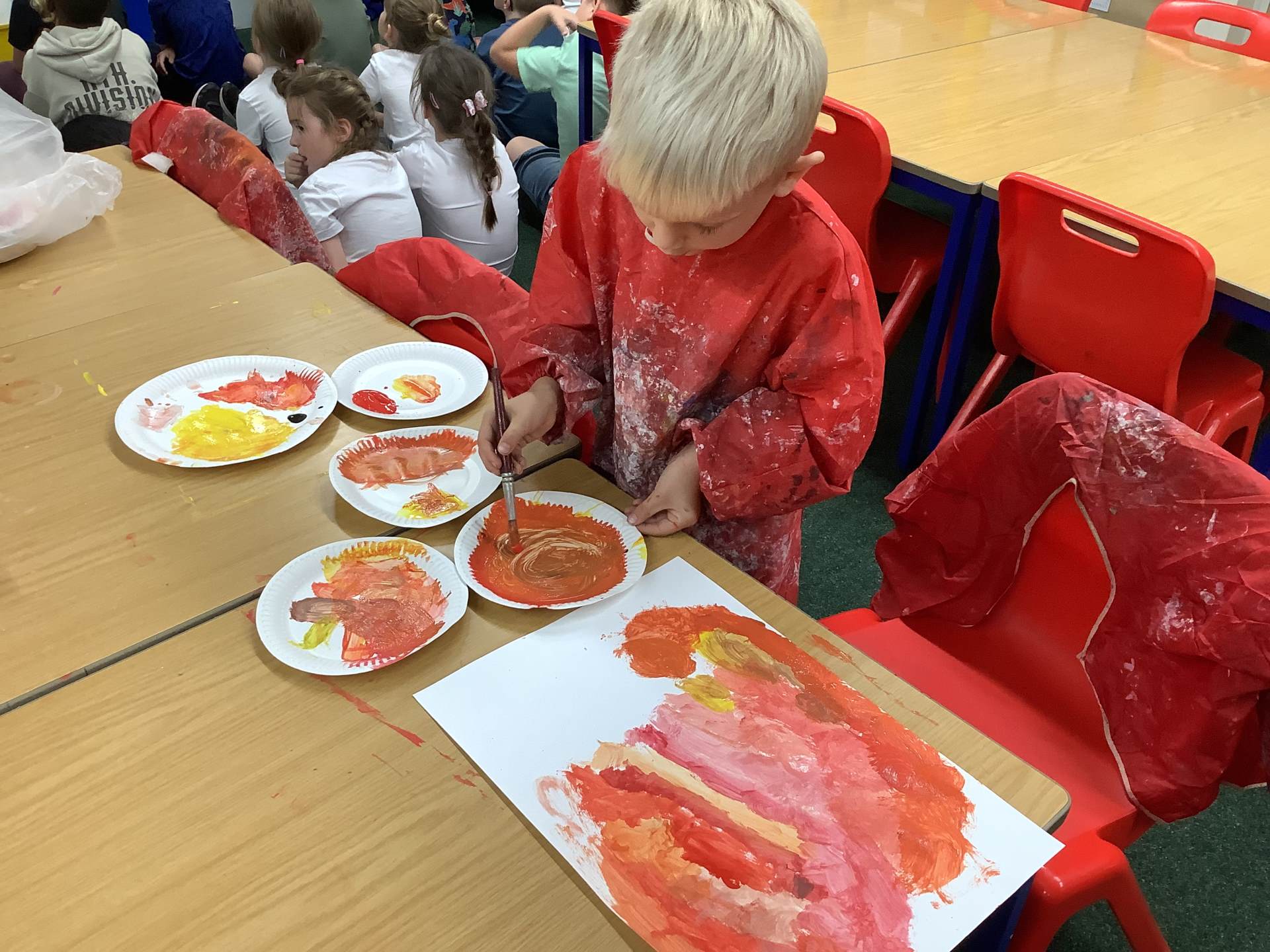 We have had some fabulous art lessons experimenting with paint this term. We've built on our knowledge from Year 1 and discussed colour mixing and shading. The children then used these skills to create a sunset scene. We will be drawing over the top of this and hope the end results will be ready to show during the school carnival procession!