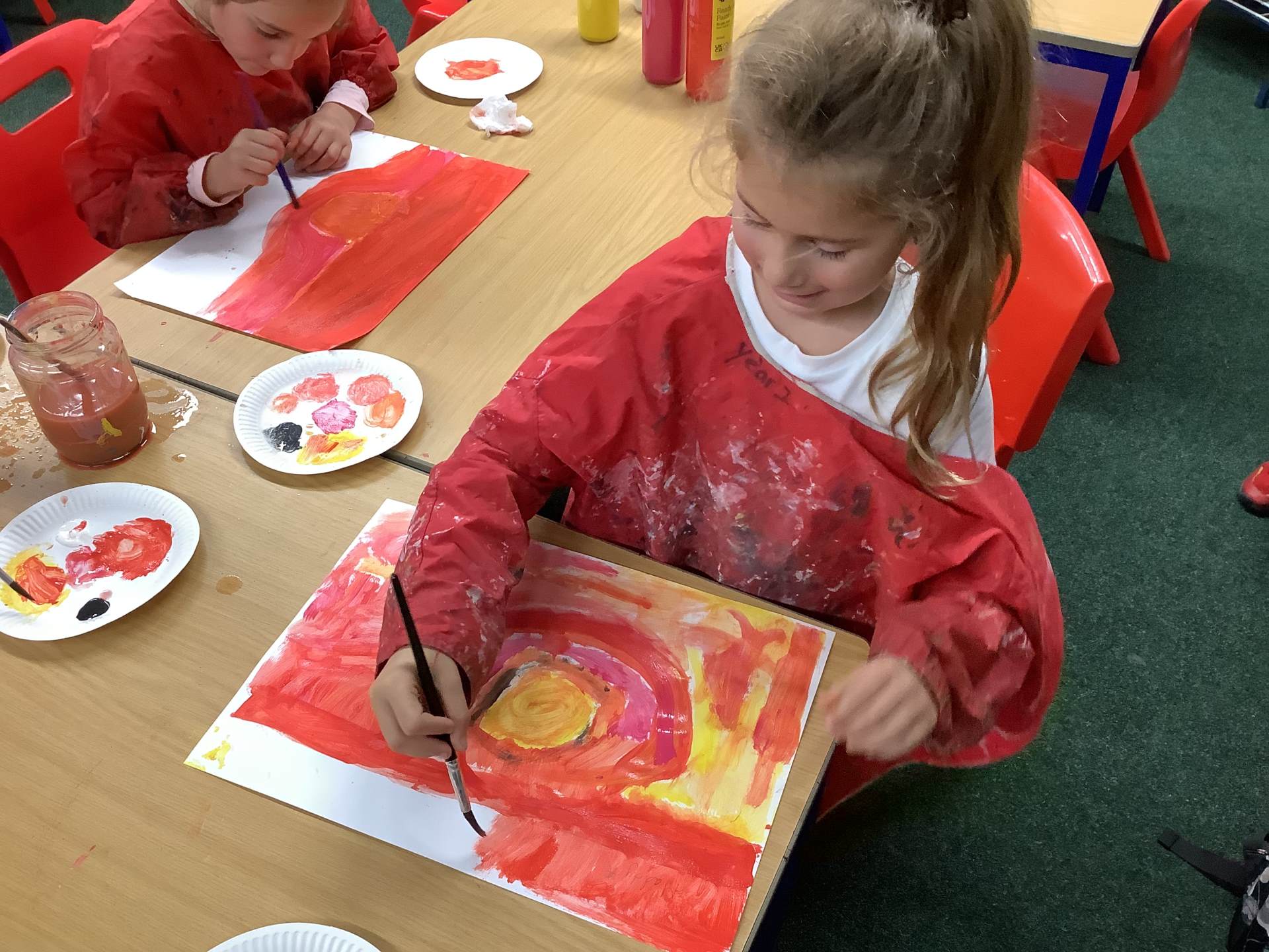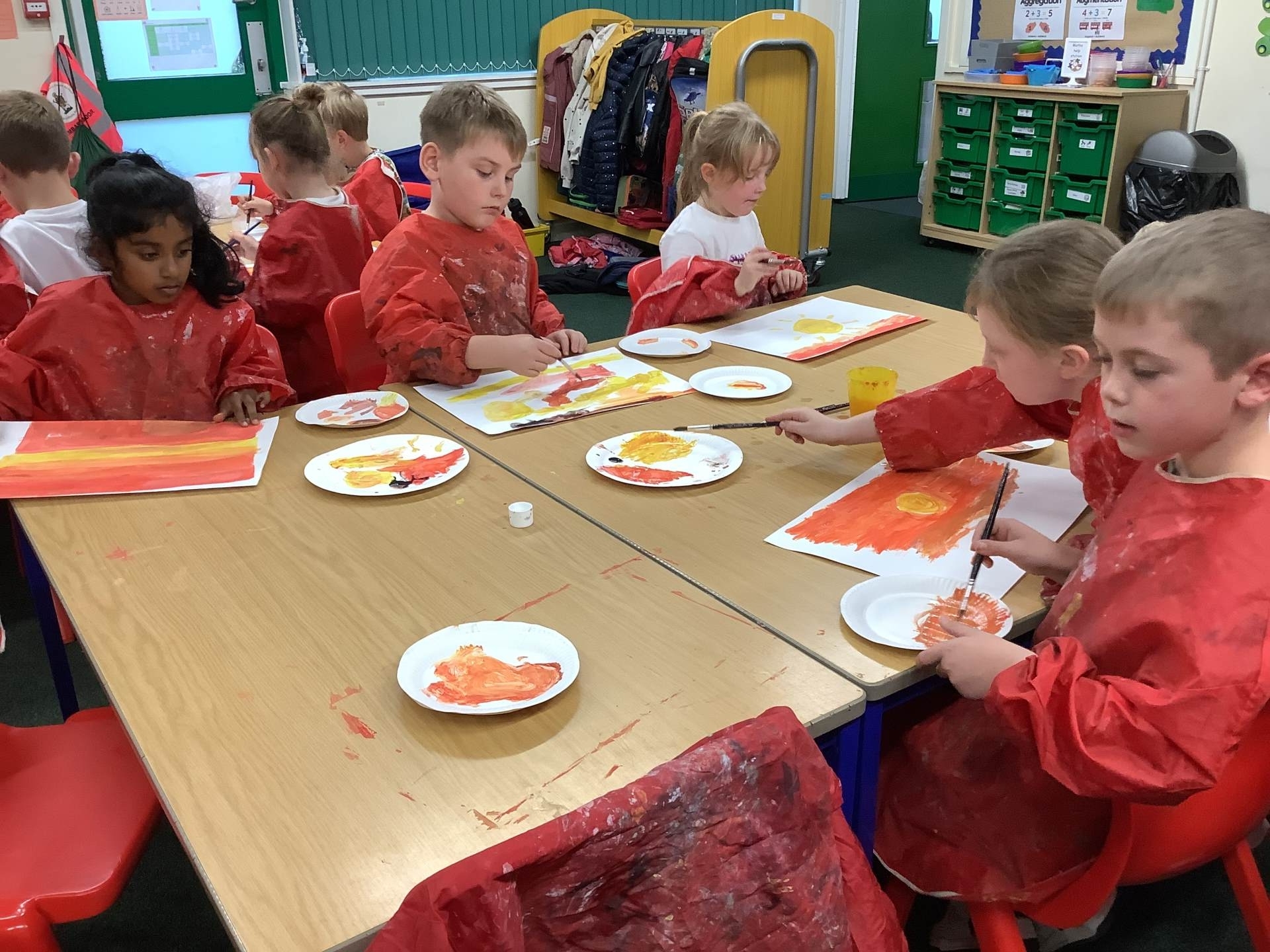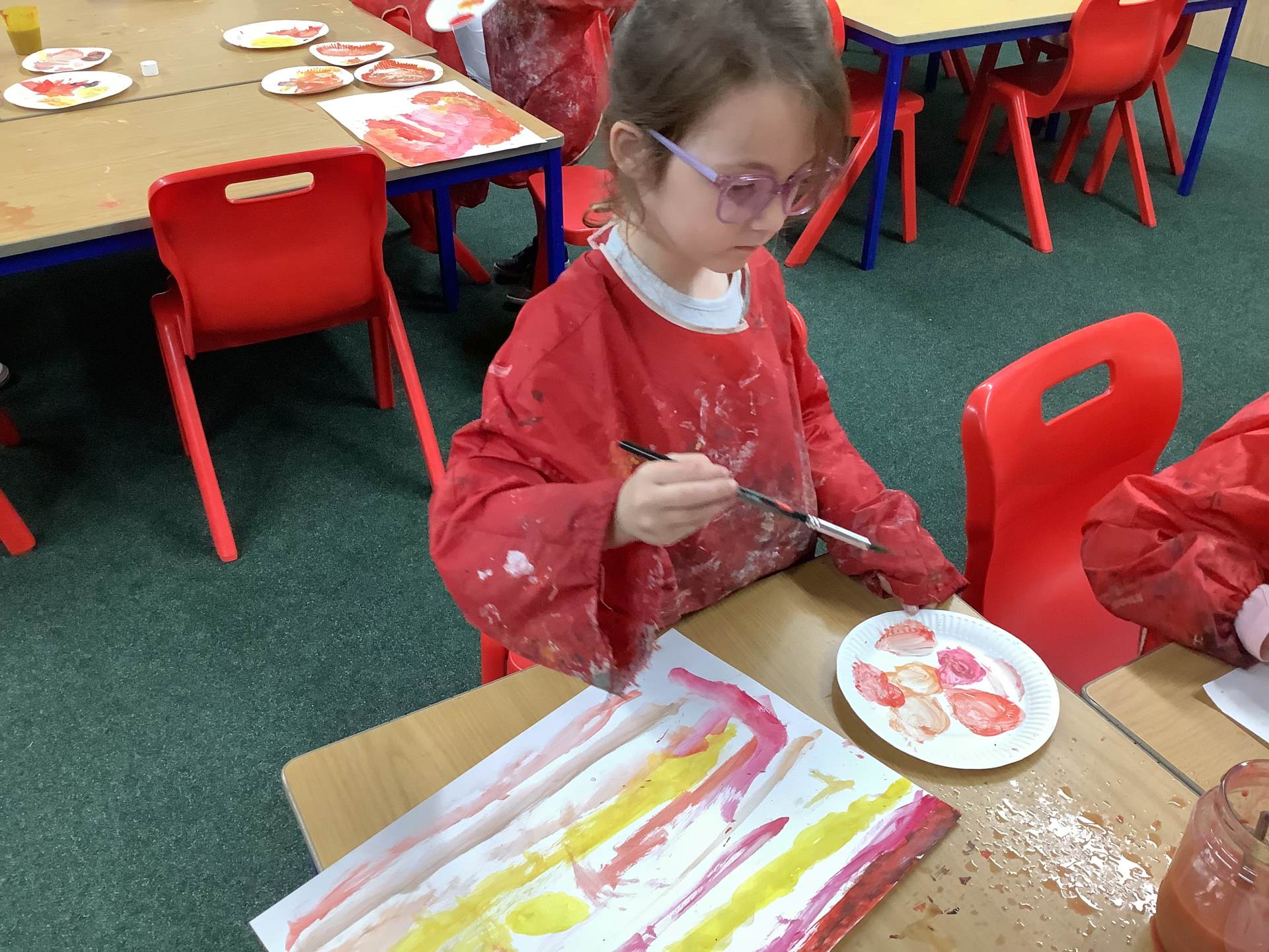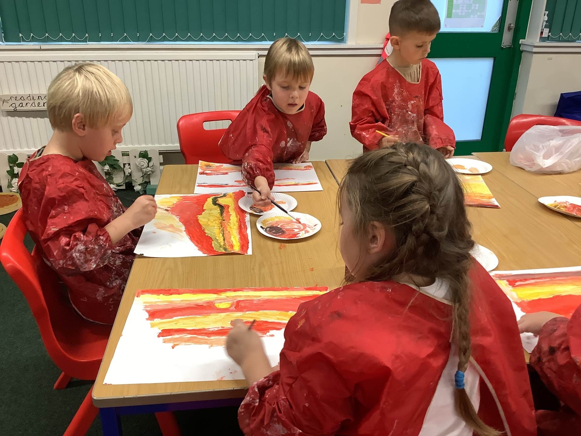 We have had some fabulous art lessons experimenting with paint this term. We've built on our knowledge from Year 1 and discussed colour mixing and shading. The children then used these skills to create a sunset scene. We will be drawing over the top of this and hope the end results will be ready to show during the school carnival procession!