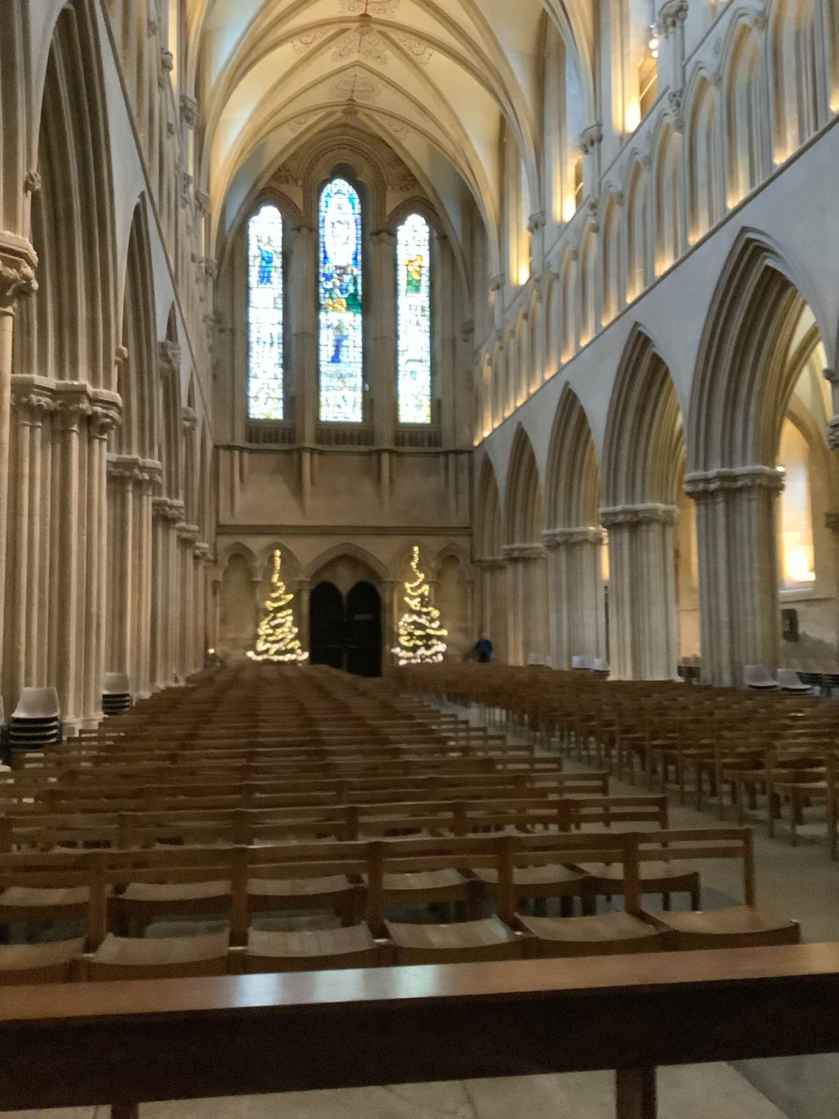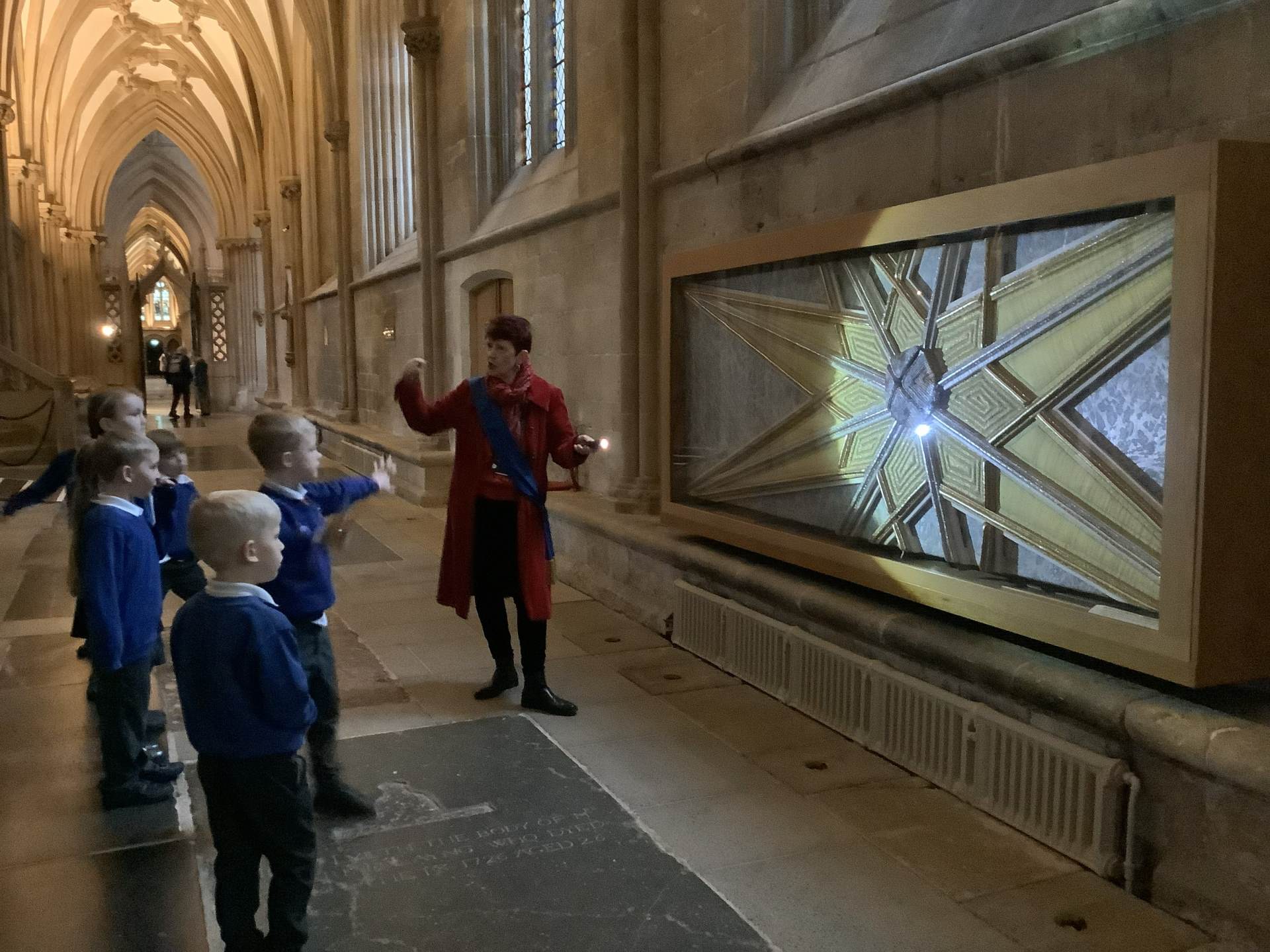 We have had a wonderful day at Wells Cathedral. The Christmas trees looked beautiful and we learned a lot about the building. Did you know it was built 900 years ago? We looked at the fabulous stained glass windows. Our guide told us that some people couldn't read or write all that time ago so stories from The Bible were told in pictures in the stained glass. She also told us that some soldiers came, a long time ago, and broke the windows. The glass broke and instead of throwing it away the windows were made again but not in the right order. These are called the 'jigsaw windows'.