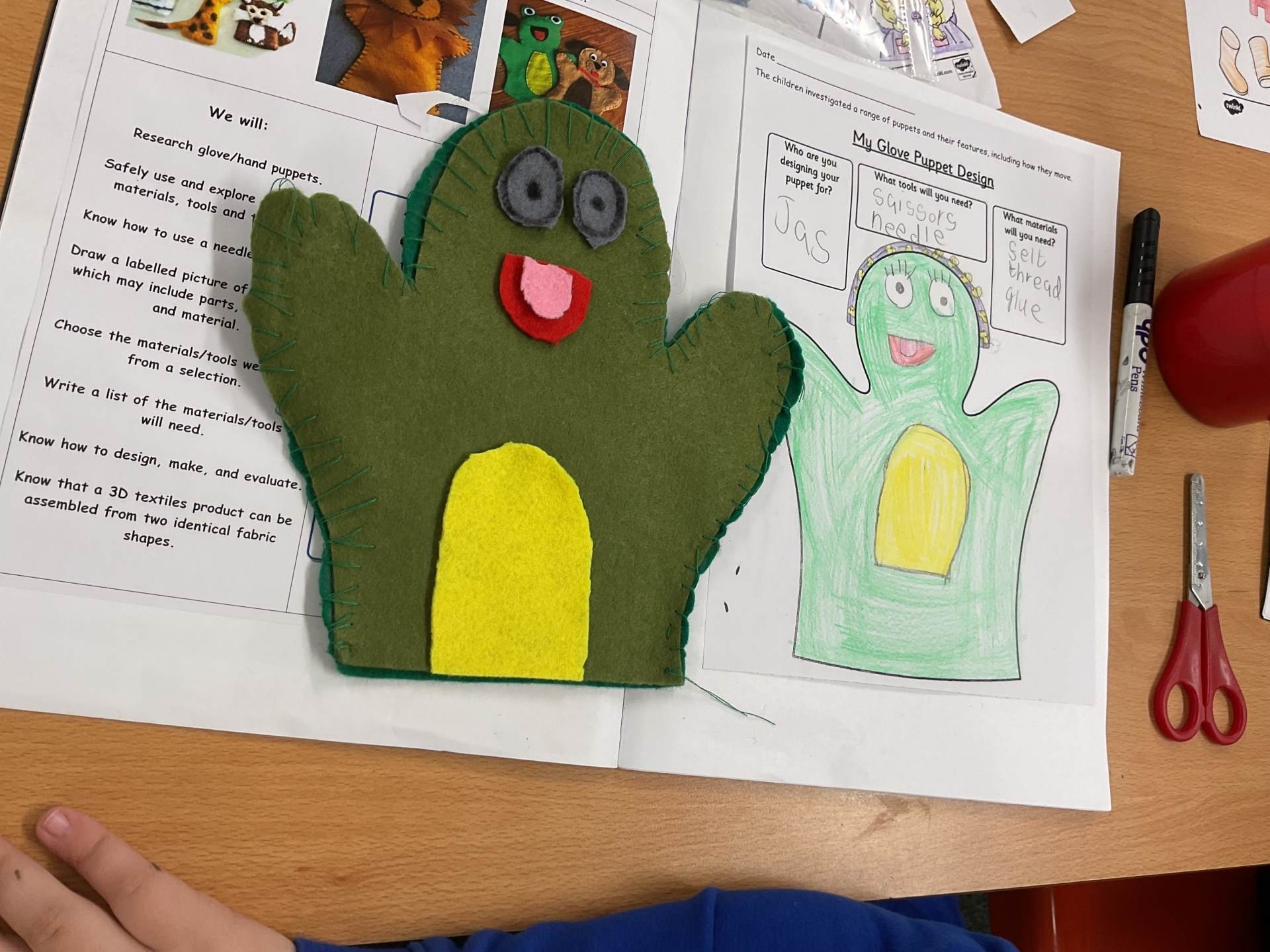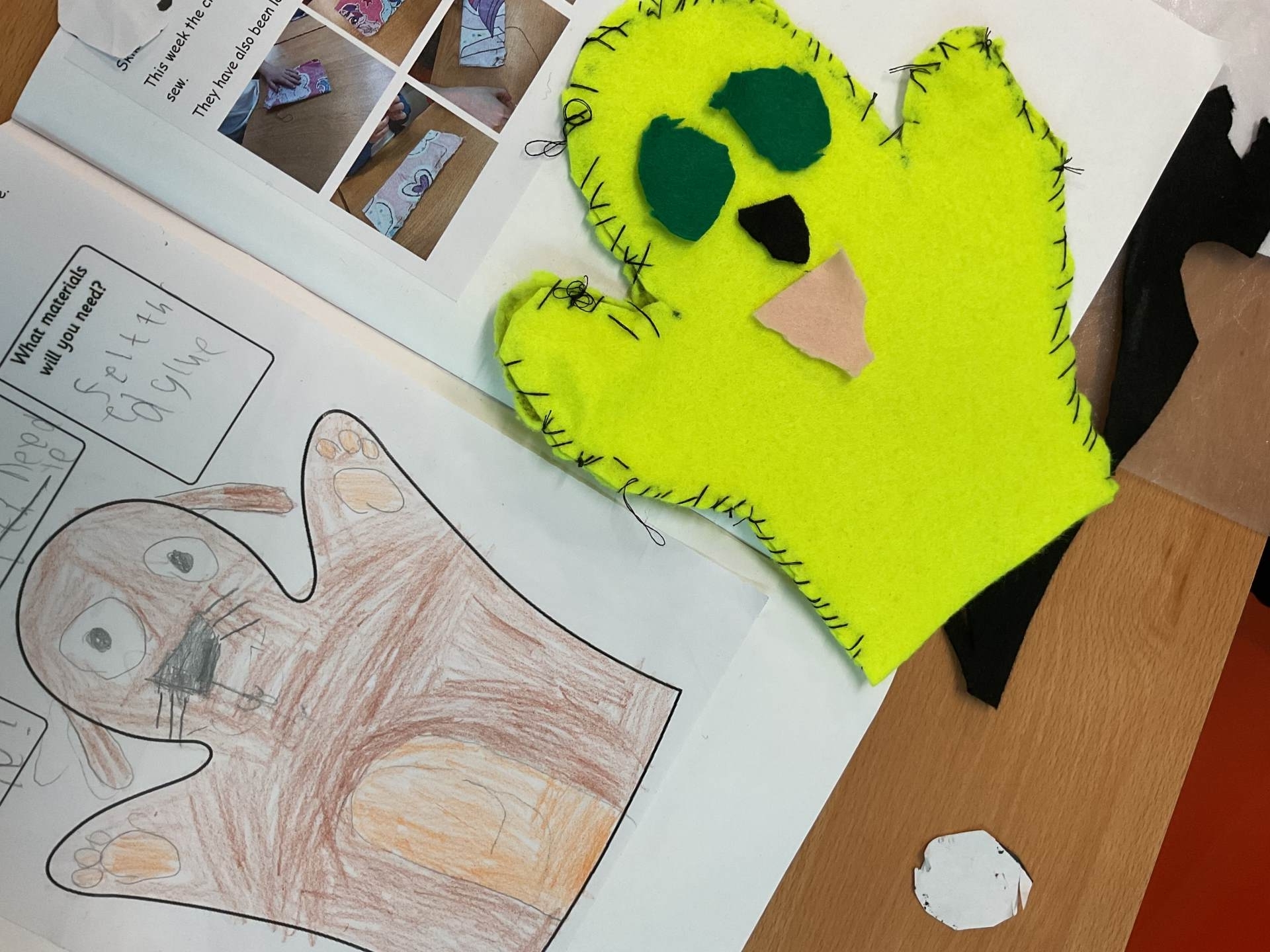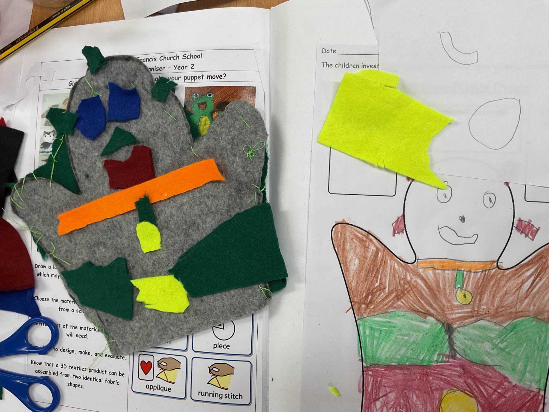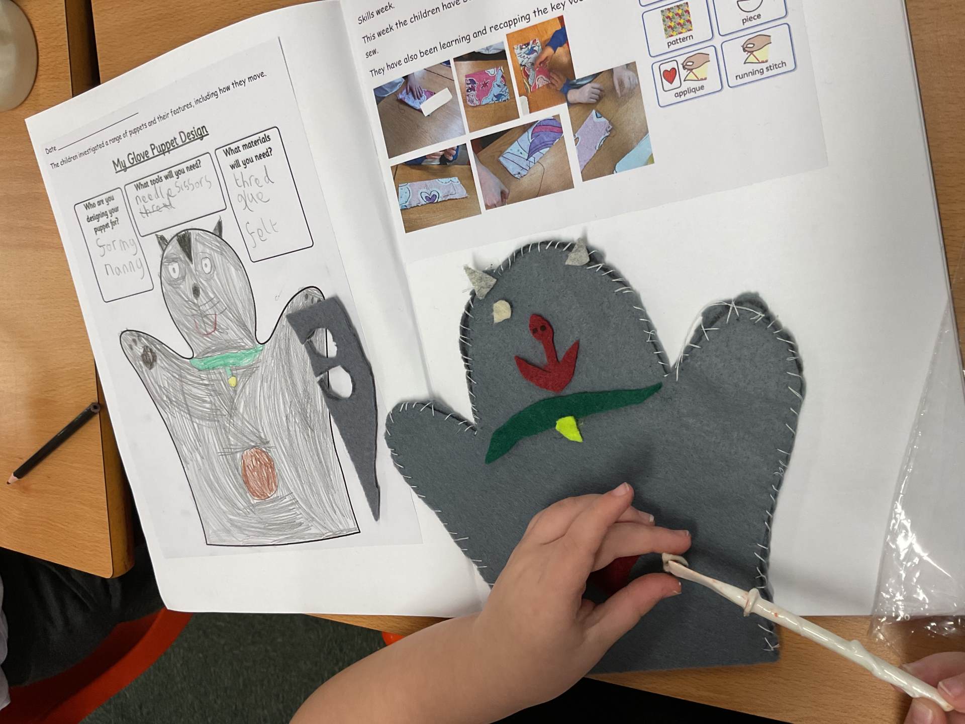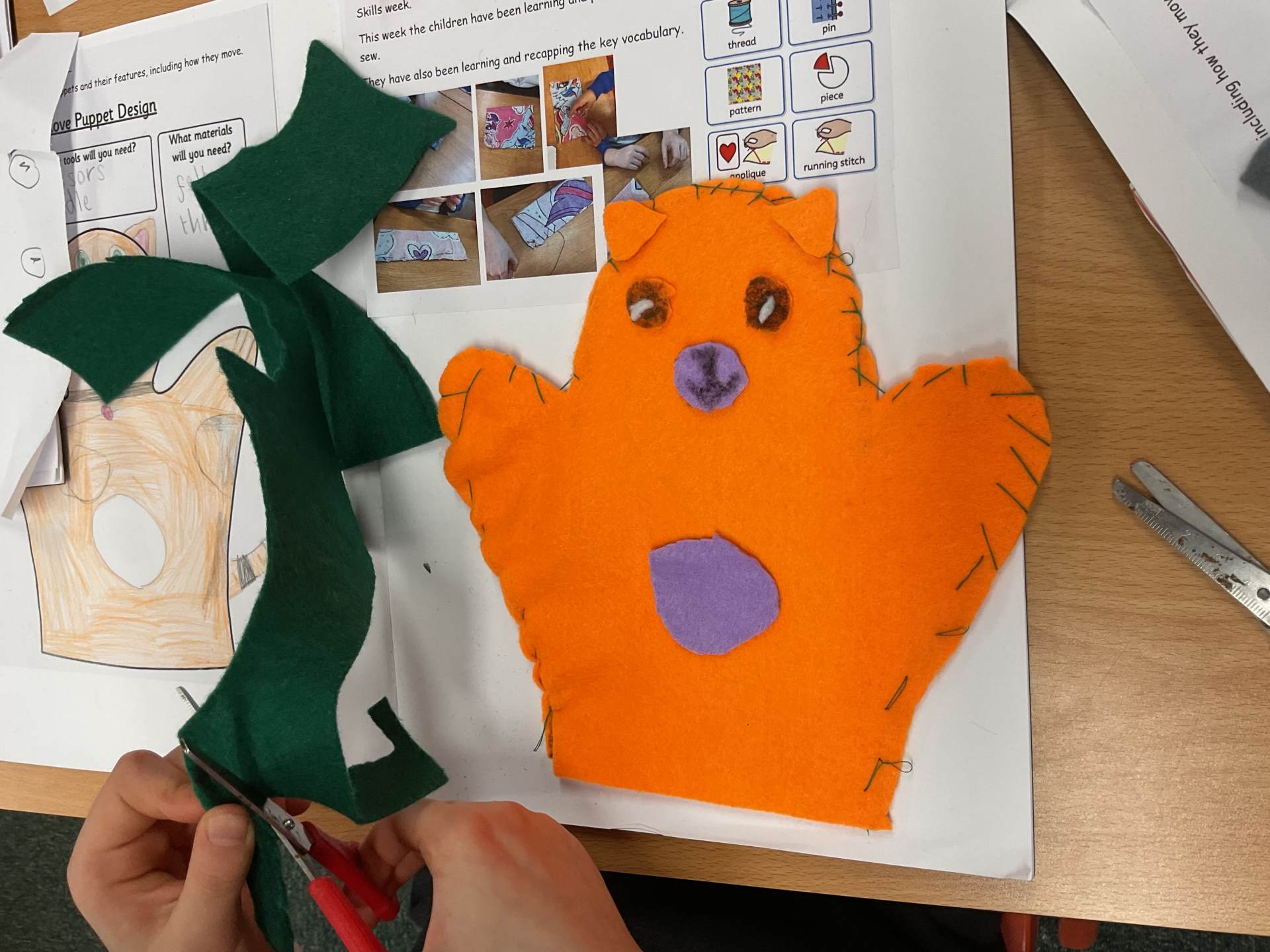Our unit in DT this half term was making puppets. After looking at different types of puppets and practising our sewing skills, the children designed their own hand puppet. They used the felt to shape their puppet and for the decoration. The children used either a running or over stitch (and sometimes both!)