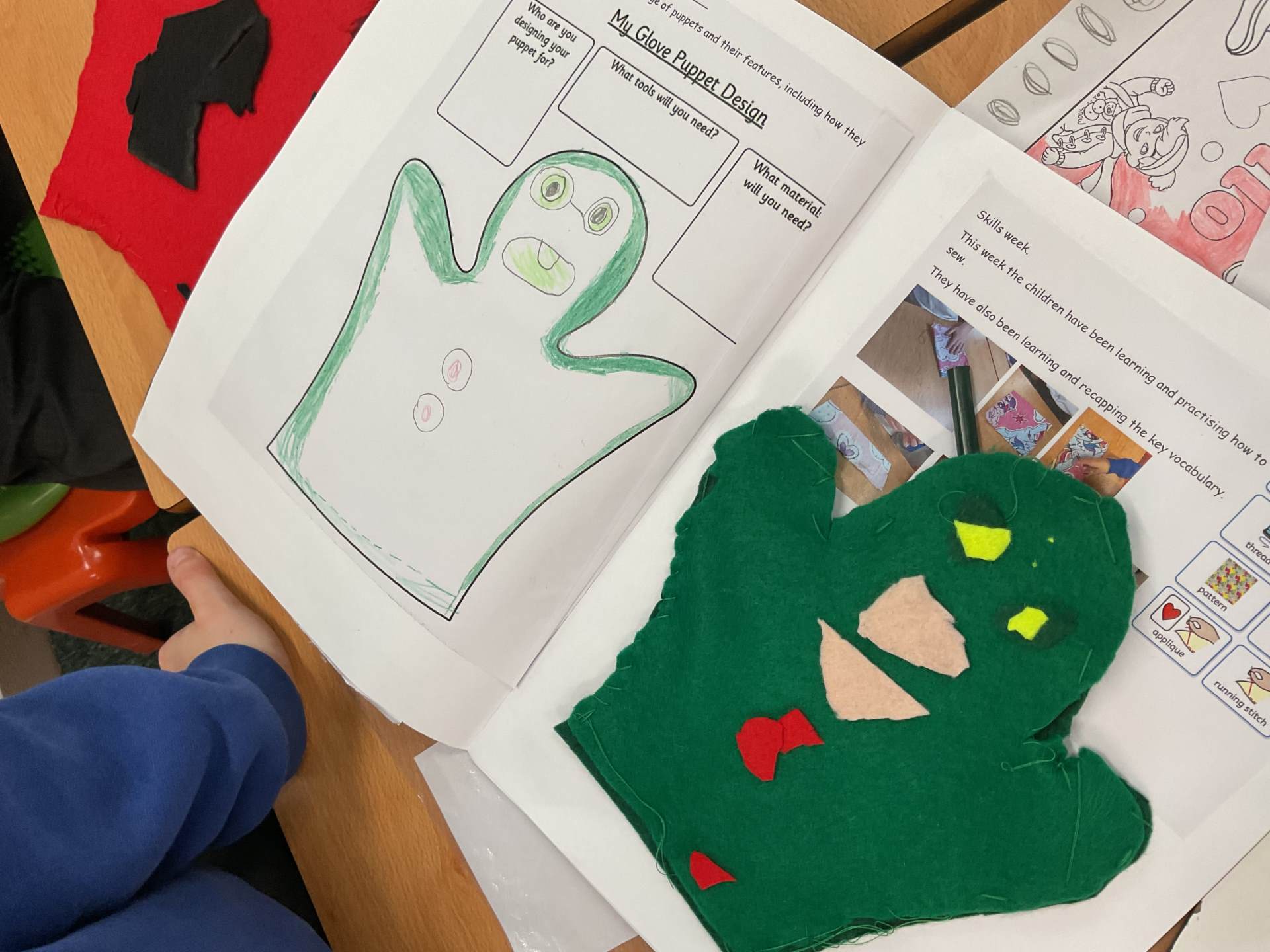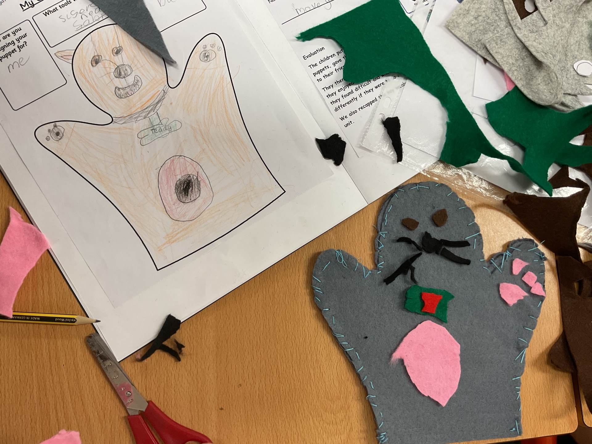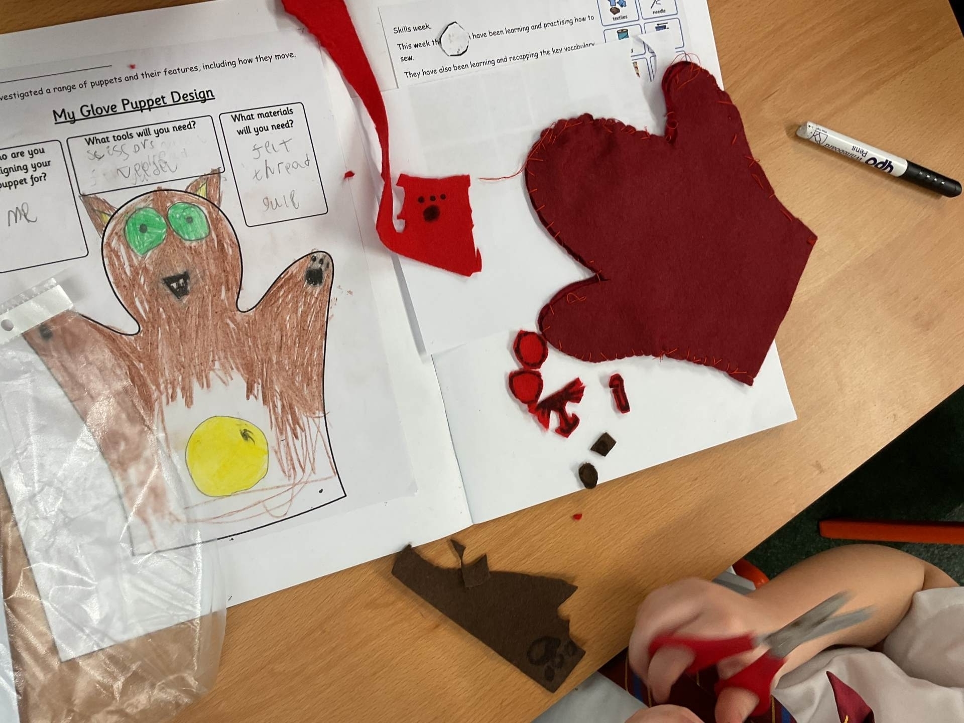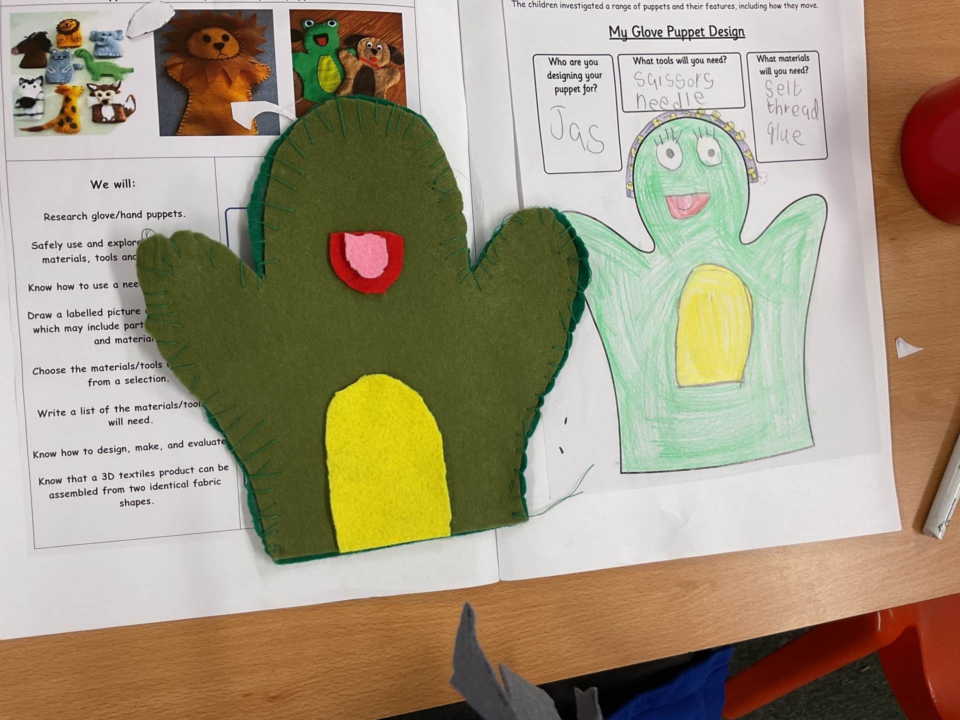 Our unit in DT this half term was making puppets. After looking at different types of puppets and practising our sewing skills, the children designed their own hand puppet. They used the felt to shape their puppet and for the decoration. The children used either a running or over stitch (and sometimes both!)