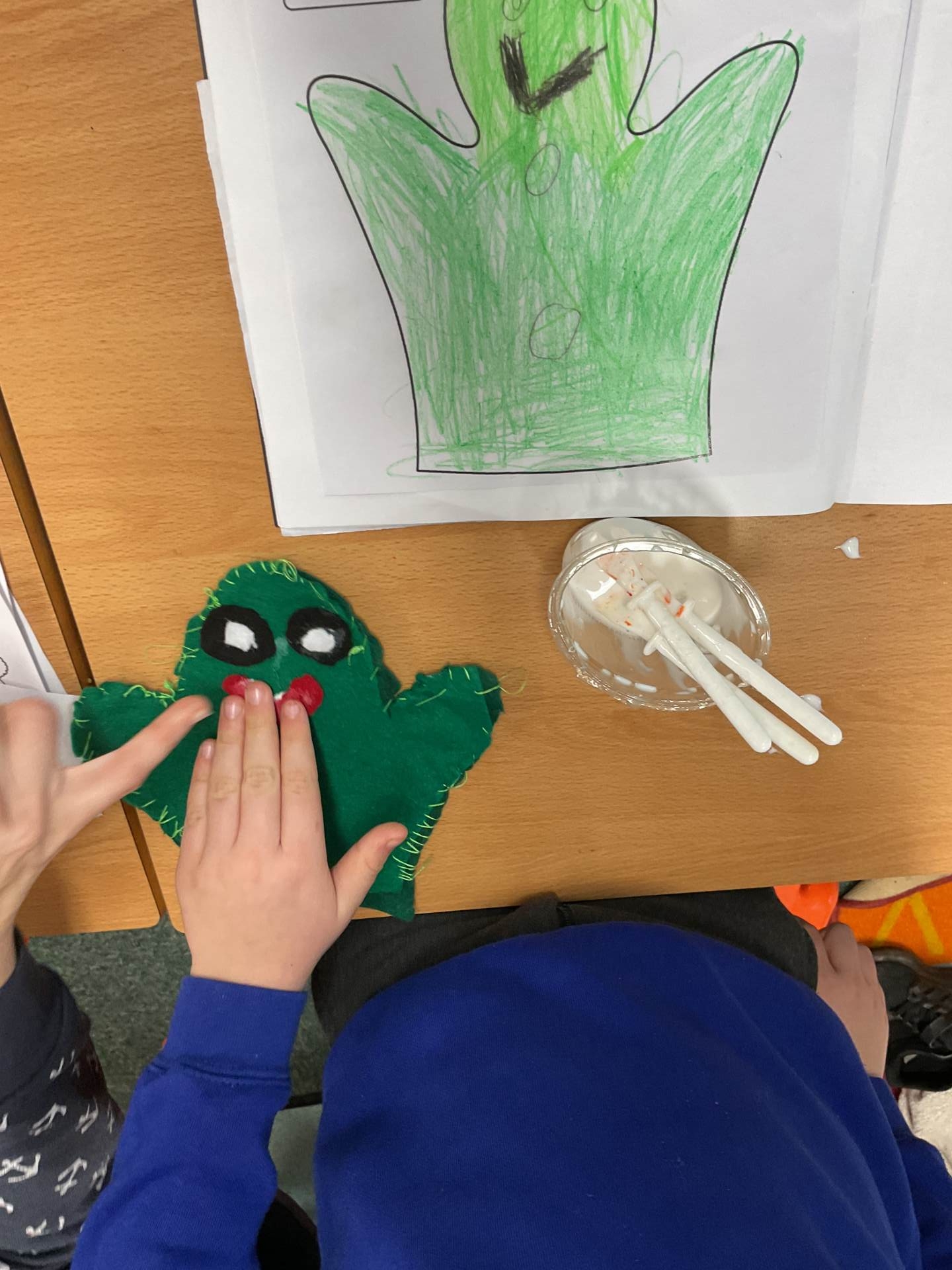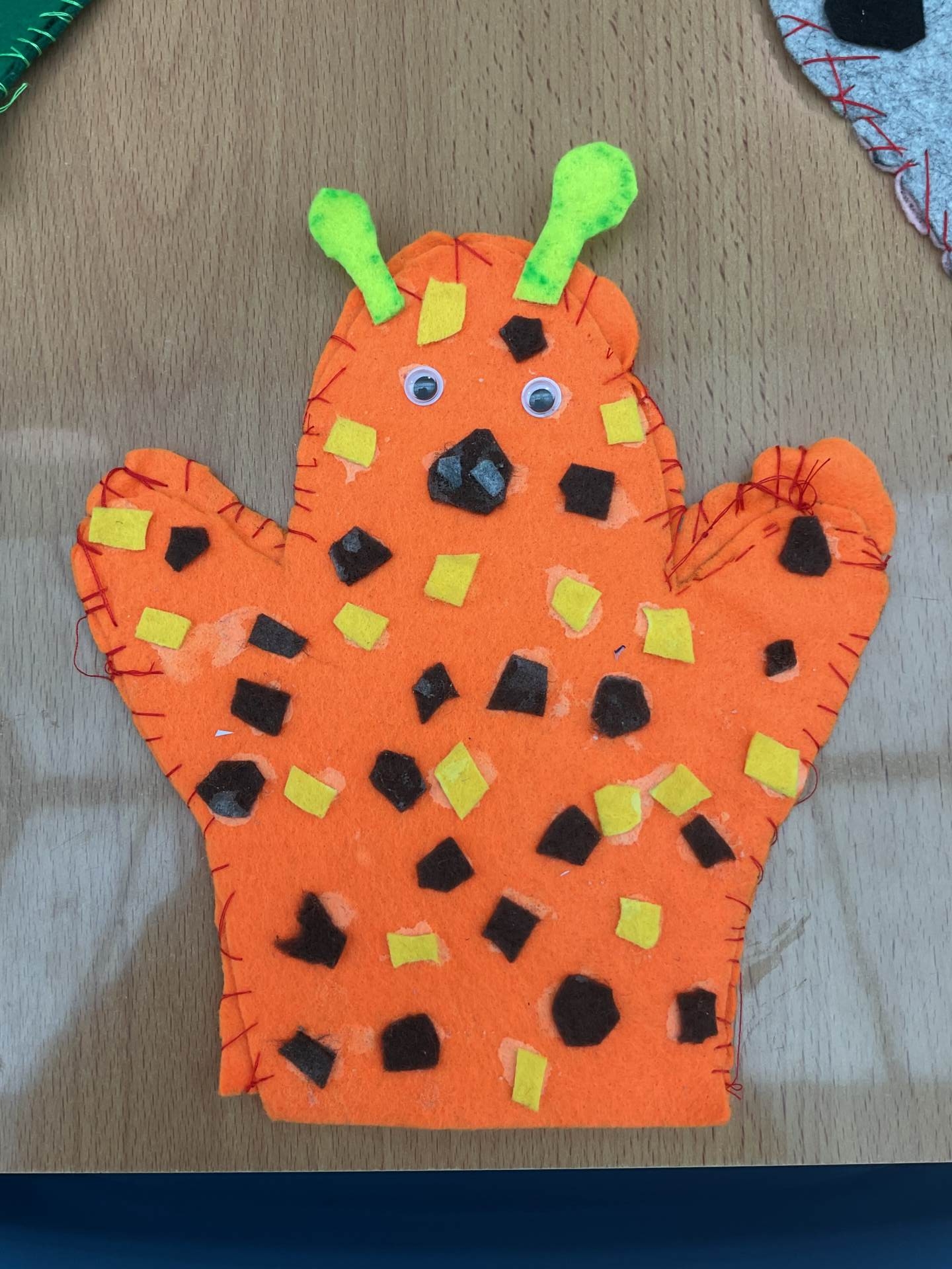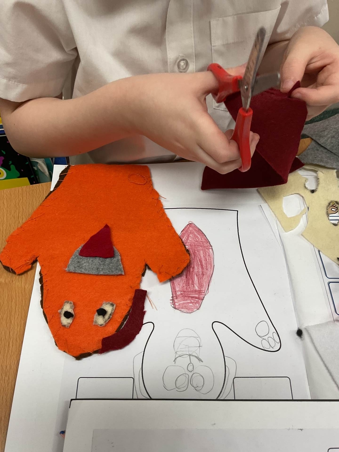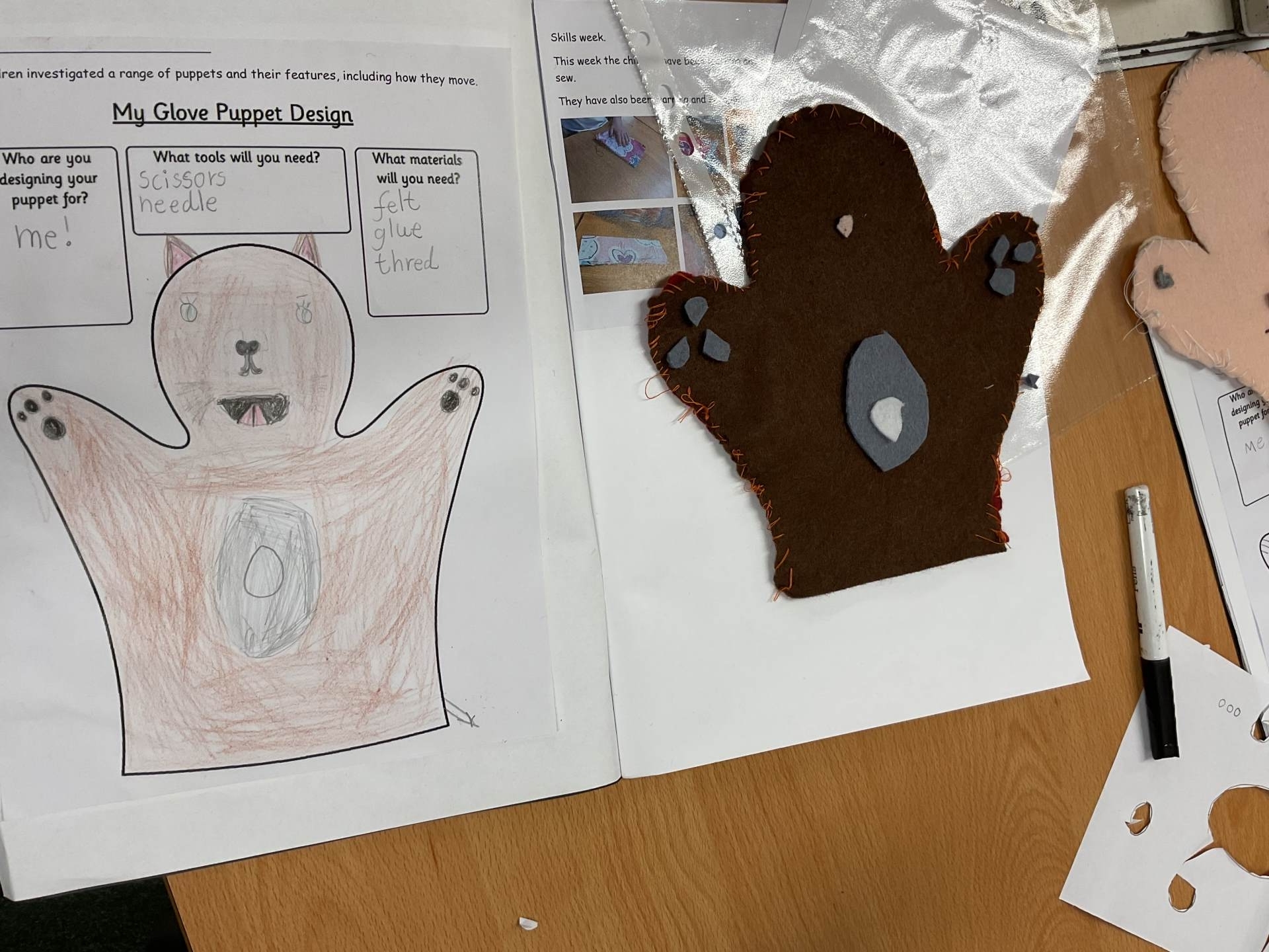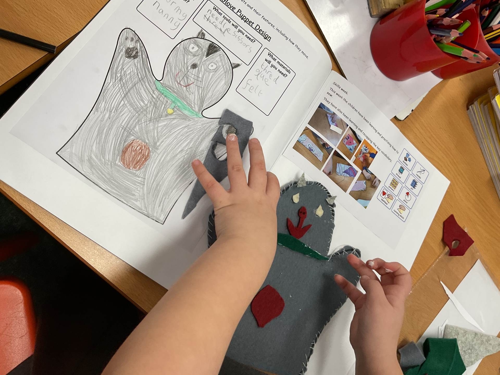 Our unit in DT this half term was making puppets. After looking at different types of puppets and practising our sewing skills, the children designed their own hand puppet. They used the felt to shape their puppet and for the decoration. The children used either a running or over stitch (and sometimes both!)