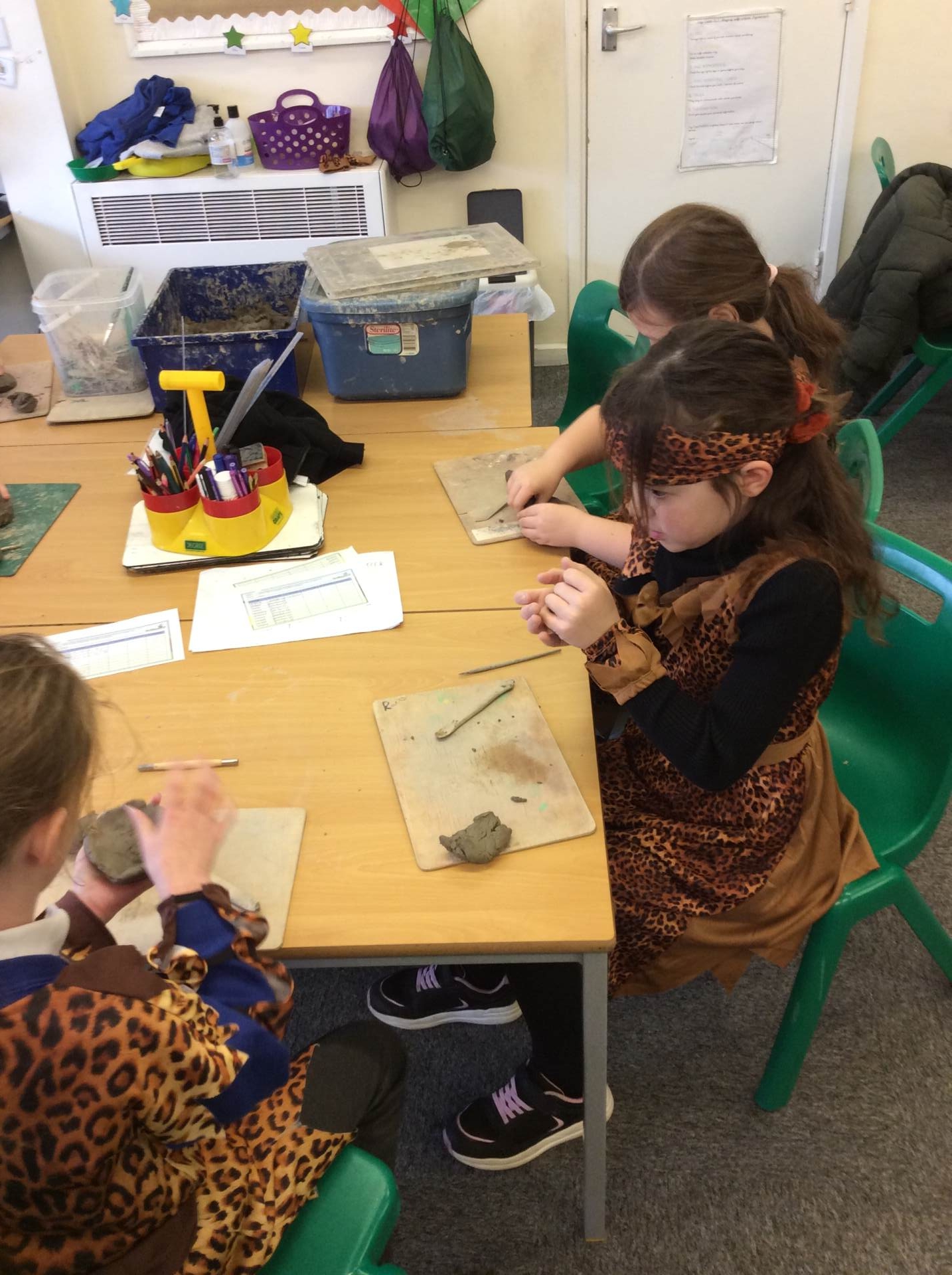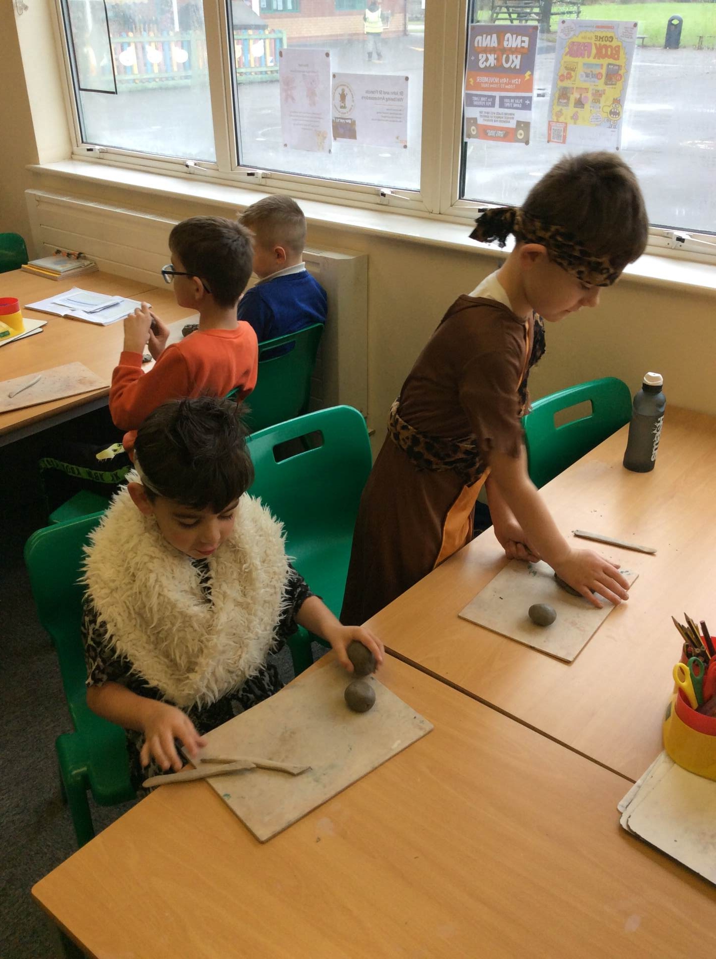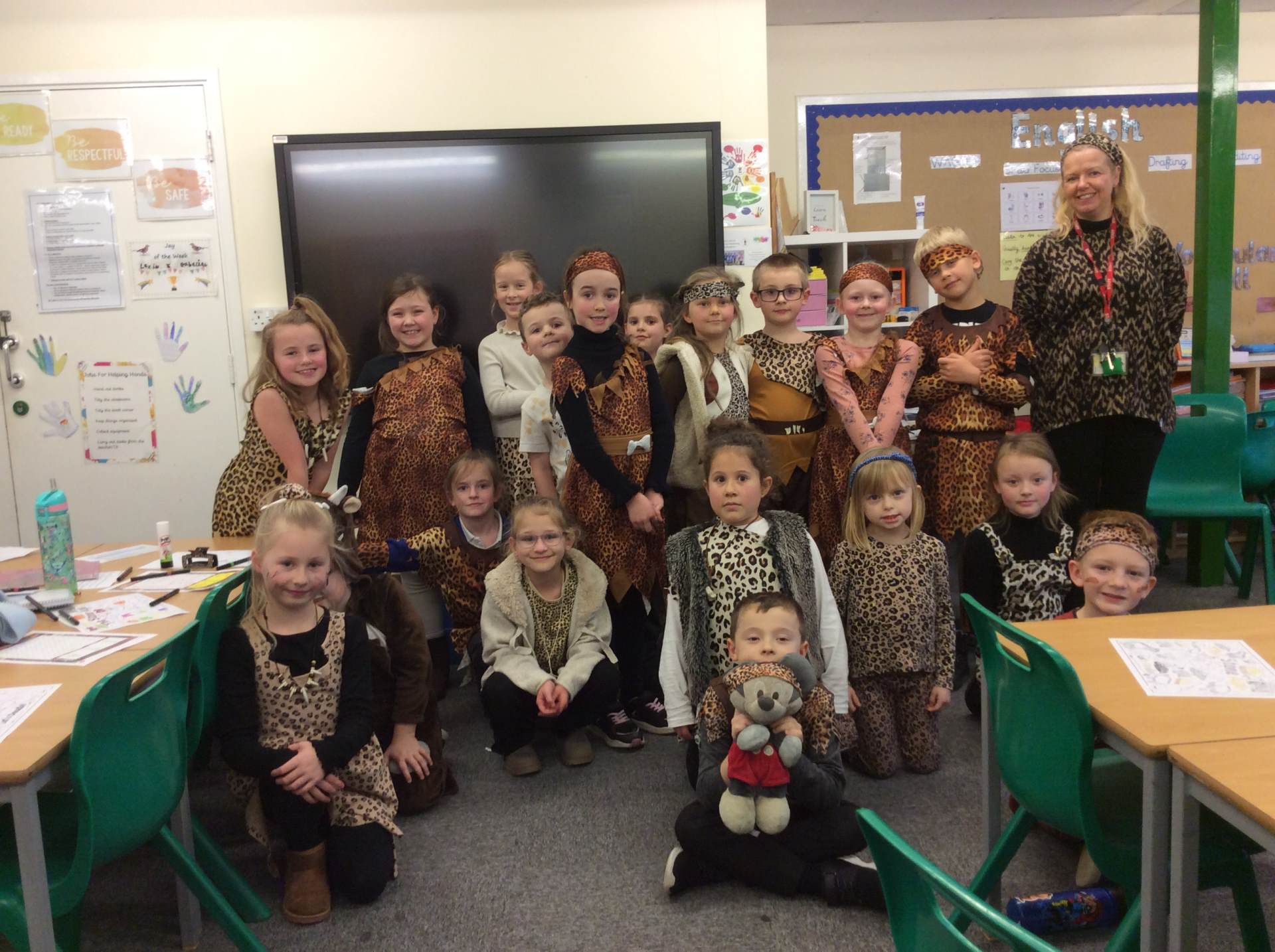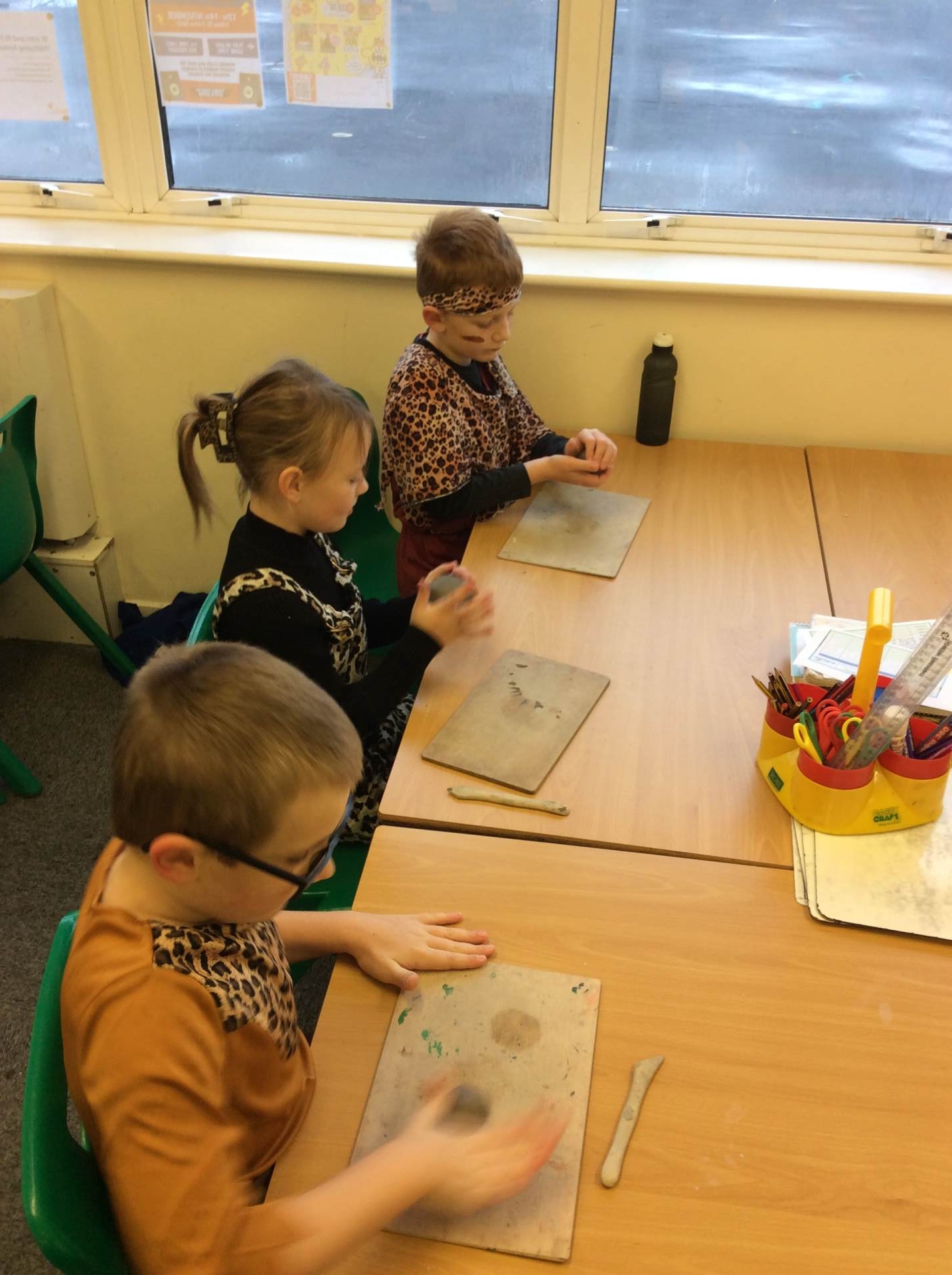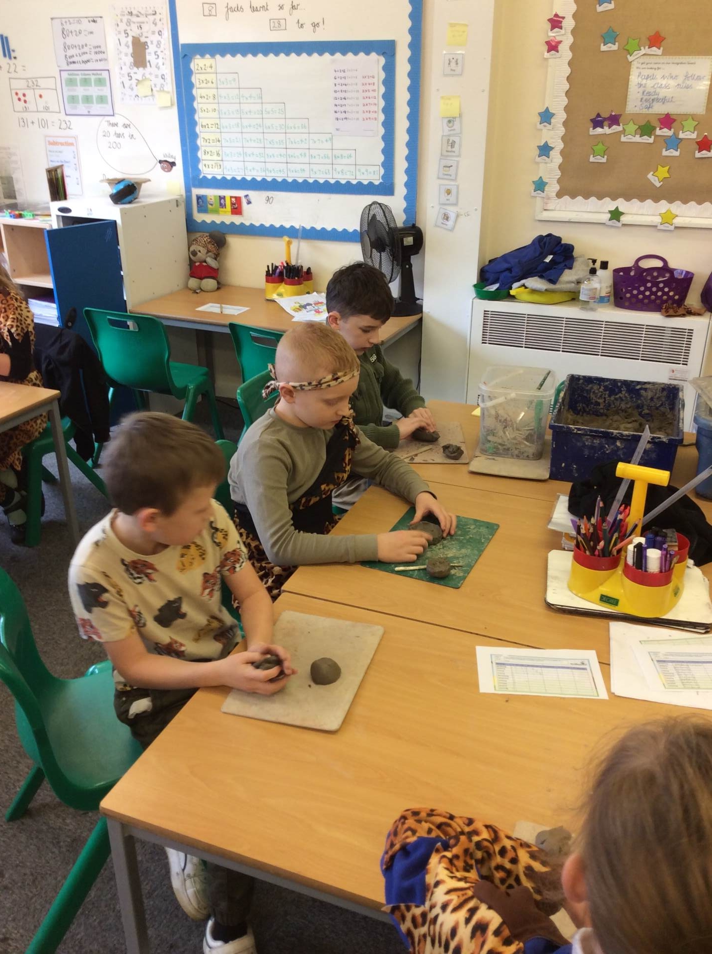 Today we spent the day as Stone Age people dressed in costume and experiencing life like they would have done 3 million years ago. In the morning, we used natural materials to create paintings, made sparks for a fire using flint stones and crafted clay pots. Because it was so cold outside, we had to have hot chocolate and marshmallows to warm us up when we came back inside! During the afternoon, we pretended we were inside a cave by going under the tables and drawing on the 'cave roof', we also made a fruit stew-it tasted delicious. Next week, we will be writing the instructions for how to make fruit stew in our English lessons.