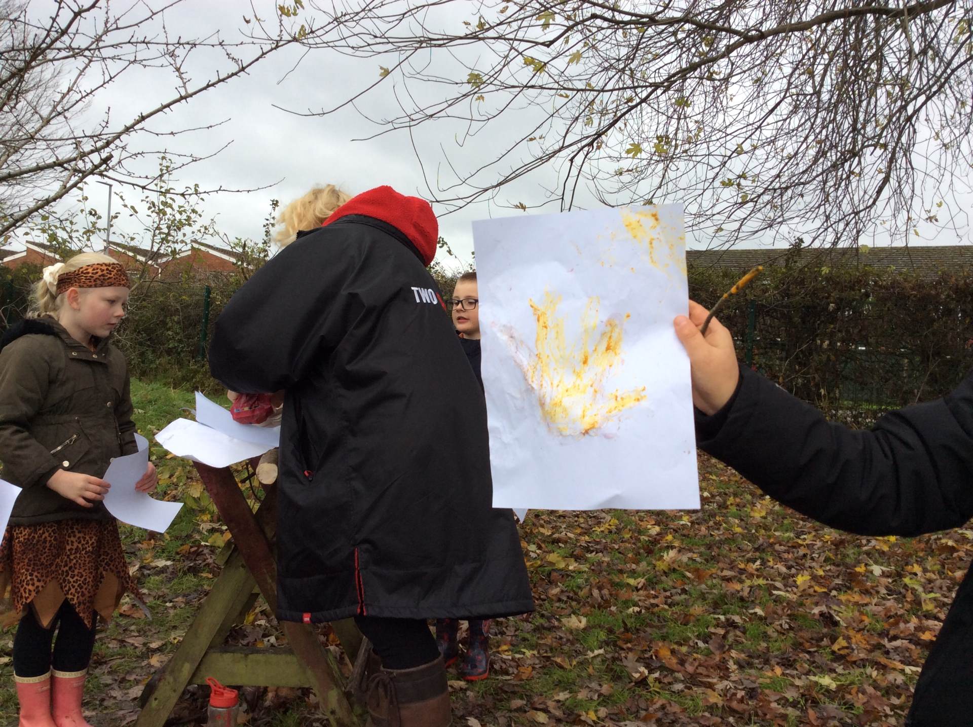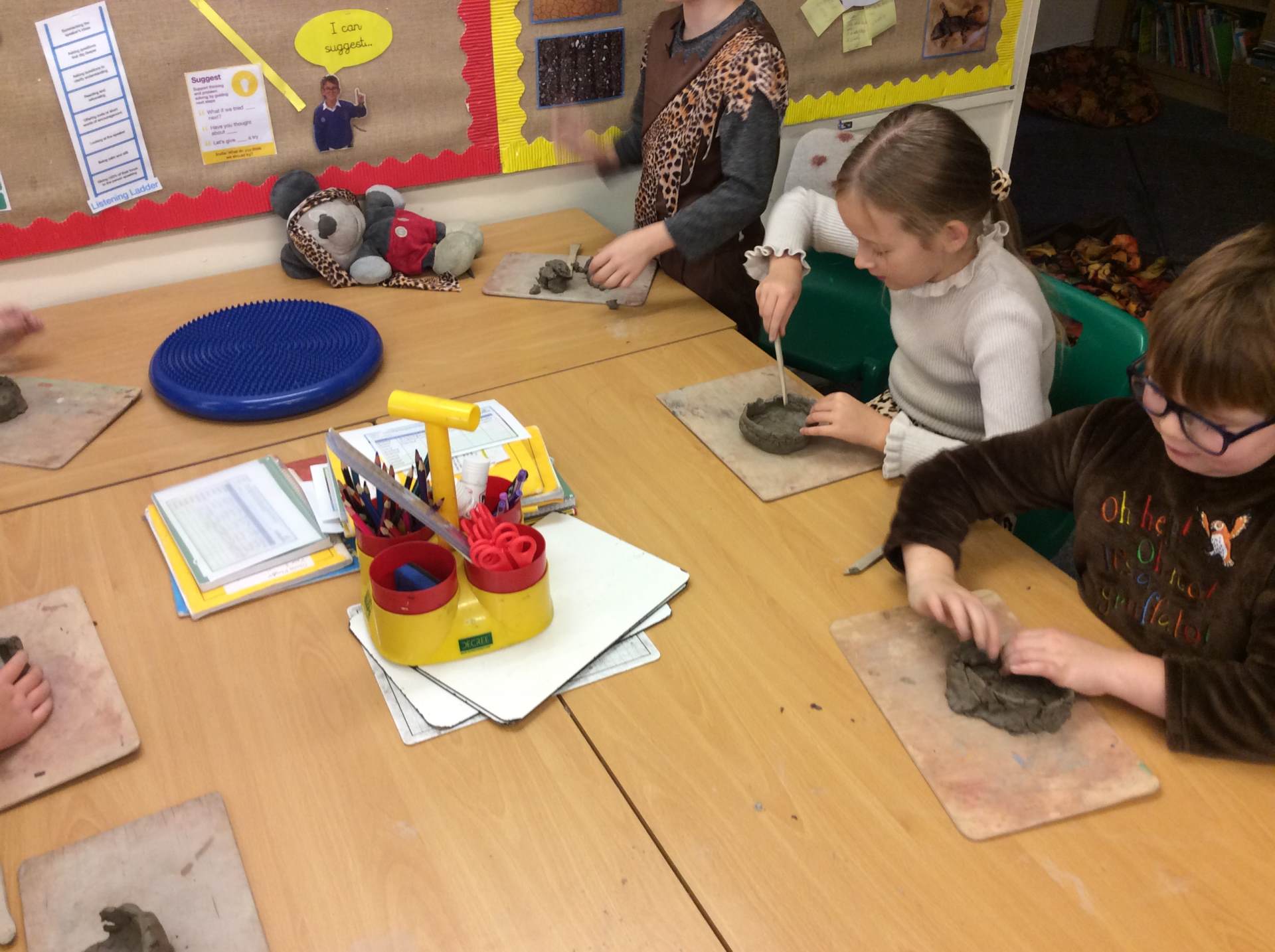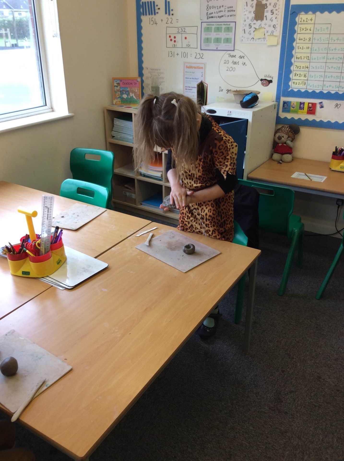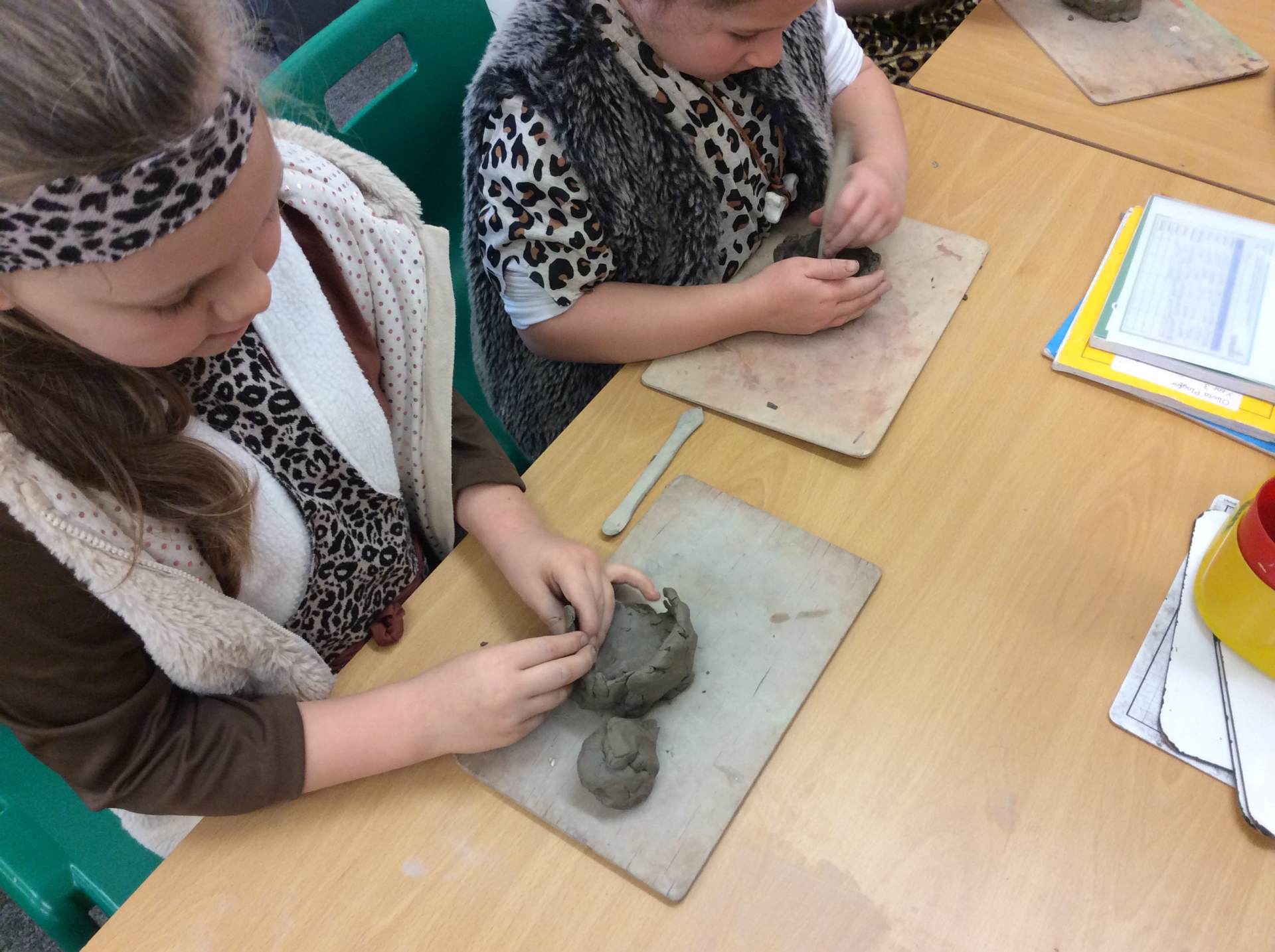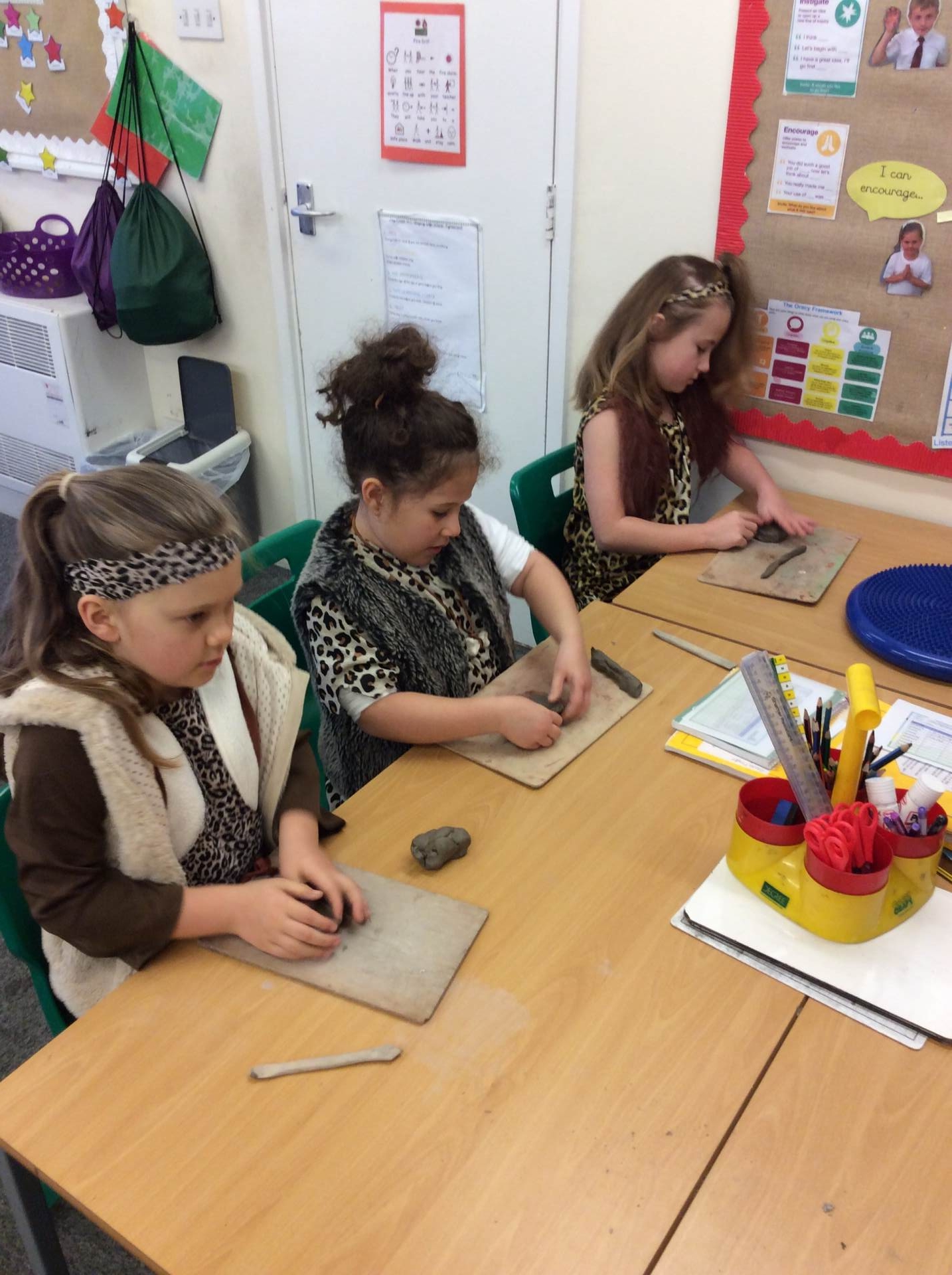Today we spent the day as Stone Age people dressed in costume and experiencing life like they would have done 3 million years ago. In the morning, we used natural materials to create paintings, made sparks for a fire using flint stones and crafted clay pots. Because it was so cold outside, we had to have hot chocolate and marshmallows to warm us up when we came back inside! During the afternoon, we pretended we were inside a cave by going under the tables and drawing on the 'cave roof', we also made a fruit stew-it tasted delicious. Next week, we will be writing the instructions for how to make fruit stew in our English lessons.