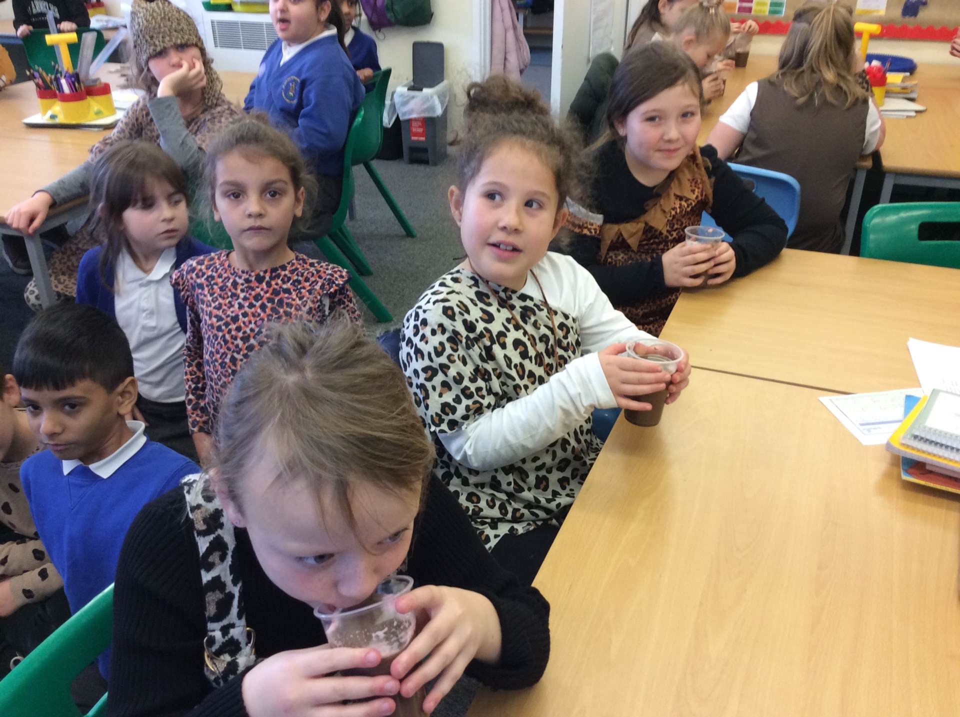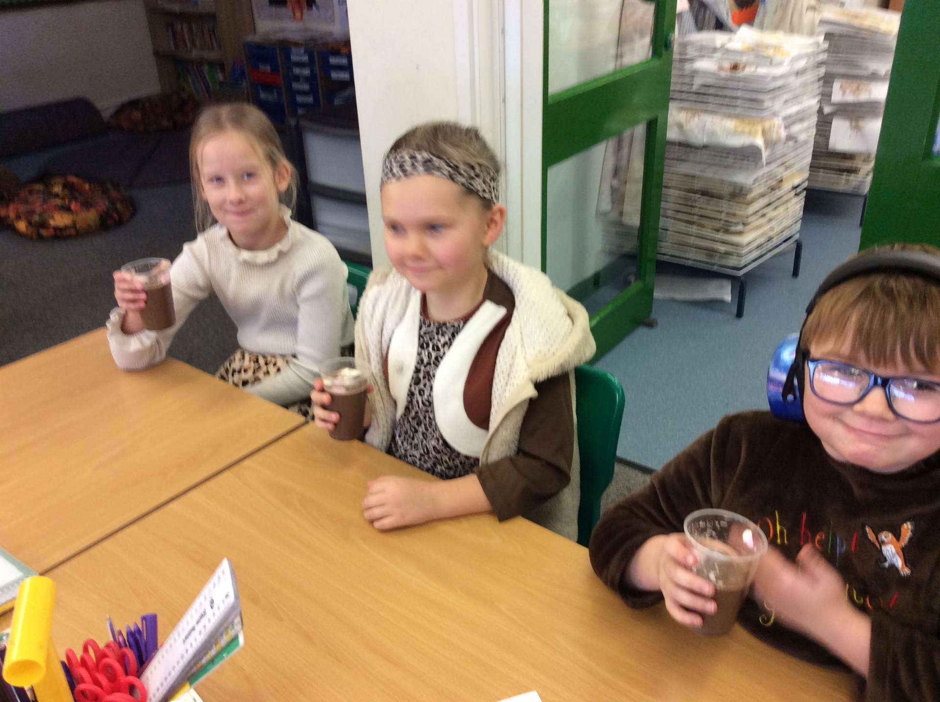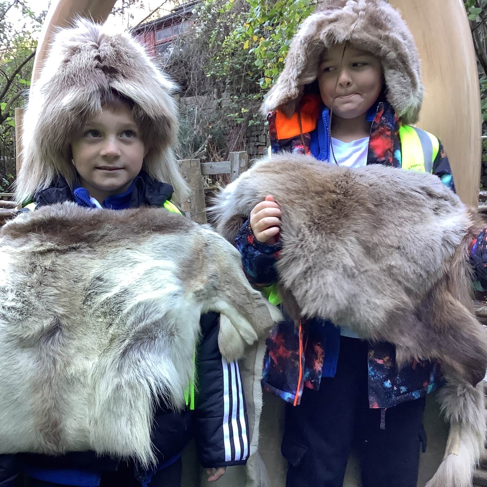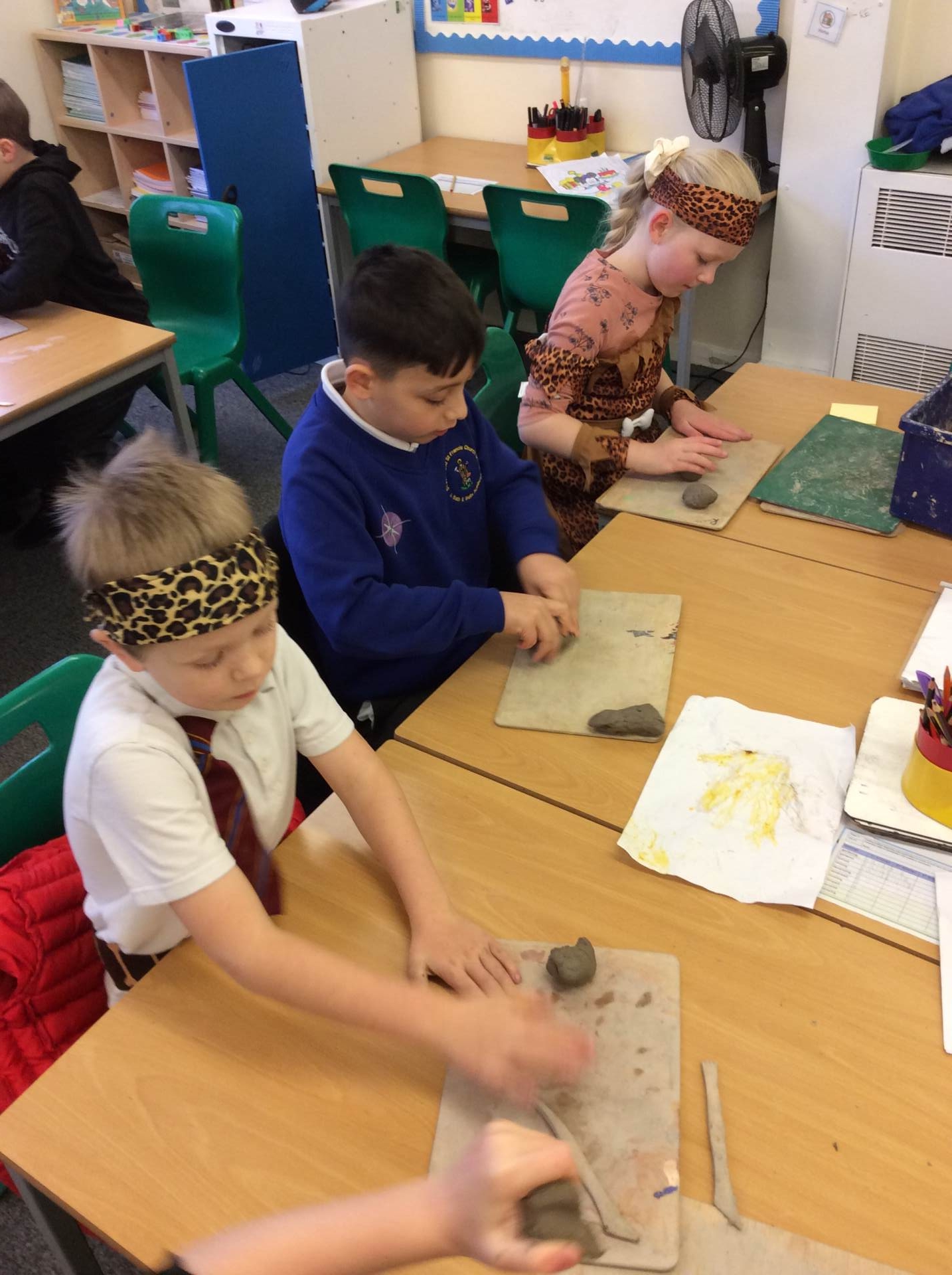 Today we spent the day as Stone Age people dressed in costume and experiencing life like they would have done 3 million years ago. In the morning, we used natural materials to create paintings, made sparks for a fire using flint stones and crafted clay pots. Because it was so cold outside, we had to have hot chocolate and marshmallows to warm us up when we came back inside! During the afternoon, we pretended we were inside a cave by going under the tables and drawing on the 'cave roof', we also made a fruit stew-it tasted delicious. Next week, we will be writing the instructions for how to make fruit stew in our English lessons.