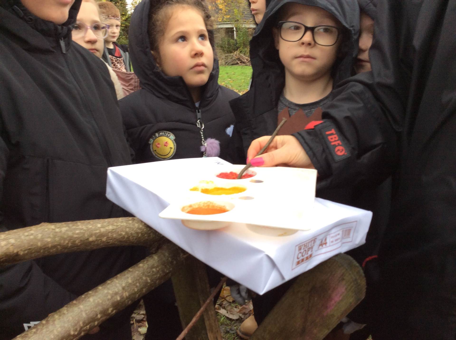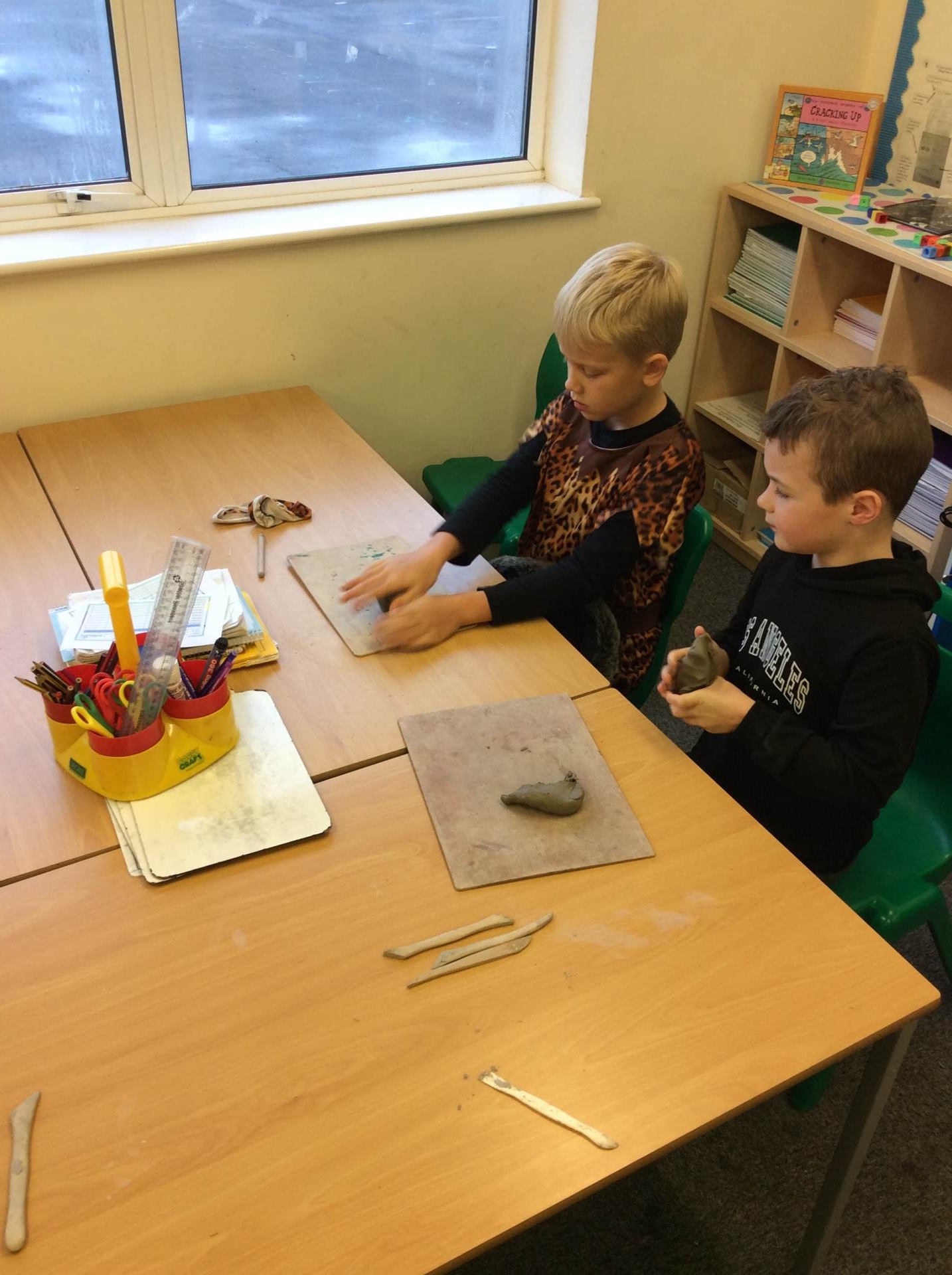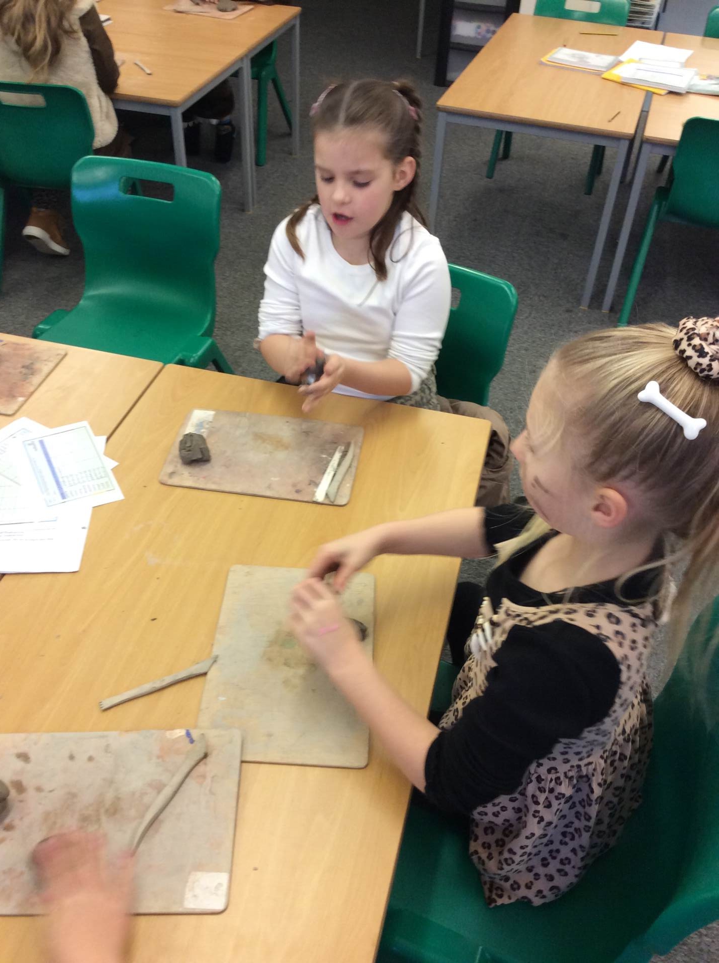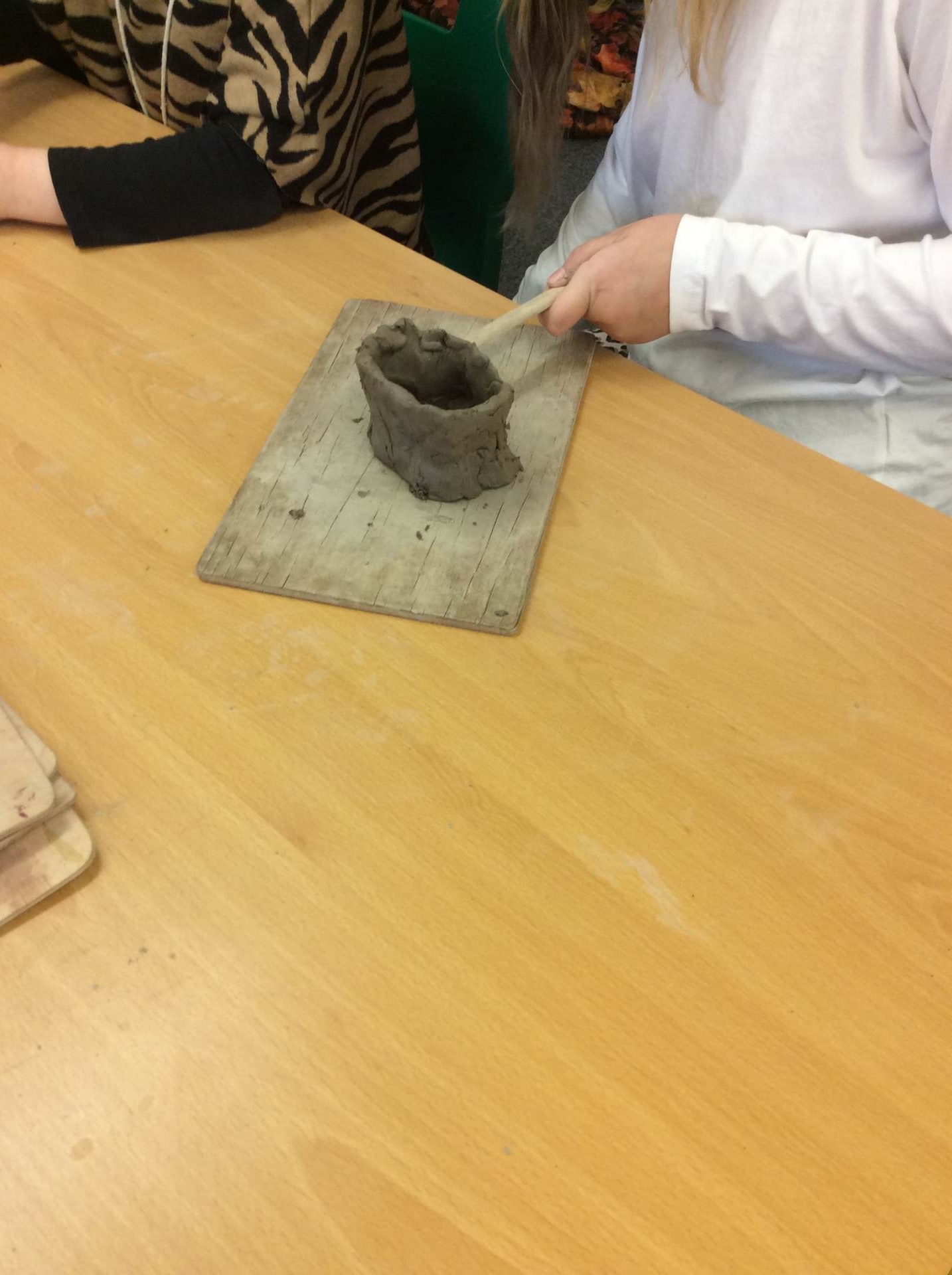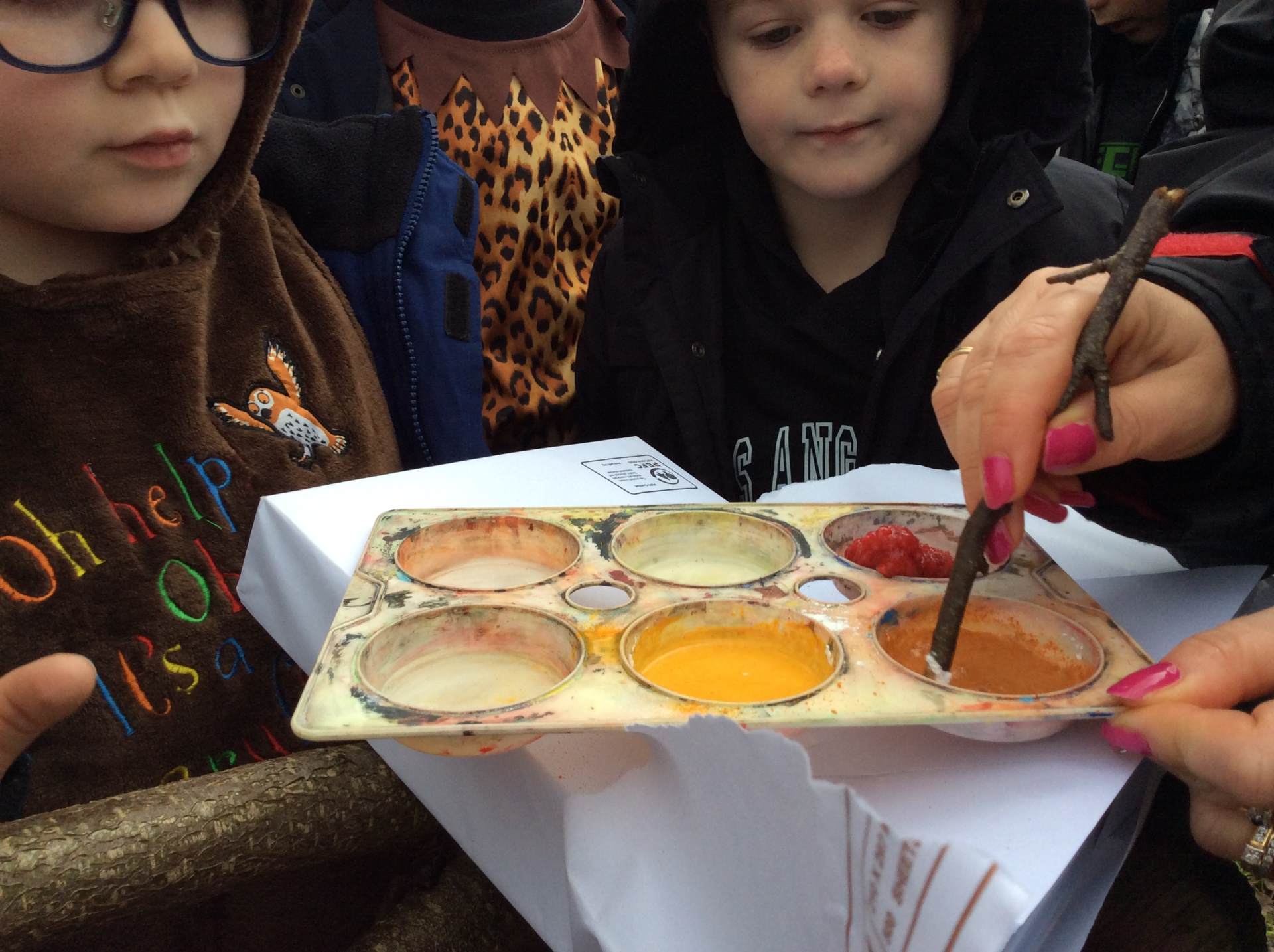 Today we spent the day as Stone Age people dressed in costume and experiencing life like they would have done 3 million years ago. In the morning, we used natural materials to create paintings, made sparks for a fire using flint stones and crafted clay pots. Because it was so cold outside, we had to have hot chocolate and marshmallows to warm us up when we came back inside! During the afternoon, we pretended we were inside a cave by going under the tables and drawing on the 'cave roof', we also made a fruit stew-it tasted delicious. Next week, we will be writing the instructions for how to make fruit stew in our English lessons.