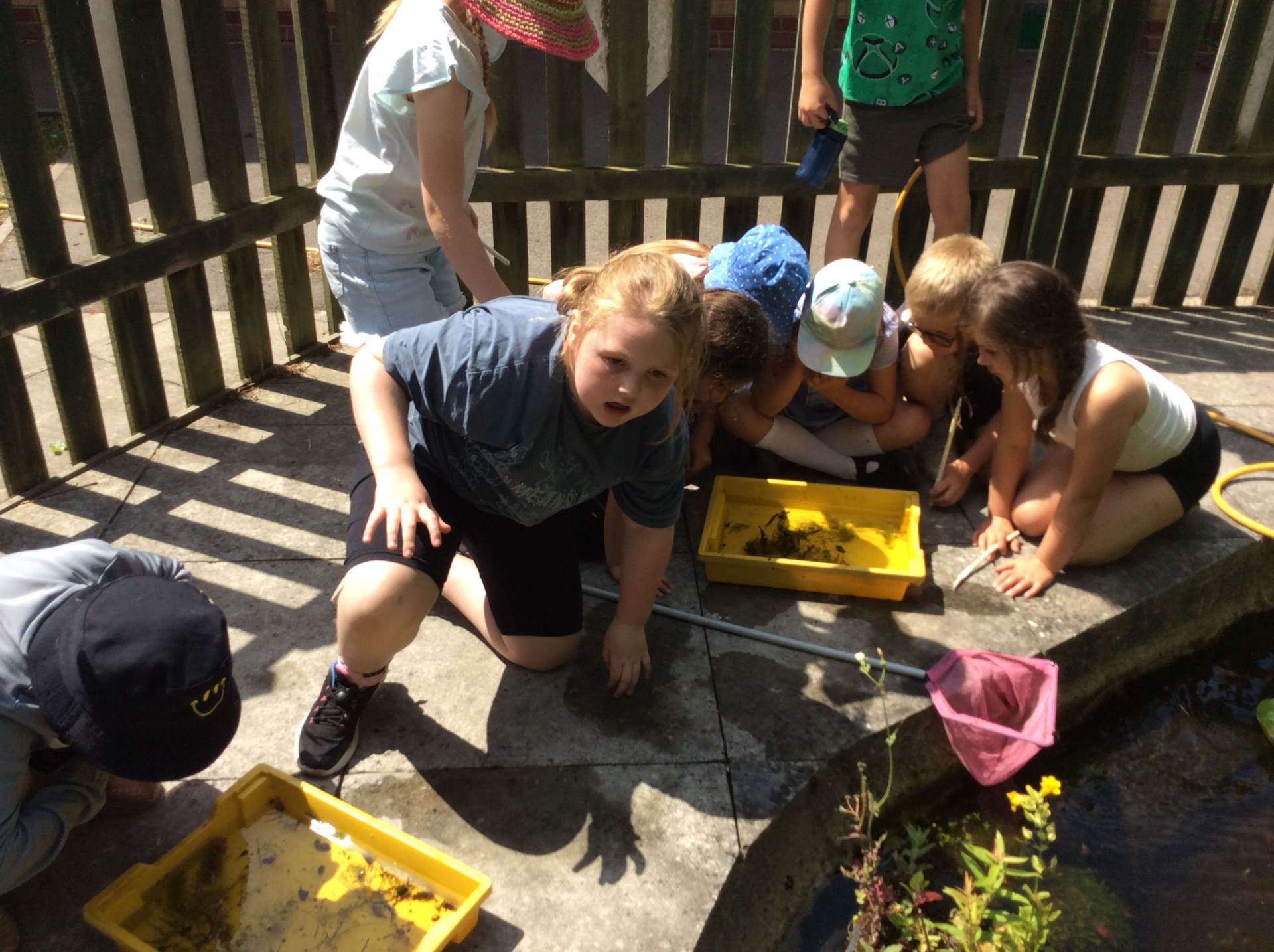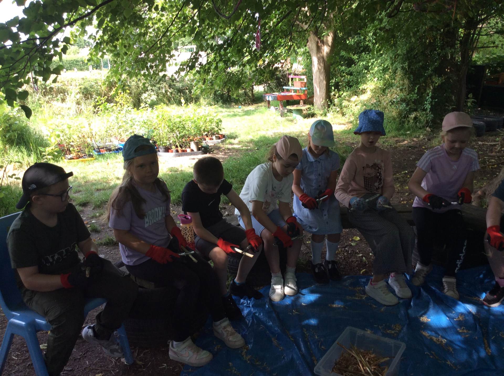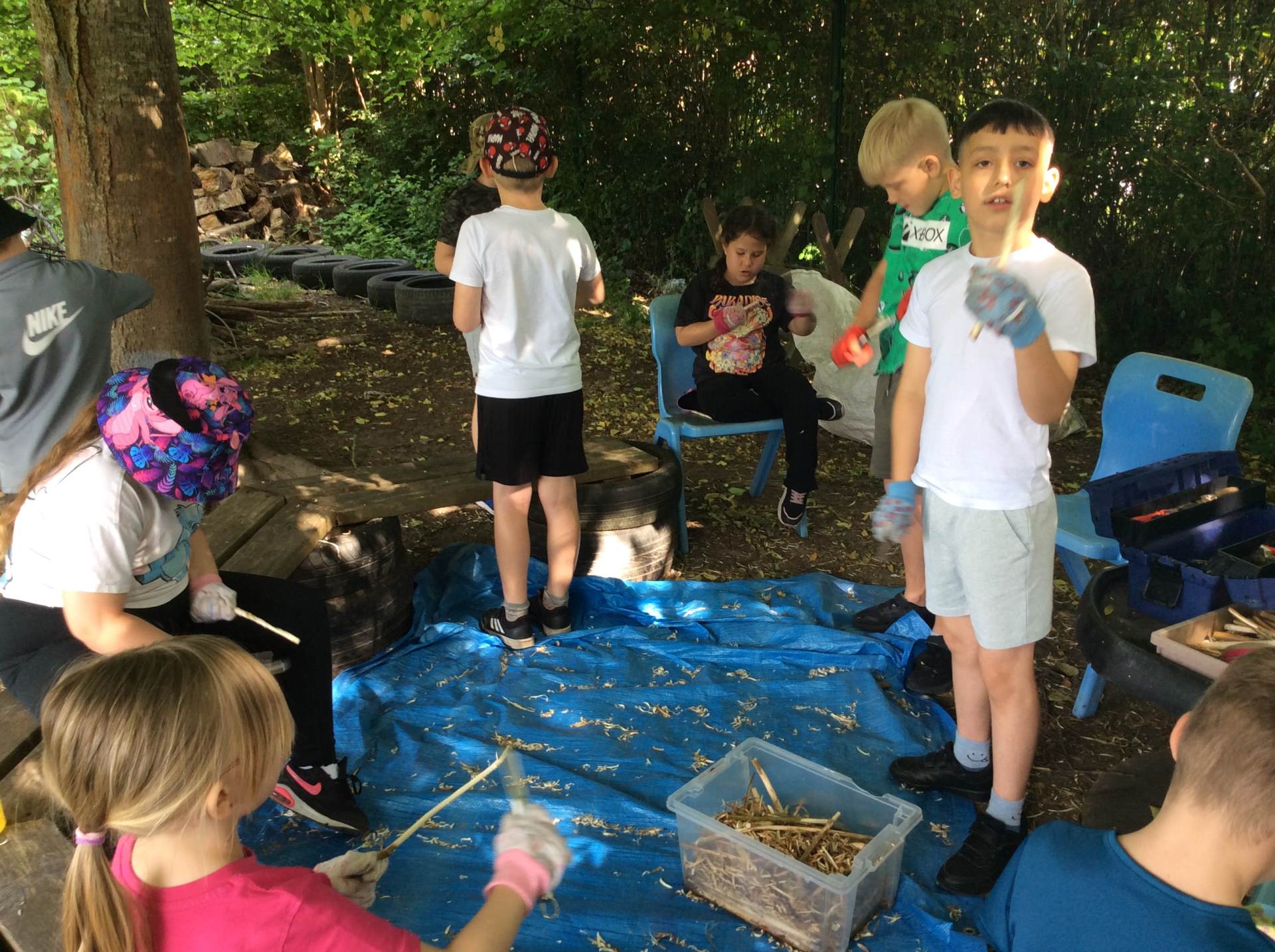 Everyone had a great morning in the sun today with Mrs Nurcombe our Forest School Leader. We spent our time whitling sticks to make wands, creating shelters for minibeasts and designing Mandela art patterns in natural objects. We then went into the sensory garden and did some pond dipping where we discovered tadpoles, water beetles and water snails.