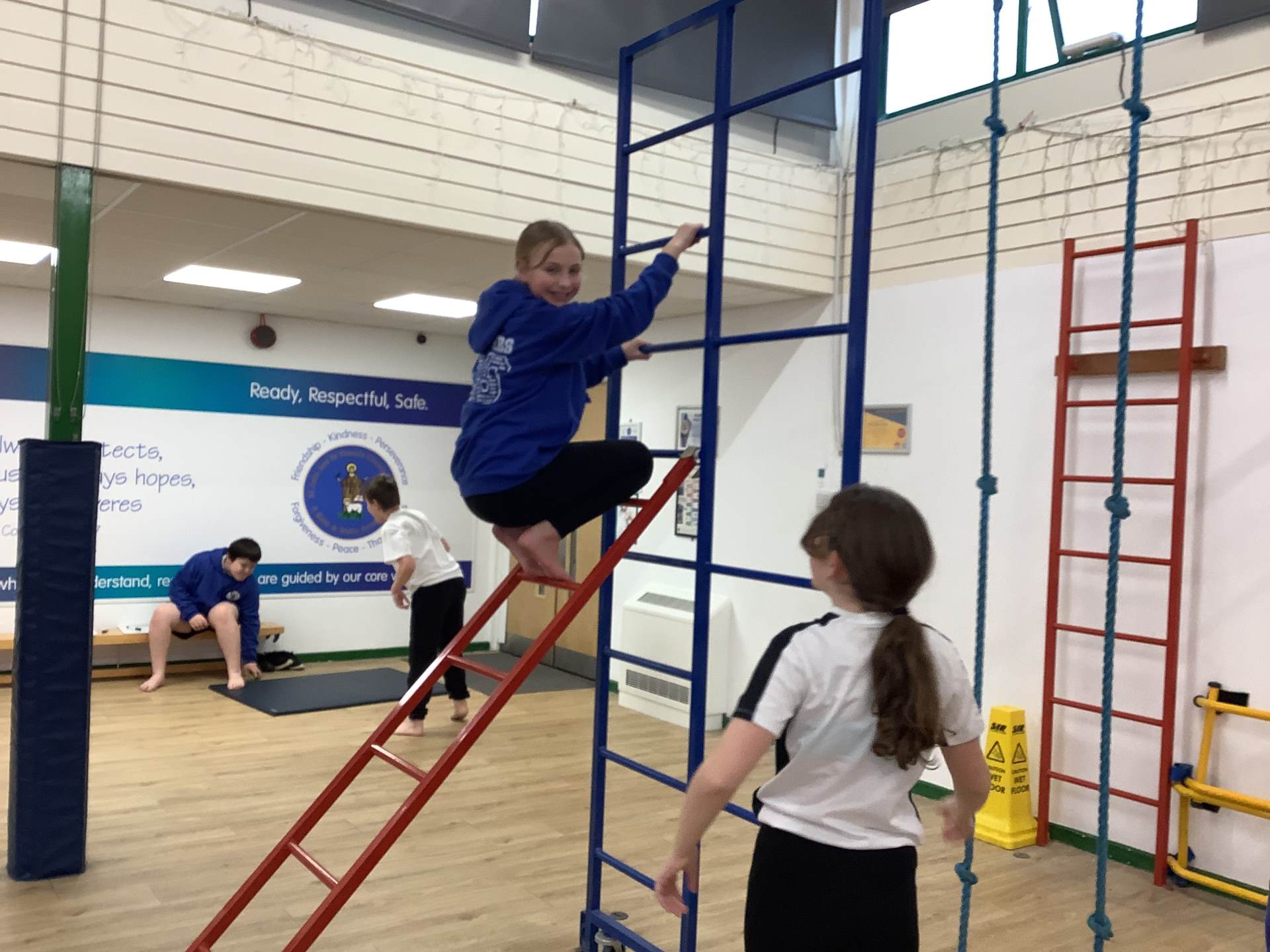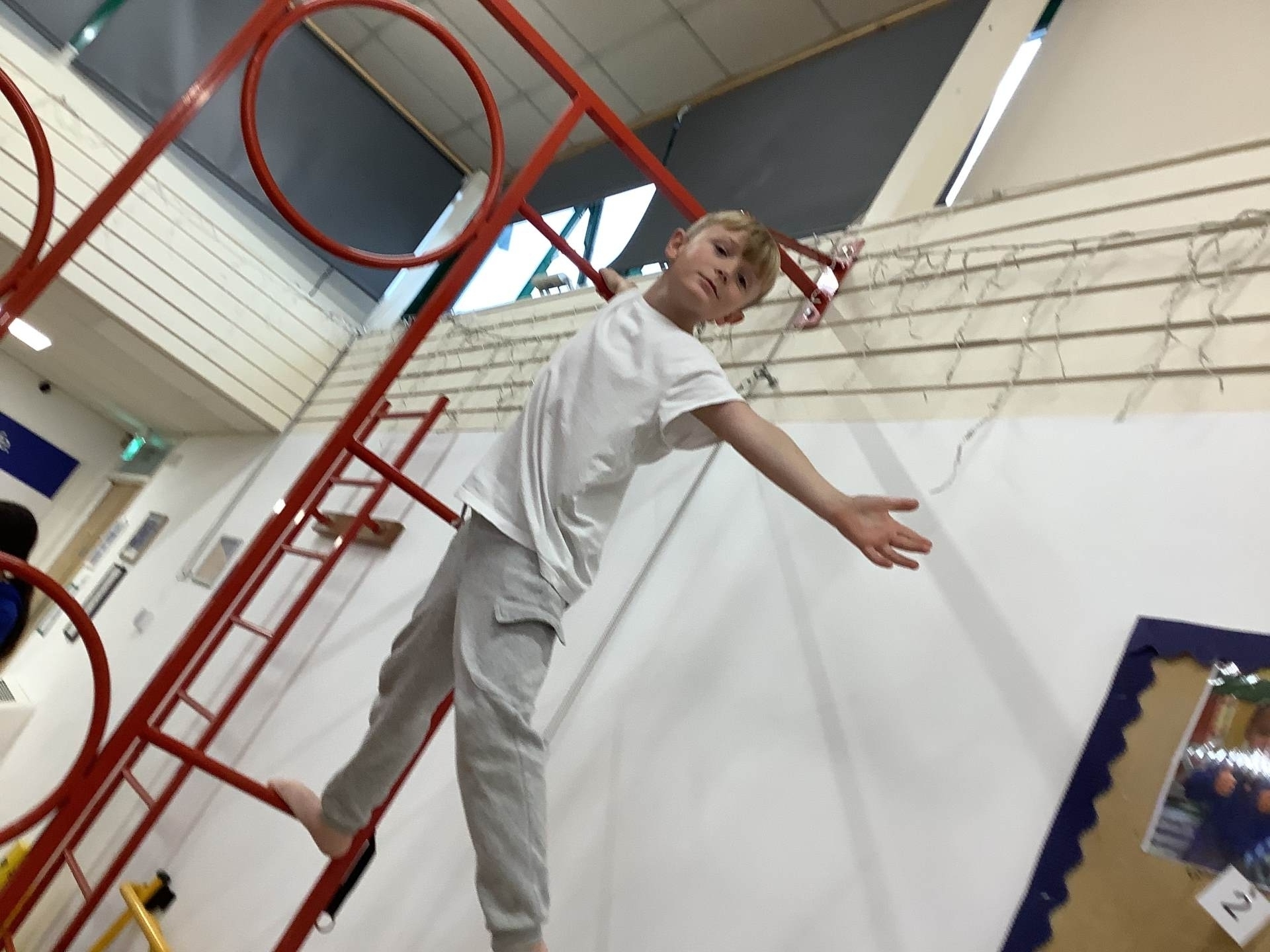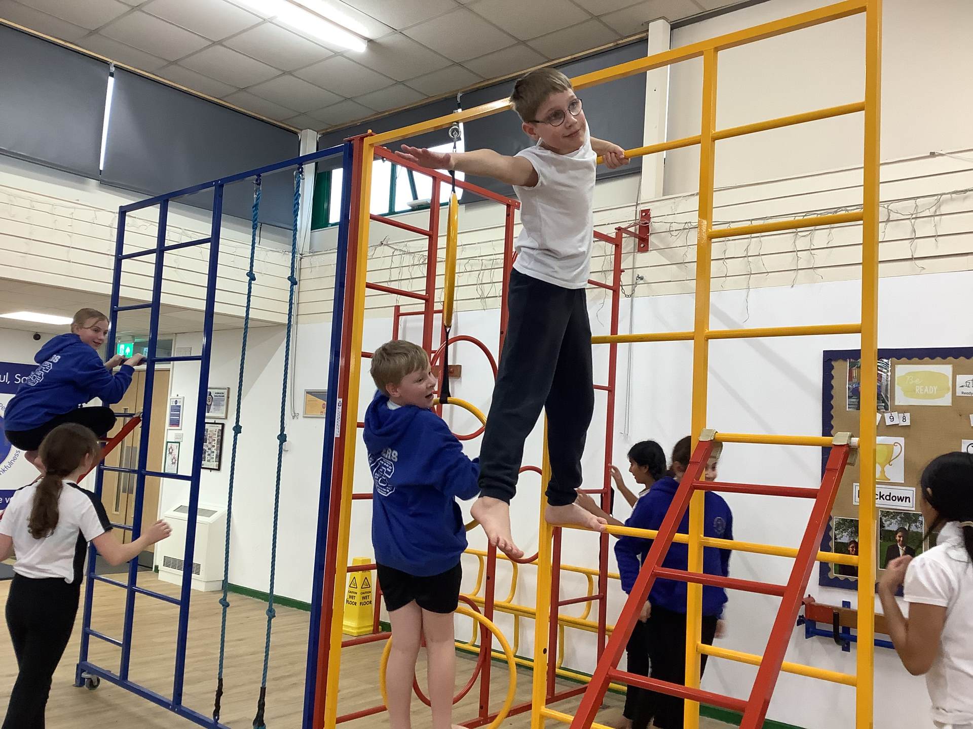 Activity one: children using the climbing frame to perform their five shapes (tuck, pike, straddle, straight, start) in balances and different methods of flight through and on the equipment.