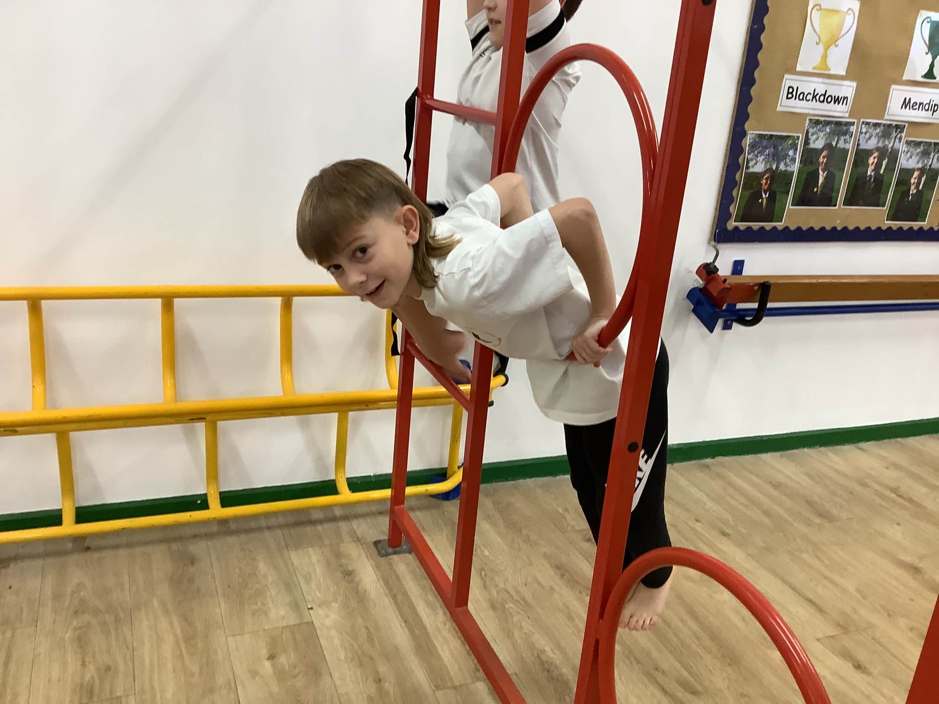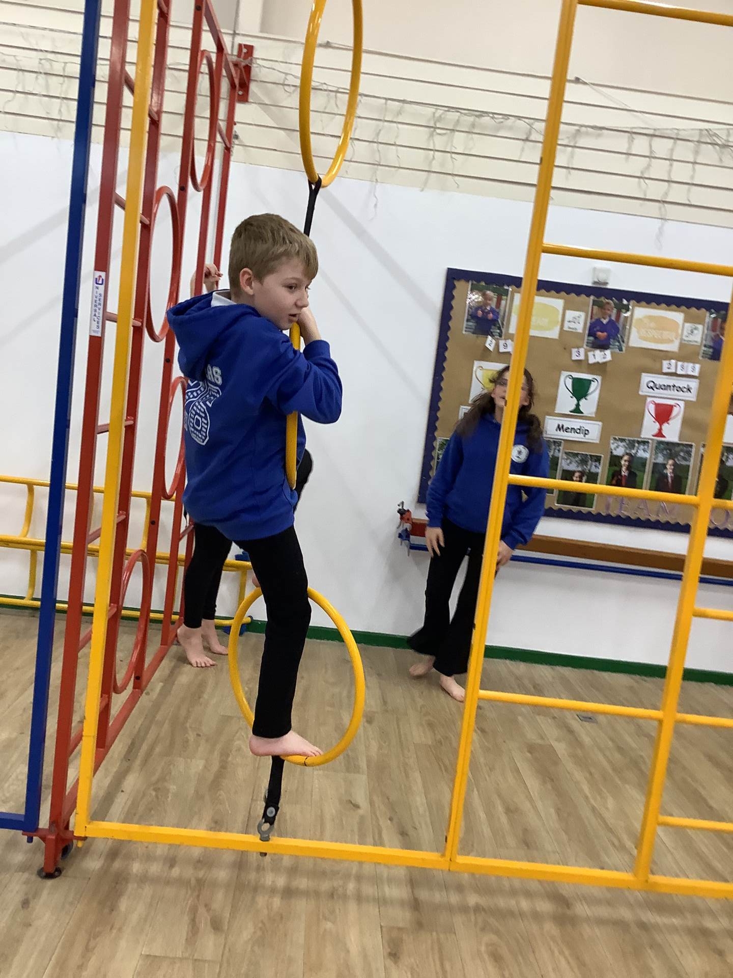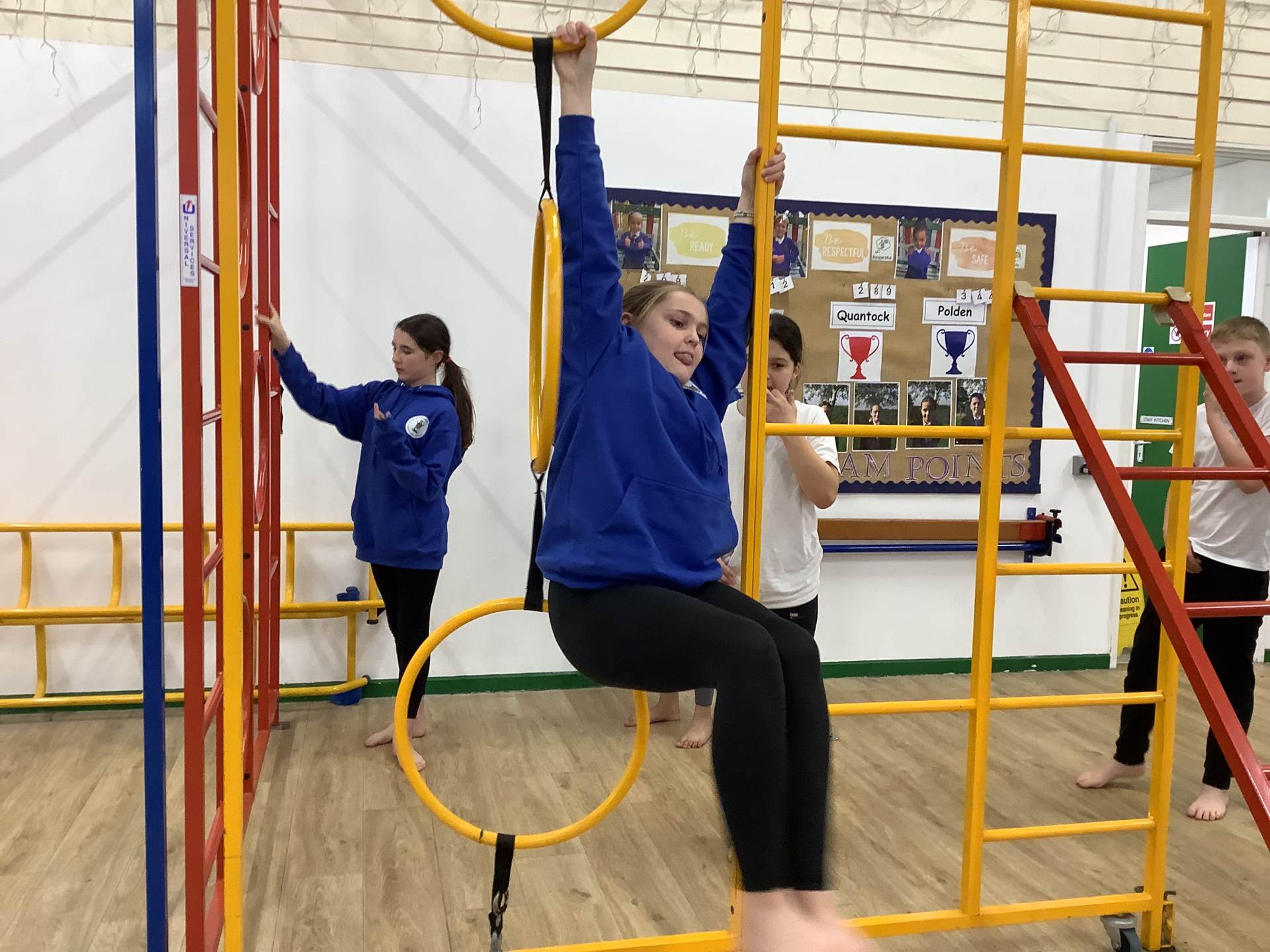 Activity one: children using the climbing frame to perform their five shapes (tuck, pike, straddle, straight, start) in balances and different methods of flight through and on the equipment.