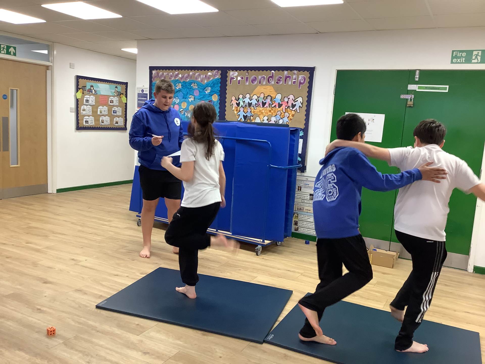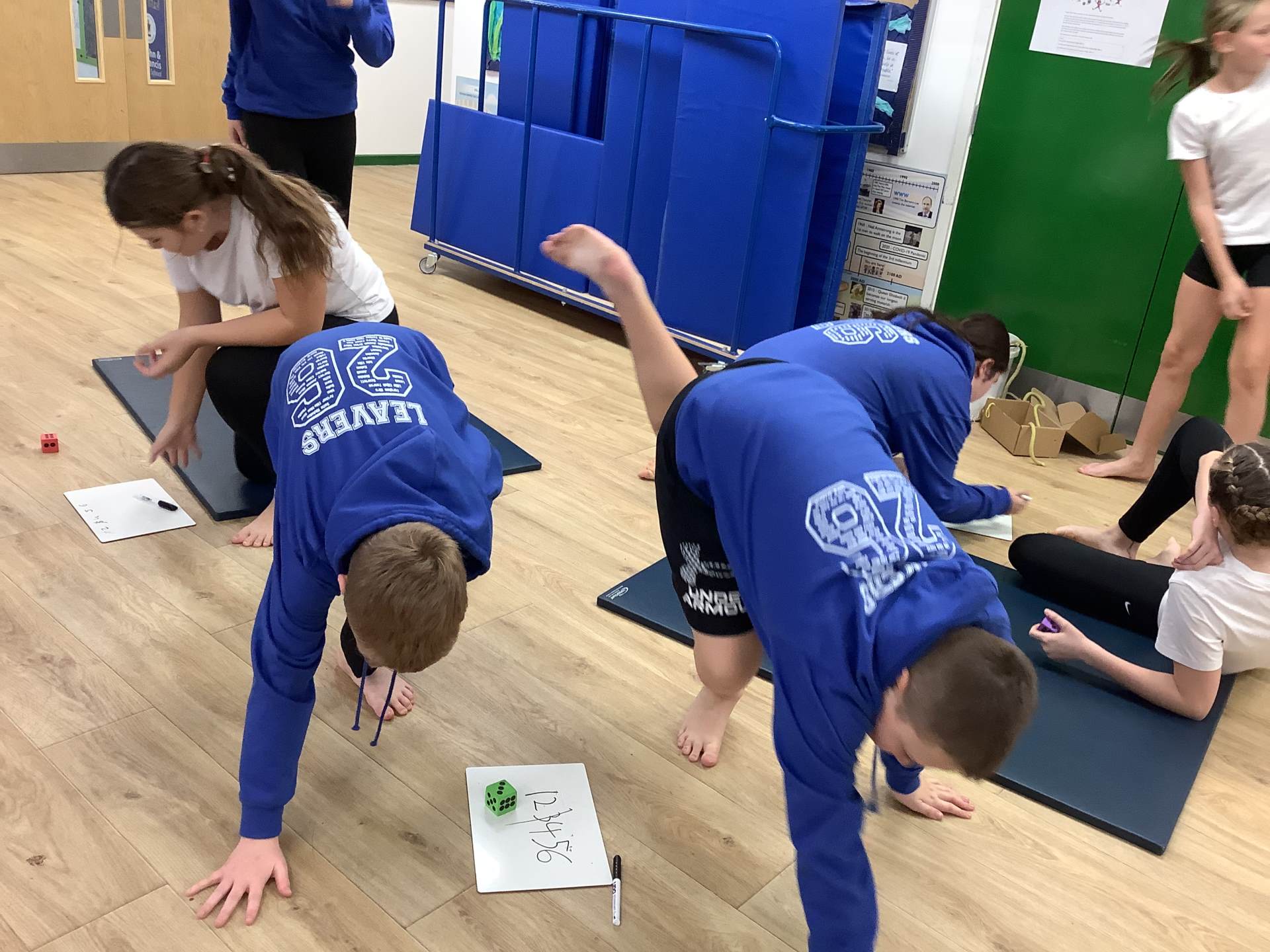 Activity two: 'Dice frenzy' - children worked in pairs to roll a dice and complete jumps equally to the number on their dice. For example, if they rolled a '5', they could have performed five hops or their first jump with two points of contact, second with two points of contact and third with one point of contact.