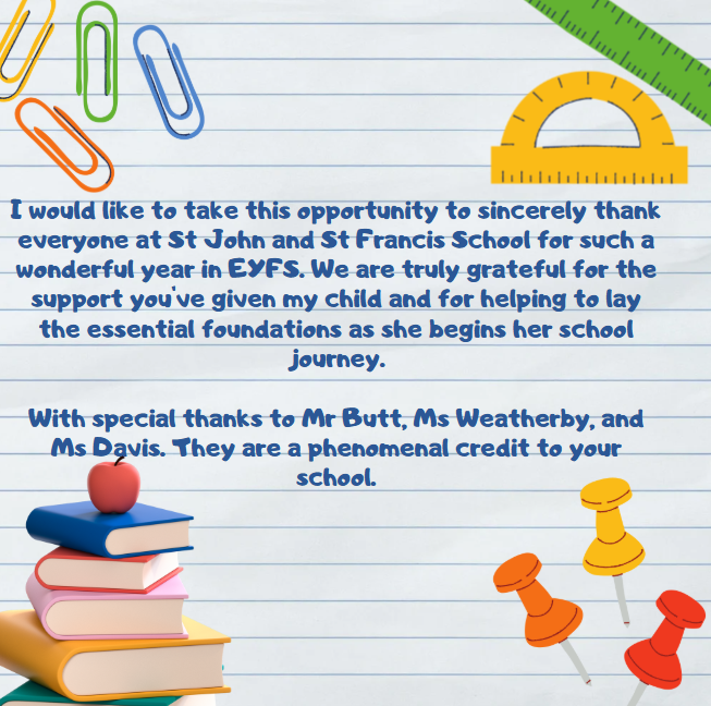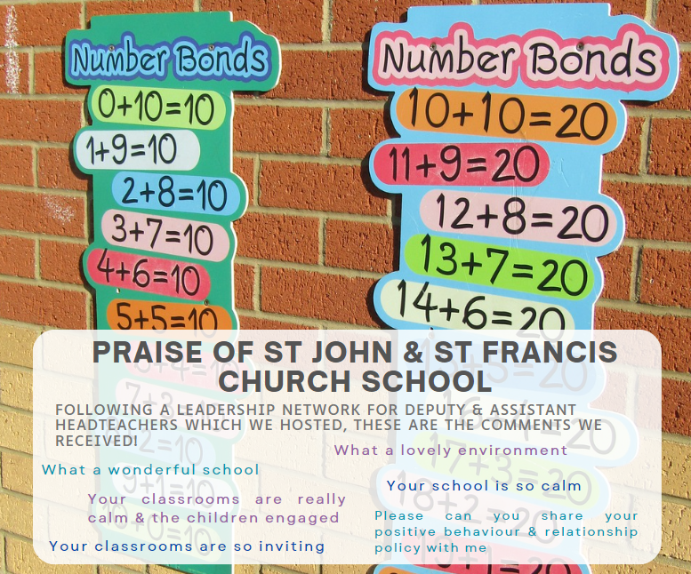 It was a delight to visit and spend a large part of the school day with you all at St John and St Francis.As I said in my feedback, the school feels a warm, focused and purposeful environment and it was an absolute pleasure to have the opportunity to spend time within classes.Please pass on my thanks and warmest wishes to all the staff and children for their engagement. Their hard work, joy and dedication was very evident in the conversations I had over the day