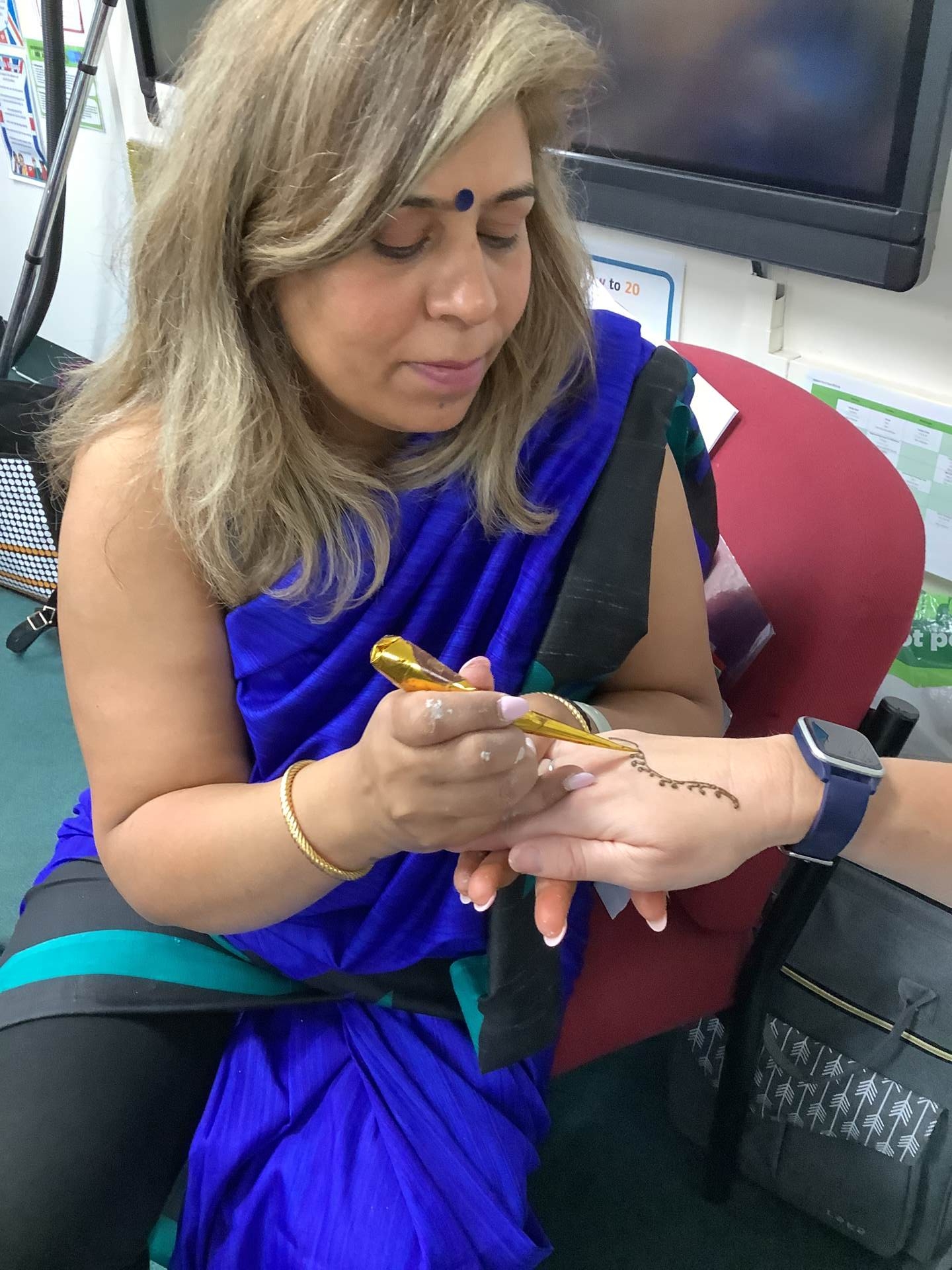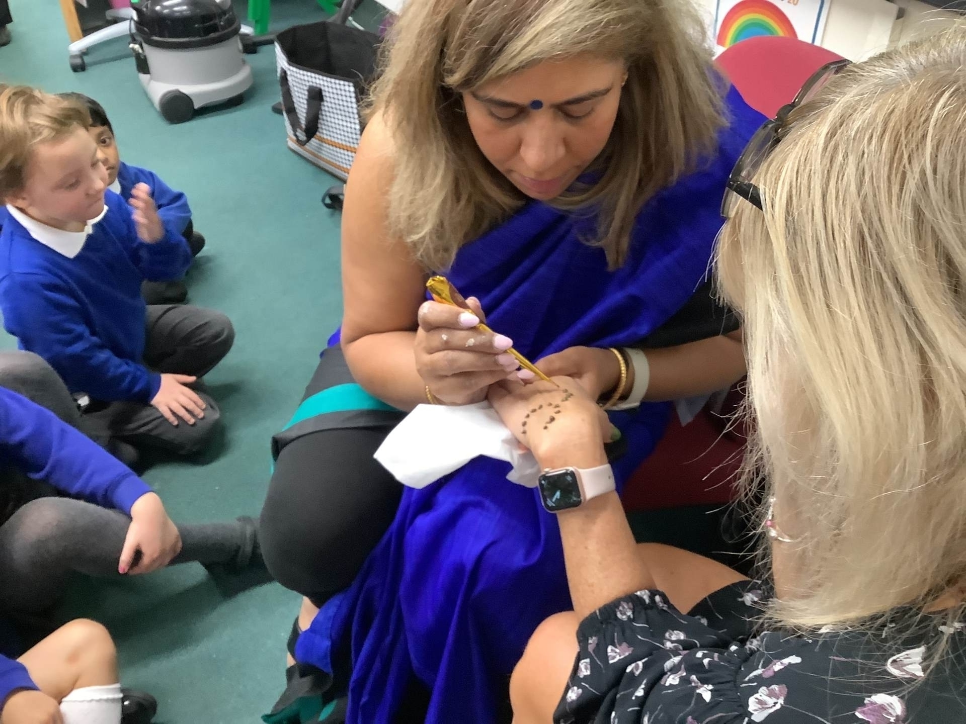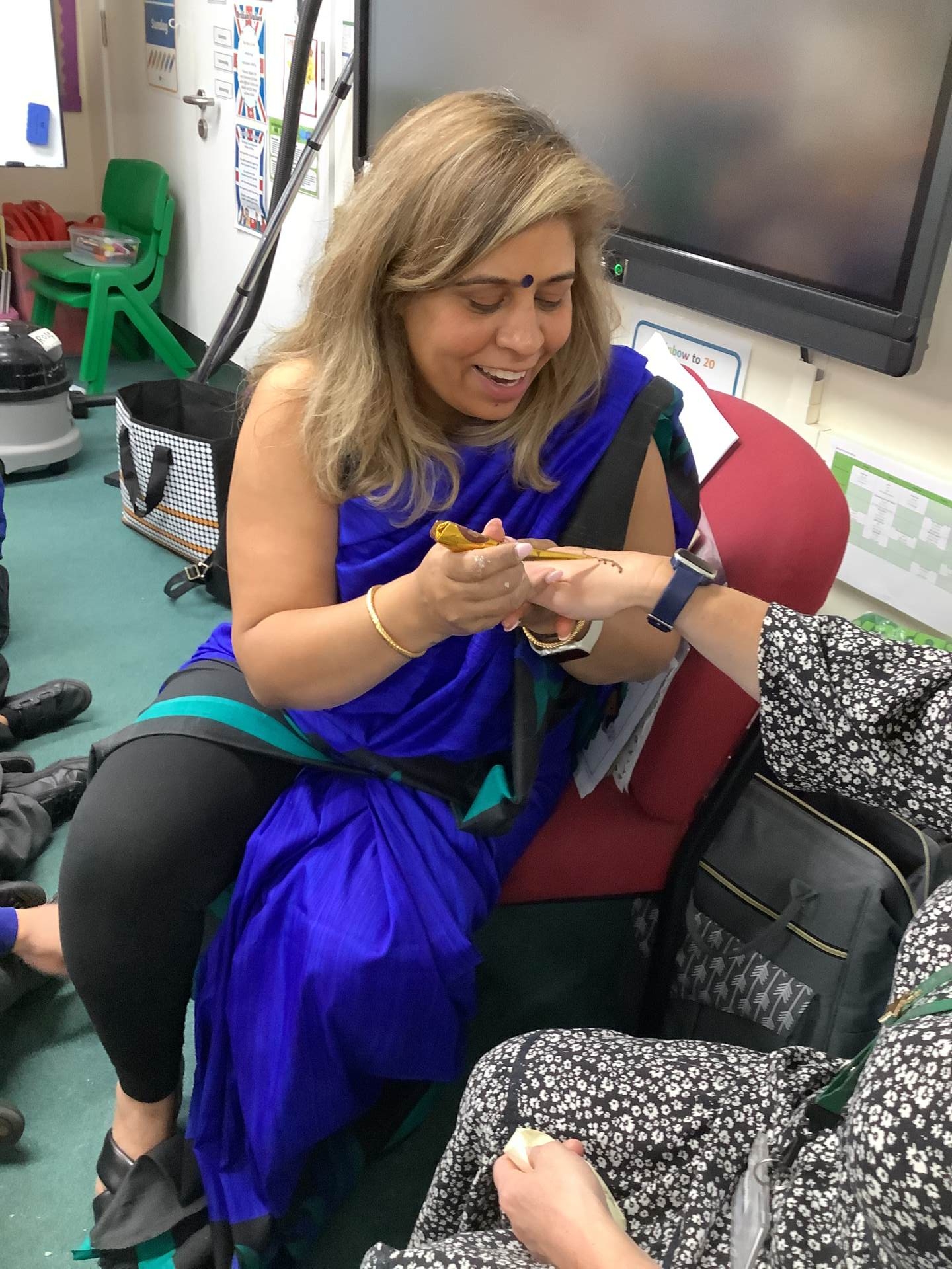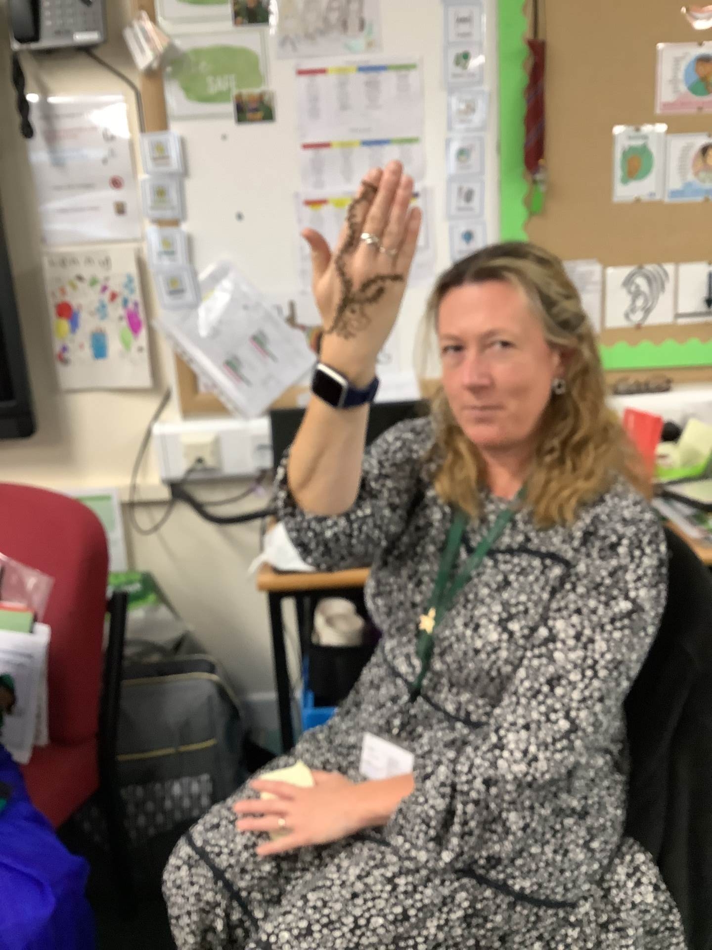 We learnt lots from her fantastic visit. We discovered that it is celebrated a little bit like Christmas where they have a lovely family meal, dress in their best clothes ( Mrs Malhi's dress looked very different to the clothes that we wear), they share sweets and gifts, they decorate their homes and even have fireworks. We were very lucky as we got to make our own Diva lamps to take home. We then created some of our own pictures and patterns using some Rangoli powder and Mrs Edwards and Mrs Leach even had a Mendi pattern drawn on their hands. Mrs Malhi even gave us some sweet treats and the staff some freshly backed spring rolls and samosas which tasted delicious.