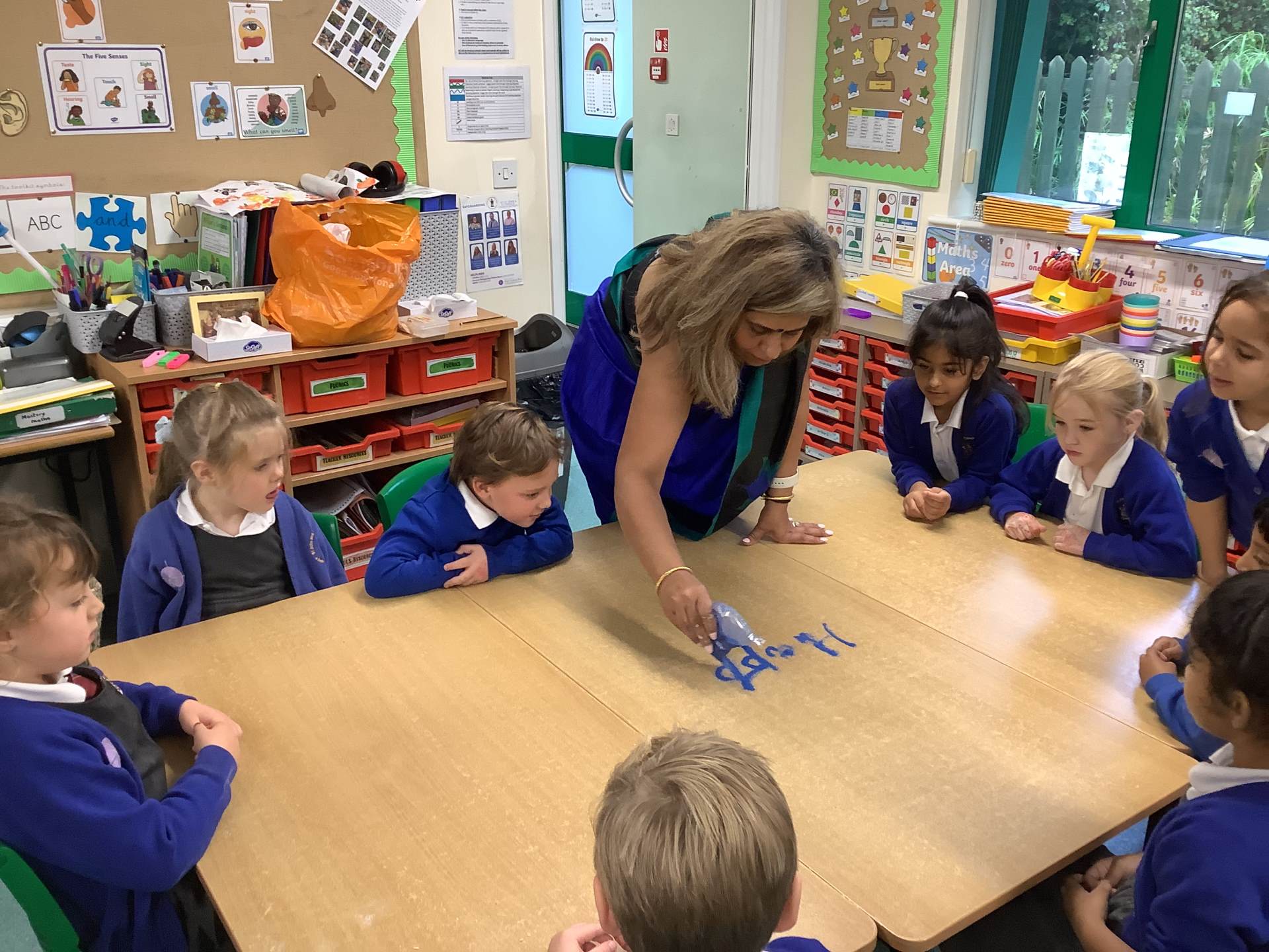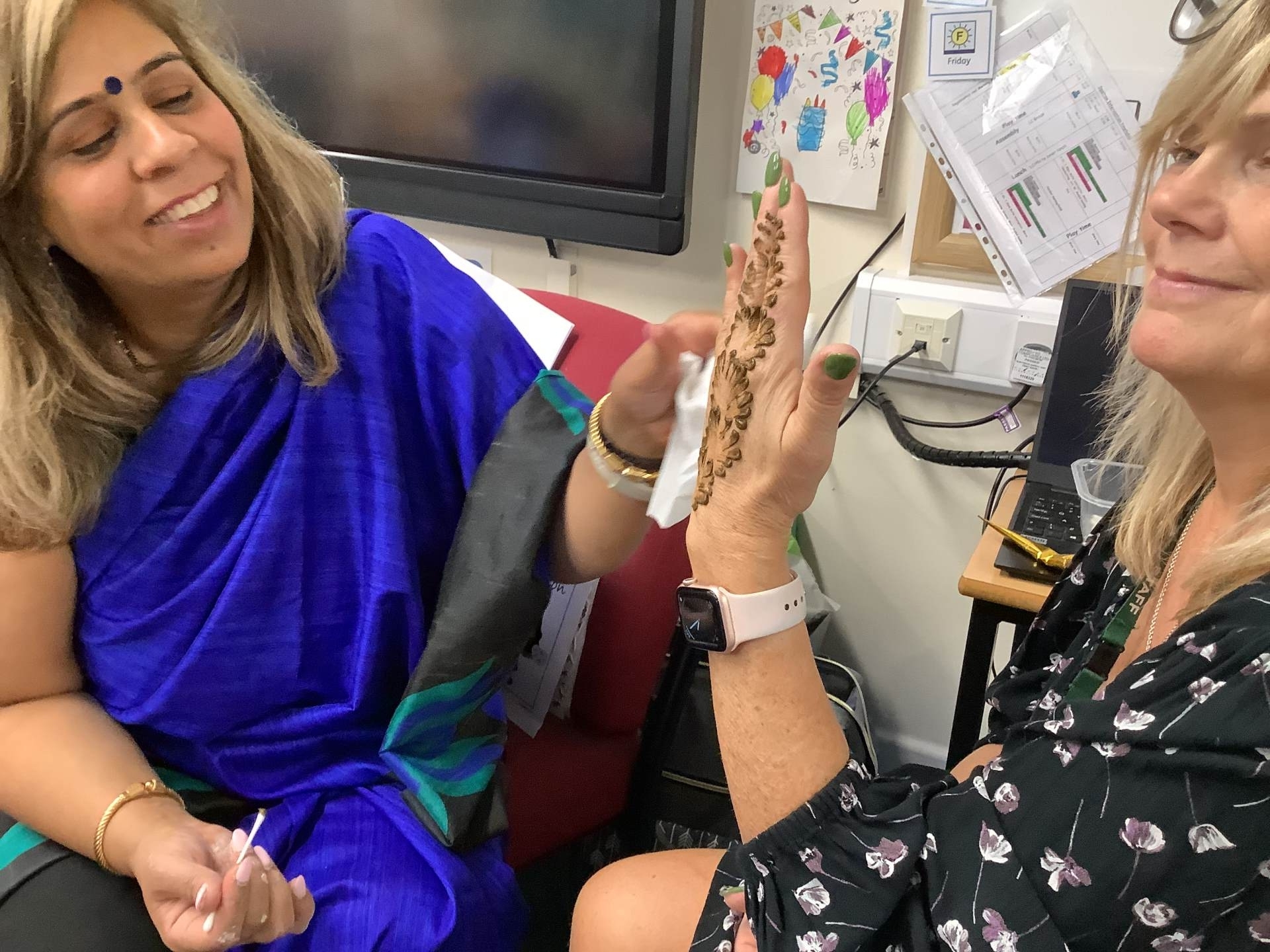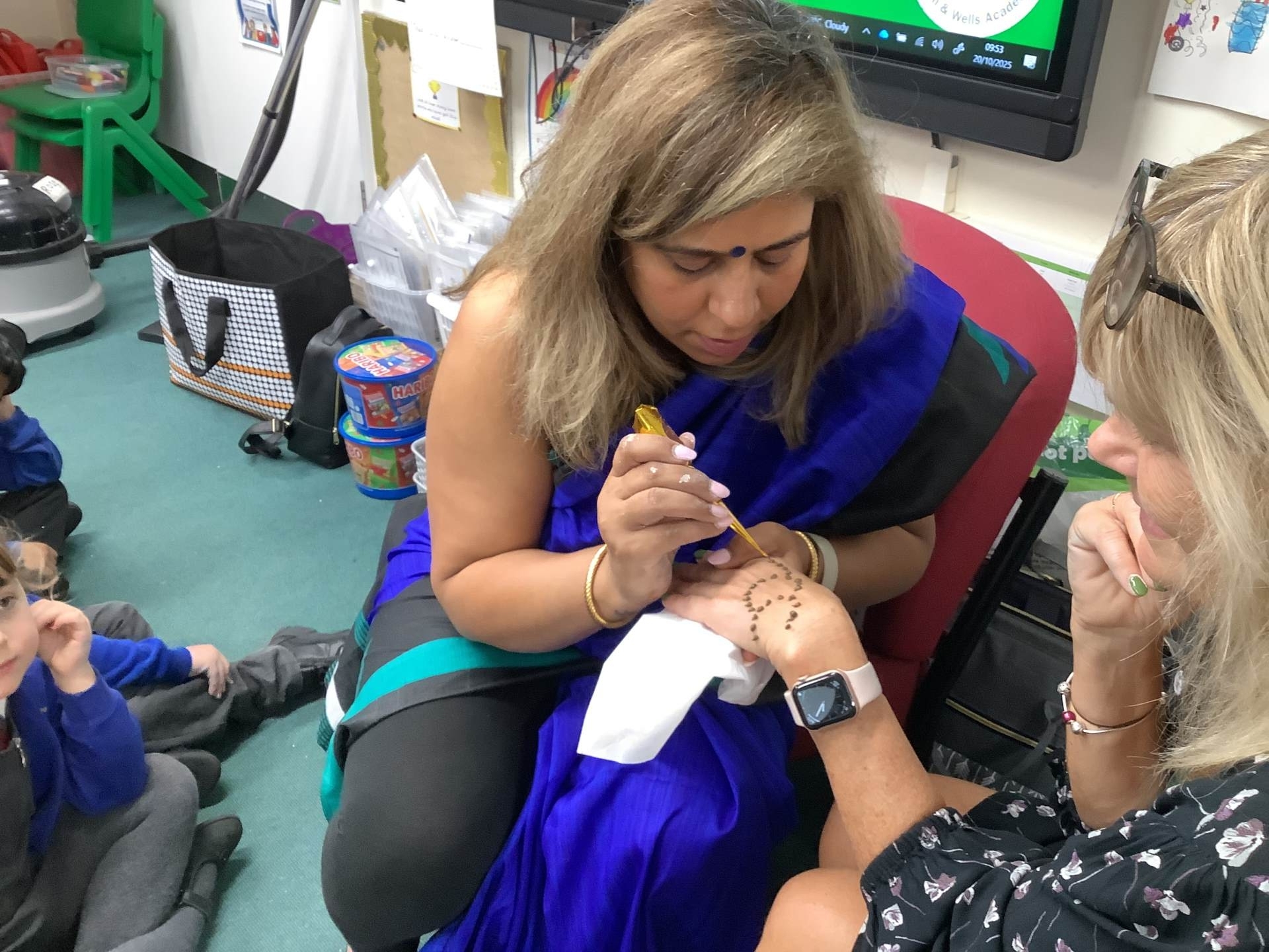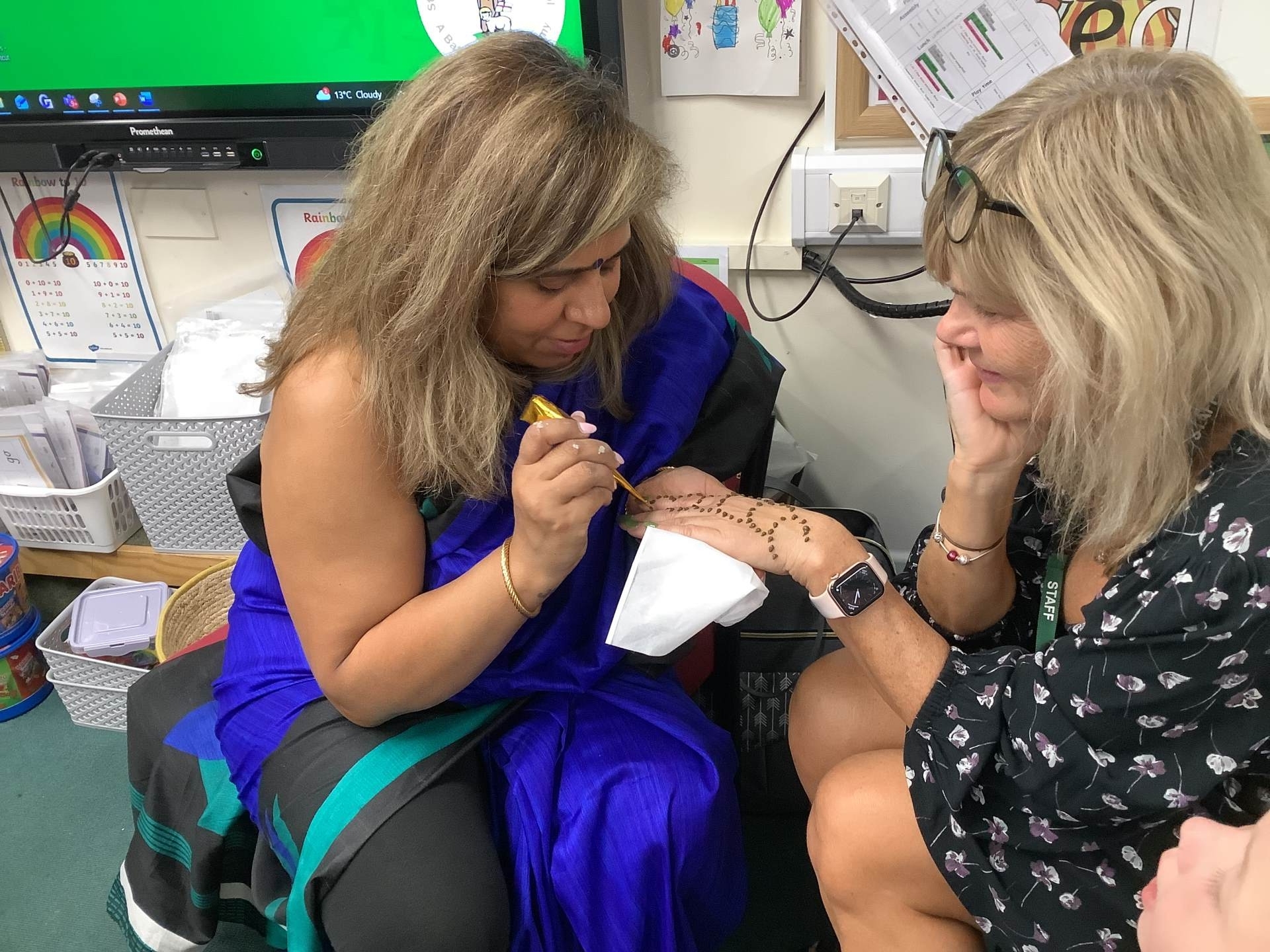 We learnt lots from her fantastic visit. We discovered that it is celebrated a little bit like Christmas where they have a lovely family meal, dress in their best clothes ( Mrs Malhi's dress looked very different to the clothes that we wear), they share sweets and gifts, they decorate their homes and even have fireworks. We were very lucky as we got to make our own Diva lamps to take home. We then created some of our own pictures and patterns using some Rangoli powder and Mrs Edwards and Mrs Leach even had a Mendi pattern drawn on their hands. Mrs Malhi even gave us some sweet treats and the staff some freshly backed spring rolls and samosas which tasted delicious.