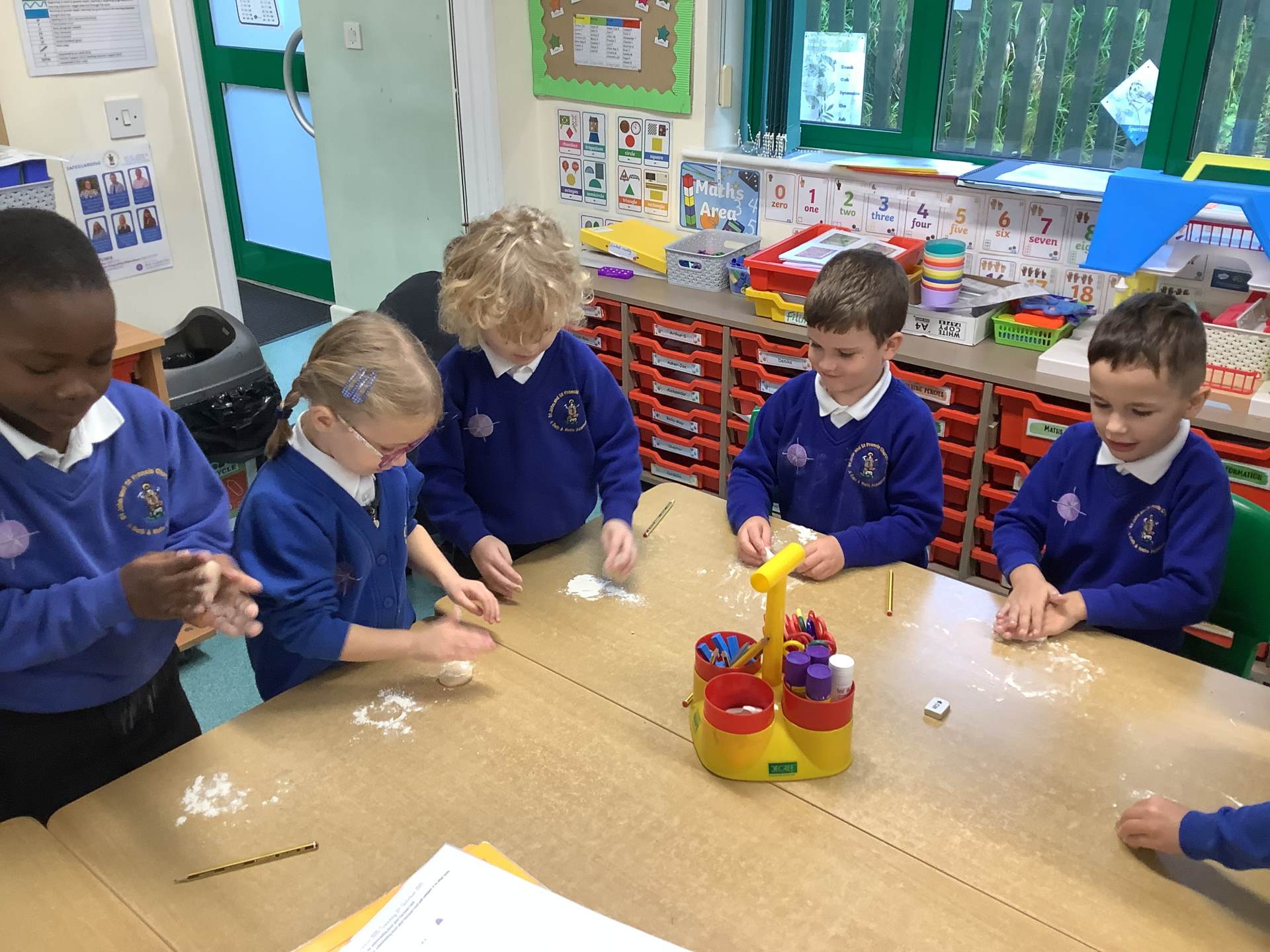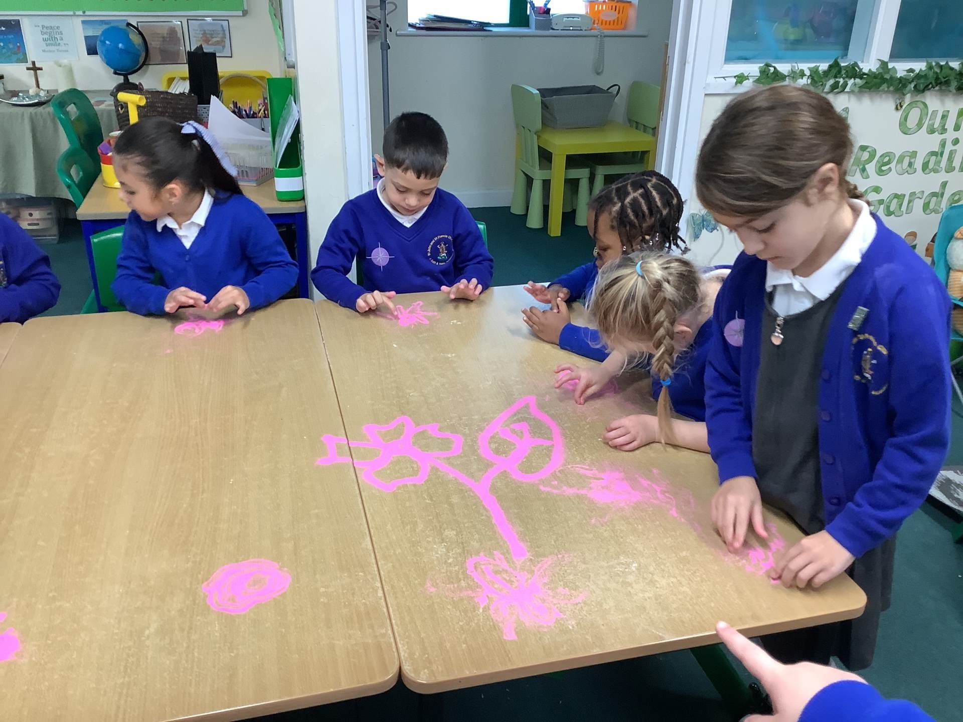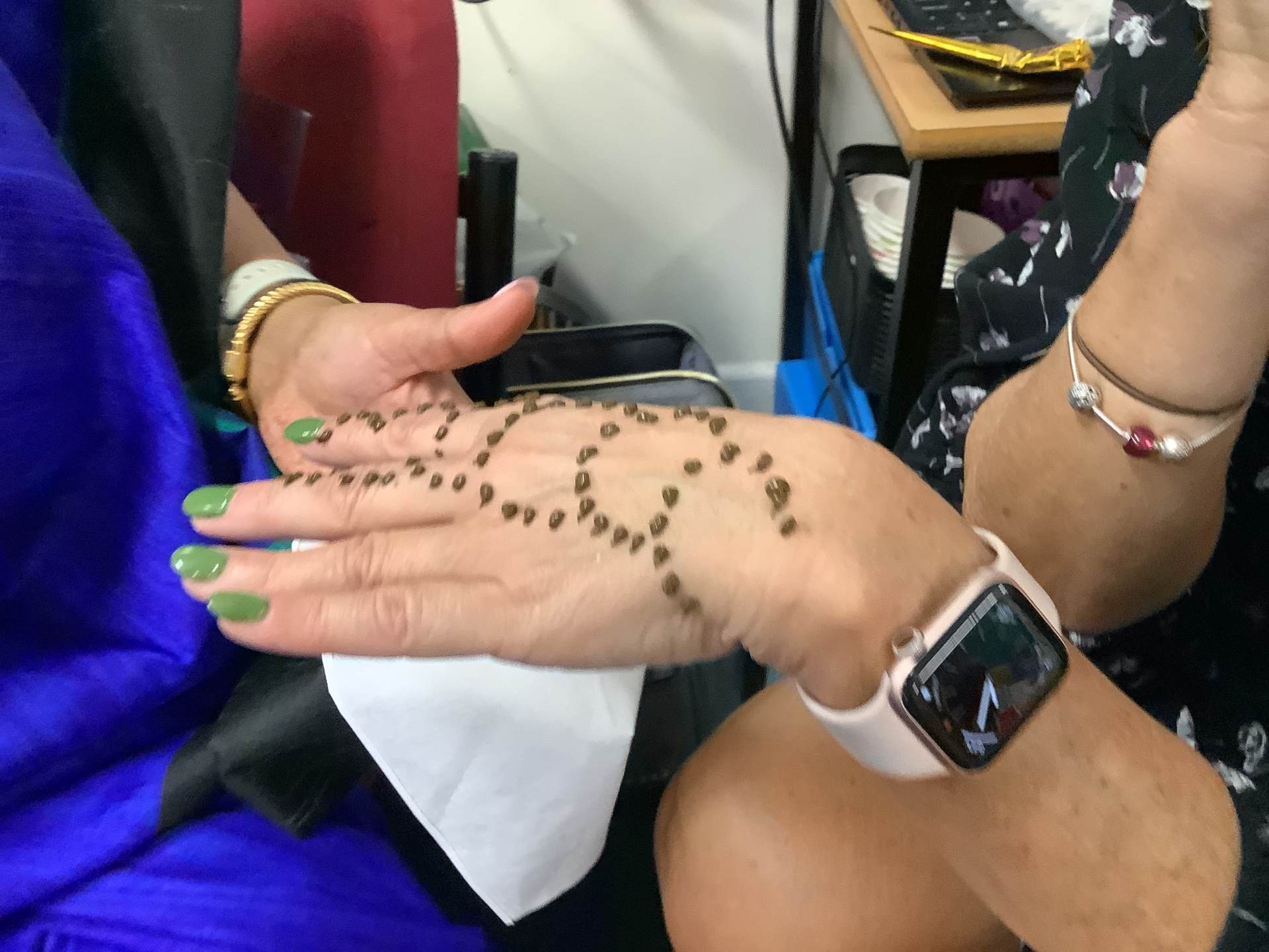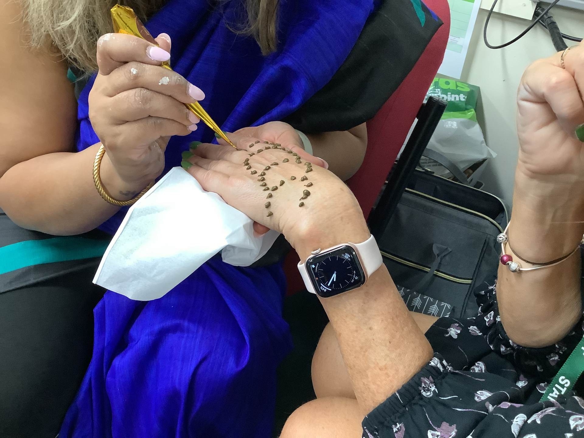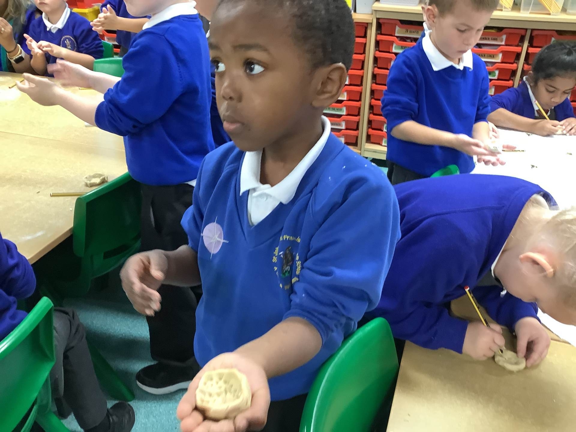 We learnt lots from her fantastic visit. We discovered that it is celebrated a little bit like Christmas where they have a lovely family meal, dress in their best clothes ( Mrs Malhi's dress looked very different to the clothes that we wear), they share sweets and gifts, they decorate their homes and even have fireworks. We were very lucky as we got to make our own Diva lamps to take home. We then created some of our own pictures and patterns using some Rangoli powder and Mrs Edwards and Mrs Leach even had a Mendi pattern drawn on their hands. Mrs Malhi even gave us some sweet treats and the staff some freshly backed spring rolls and samosas which tasted delicious.