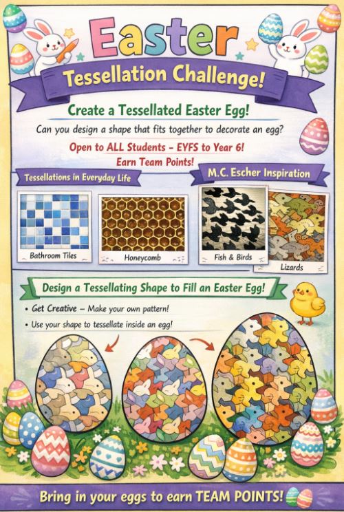 Children are encouraged to get creative by designing their own Easter egg using a tessellated pattern. This is a wonderful opportunity for pupils to explore shapes, patterns, and symmetry while showcasing their artistic flair.